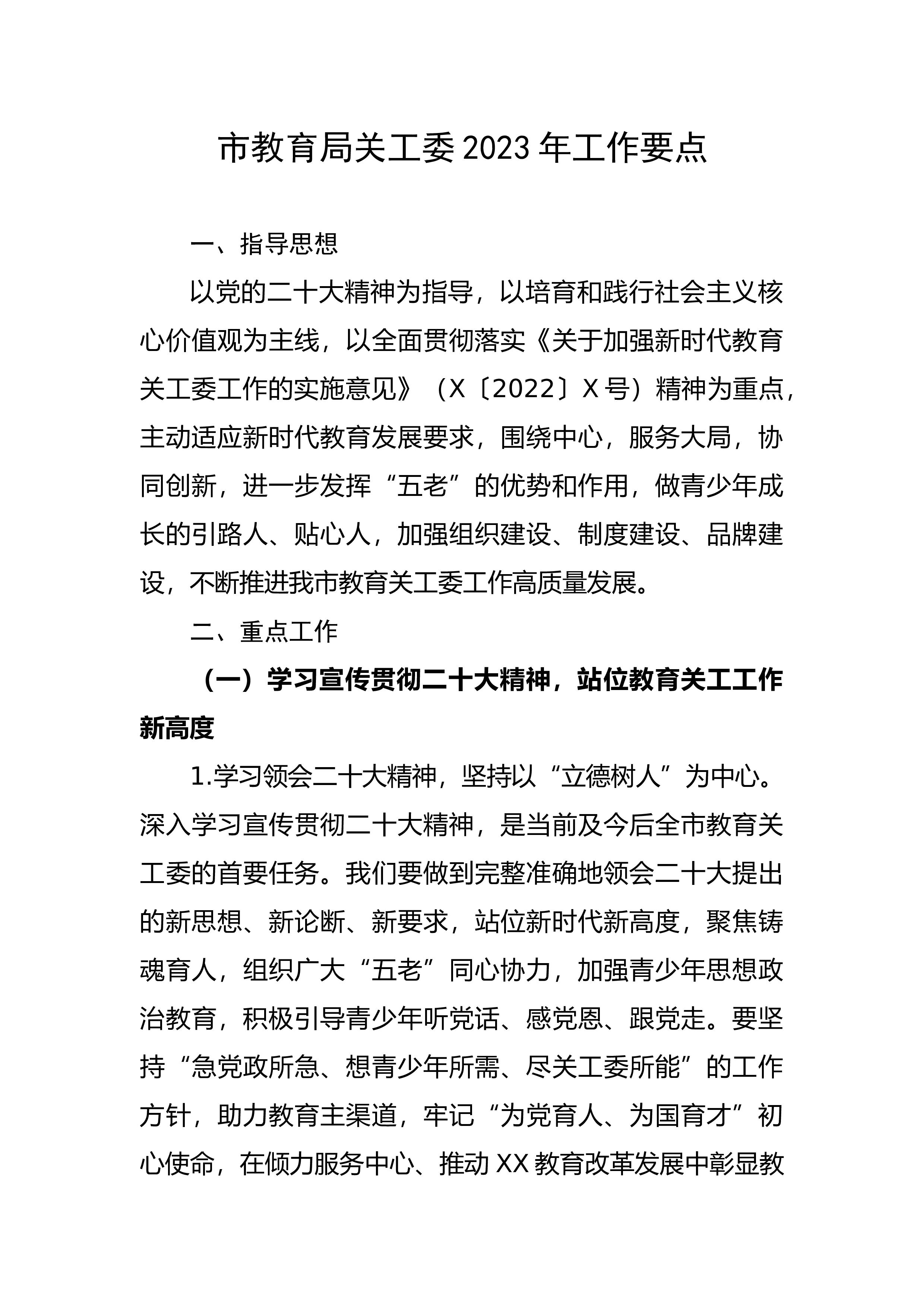 区2023年教育工作要点2023年是贯彻党的二十大精神的开局之年,也是“十四五”承上启下的关键之年。全区教育系统要以习近平新时代中国特色社会主义思想为指导,深入学习、全面贯彻党的二十大精神,以党的教育方针为指引,围绕立德树人根本任务,认真落实全国、省、市教育发展规划,聚焦区委区政府“五地四创”“鲲鹏迭变”决策部署,紧盯“两个走在前列”的教育高质量发展目标,准确把握新发展目标,牢固树立新发展理念,加快构建高质量教育体系,全面深化教育领域综合改革,积极打造“五育并举、公平优质、特色鲜明、引领未来”的新时代高品质**教育,努力与**经济社会高质量发展同频共振,为加快建设一流教育强区提供强有力支撑。一...