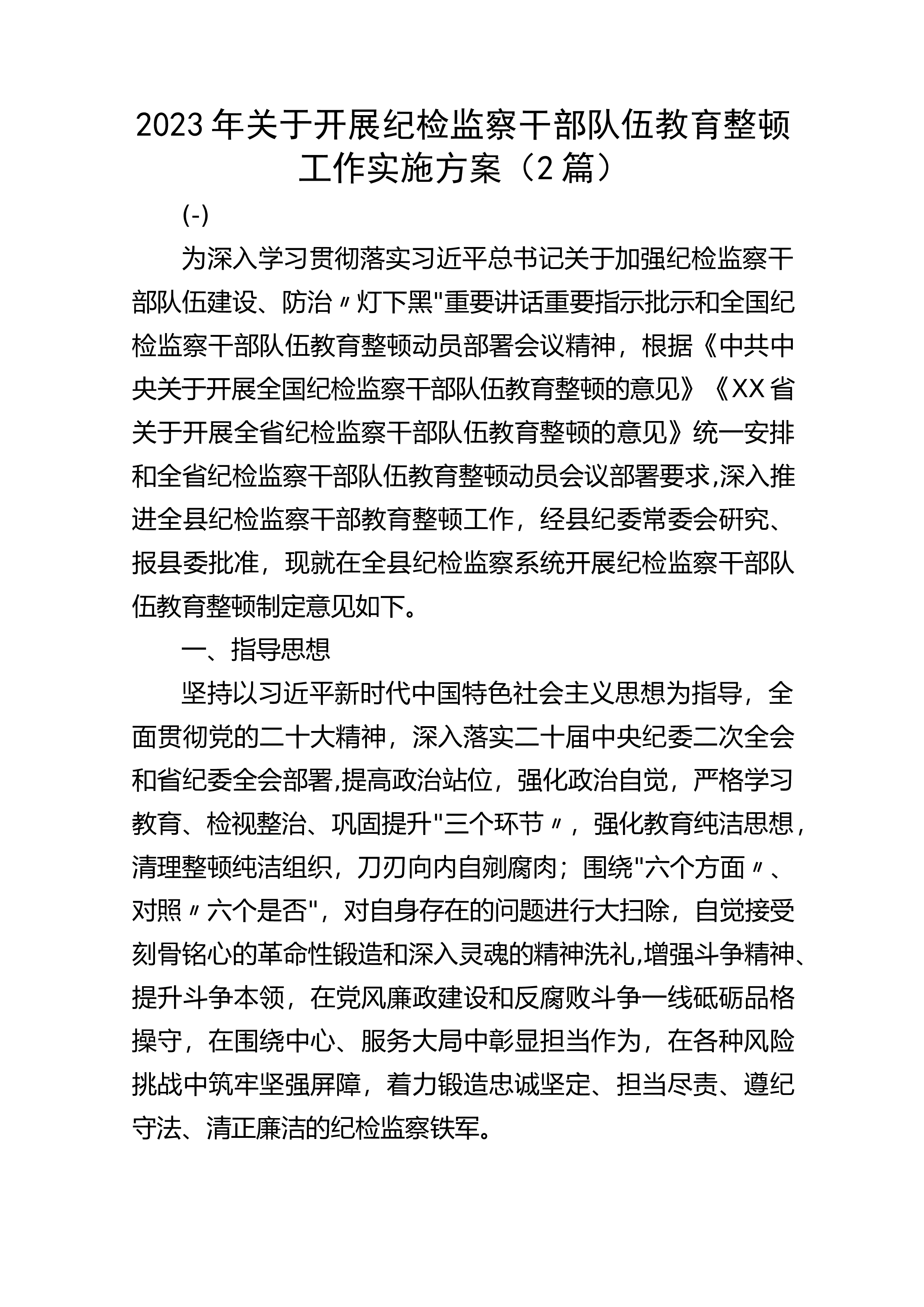 2023年关于开展纪检监察干部队伍教育整顿工作实施方案(2篇)(-)为深入学习贯彻落实习近平总书记关于加强纪检监察干部队伍建设、防治〃灯下黑"重要讲话重要指示批示和全国纪检监察干部队伍教育整顿动员部署会议精神,根据《中共中央关于开展全国纪检监察干部队伍教育整顿的意见》《XX省关于开展全省纪检监察干部队伍教育整顿的意见》统一安排和全省纪检监察干部队伍教育整顿动员会议部署要求,深入推进全县纪检监察干部教育整顿工作,经县纪委常委会硏究、报县委批准,现就在全县纪检监察系统开展纪检监察干部队伍教育整顿制定意见如下。一、指导思想坚持以习近平新时代中国特色社会主义思想为指导,全面贯彻党的二十大精神,深入落实...