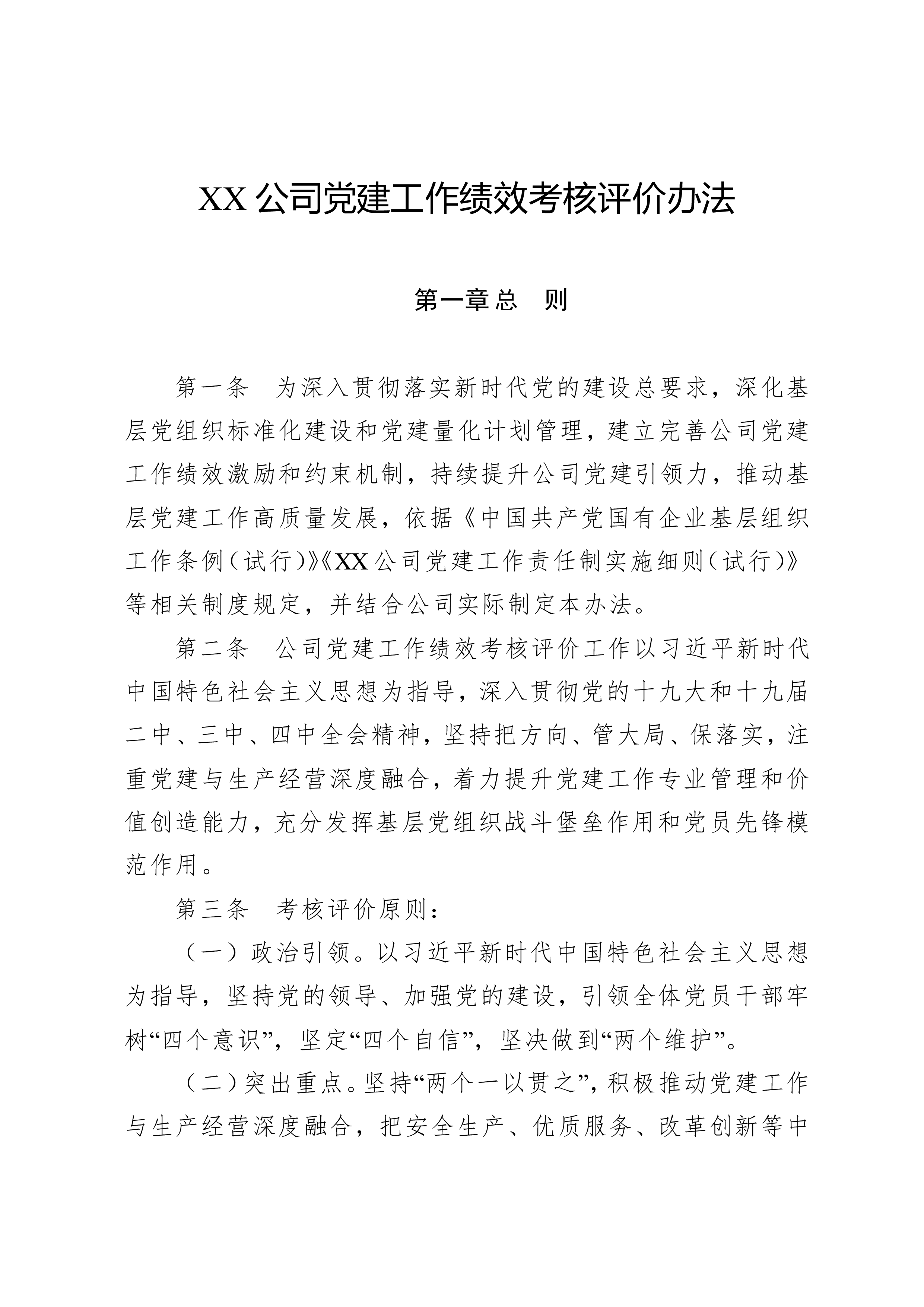 XX公司党建工作绩效考核评价办法第一章总则第一条为深入贯彻落实新时代党的建设总要求,深化基层党组织标准化建设和党建量化计划管理,建立完善公司党建工作绩效激励和约束机制,持续提升公司党建引领力,推动基层党建工作高质量发展,依据《中国共产党国有企业基层组织工作条例(试行)》《XX公司党建工作责任制实施细则(试行)》等相关制度规定,并结合公司实际制定本办法。第二条公司党建工作绩效考核评价工作以习近平新时代中国特色社会主义思想为指导,深入贯彻党的十九大和十九届二中、三中、四中全会精神,坚持把方向、管大局、保落实,注重党建与生产经营深度融合,着力提升党建工作专业管理和价值创造能力,充分发挥基层党组织战斗...