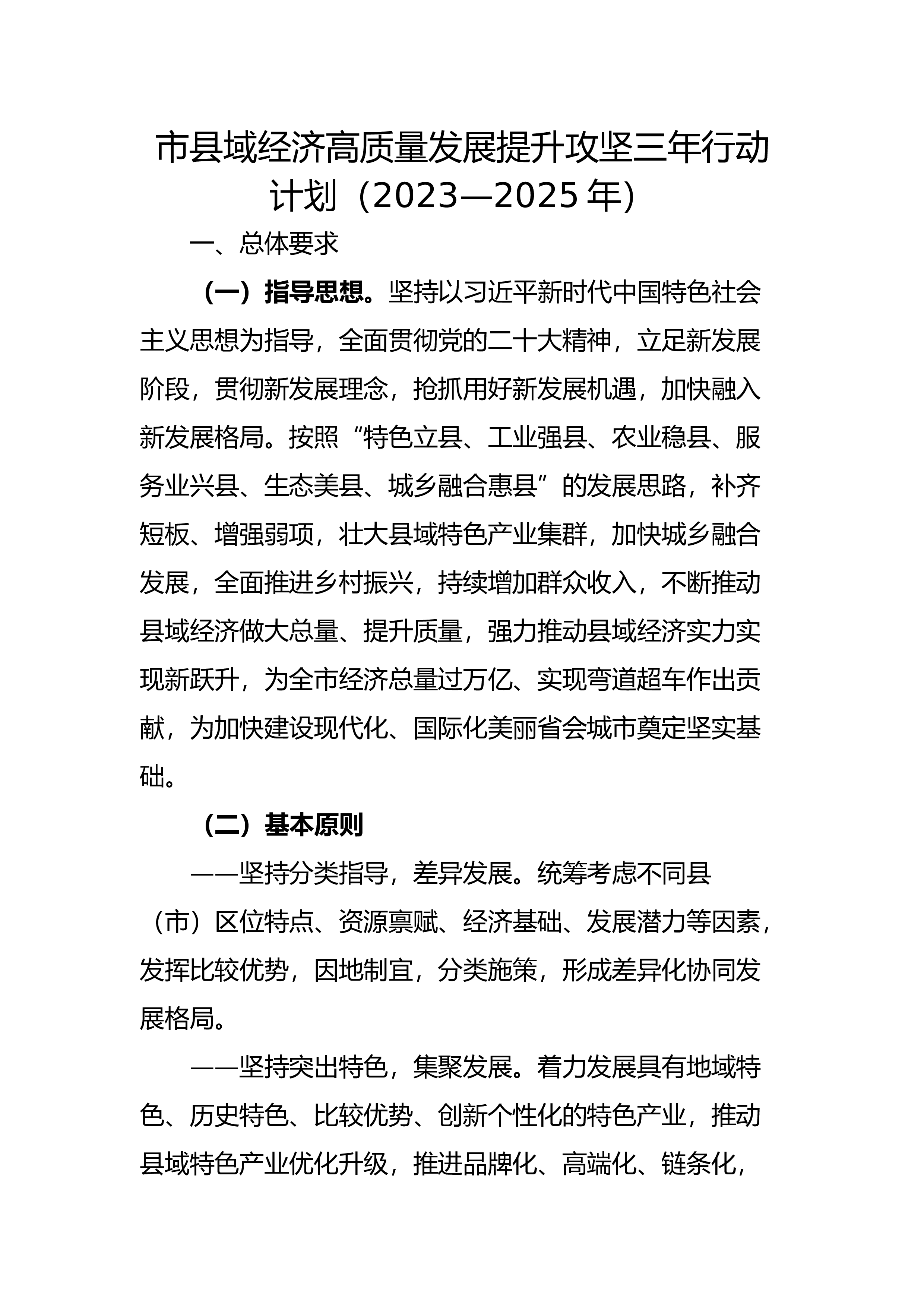 市县域经济高质量发展提升攻坚三年行动计划(2023—2025年)一、总体要求(一)指导思想。坚持以习近平新时代中国特色社会主义思想为指导,全面贯彻党的二十大精神,立足新发展阶段,贯彻新发展理念,抢抓用好新发展机遇,加快融入新发展格局。按照“特色立县、工业强县、农业稳县、服务业兴县、生态美县、城乡融合惠县”的发展思路,补齐短板、增强弱项,壮大县域特色产业集群,加快城乡融合发展,全面推进乡村振兴,持续增加群众收入,不断推动县域经济做大总量、提升质量,强力推动县域经济实力实现新跃升,为全市经济总量过万亿、实现弯道超车作出贡献,为加快建设现代化、国际化美丽省会城市奠定坚实基础。(二)基本原则——坚持分...