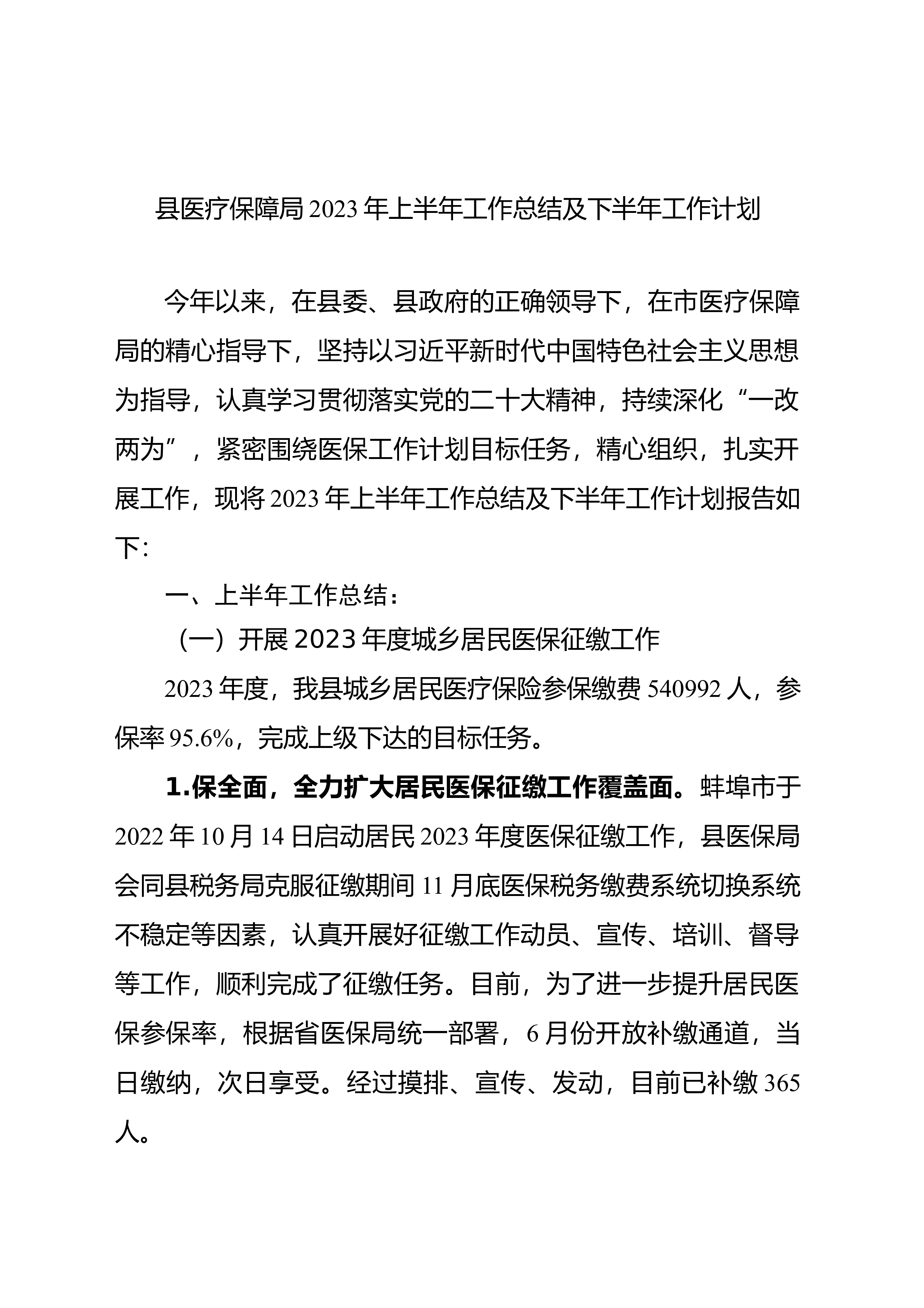 县医疗保障局2023年上半年工作总结及下半年工作计划今年以来,在县委、县政府的正确领导下,在市医疗保障局的精心指导下,坚持以习近平新时代中国特色社会主义思想为指导,认真学习贯彻落实党的二十大精神,持续深化“一改两为”,紧密围绕医保工作计划目标任务,精心组织,扎实开展工作,现将2023年上半年工作总结及下半年工作计划报告如下:一、上半年工作总结:(一)开展2023年度城乡居民医保征缴工作2023年度,我县城乡居民医疗保险参保缴费540992人,参保率95.6%,完成上级下达的目标任务。1.保全面,全力扩大居民医保征缴工作覆盖面。蚌埠市于2022年10月14日启动居民2023年度医保征缴工作,县医...