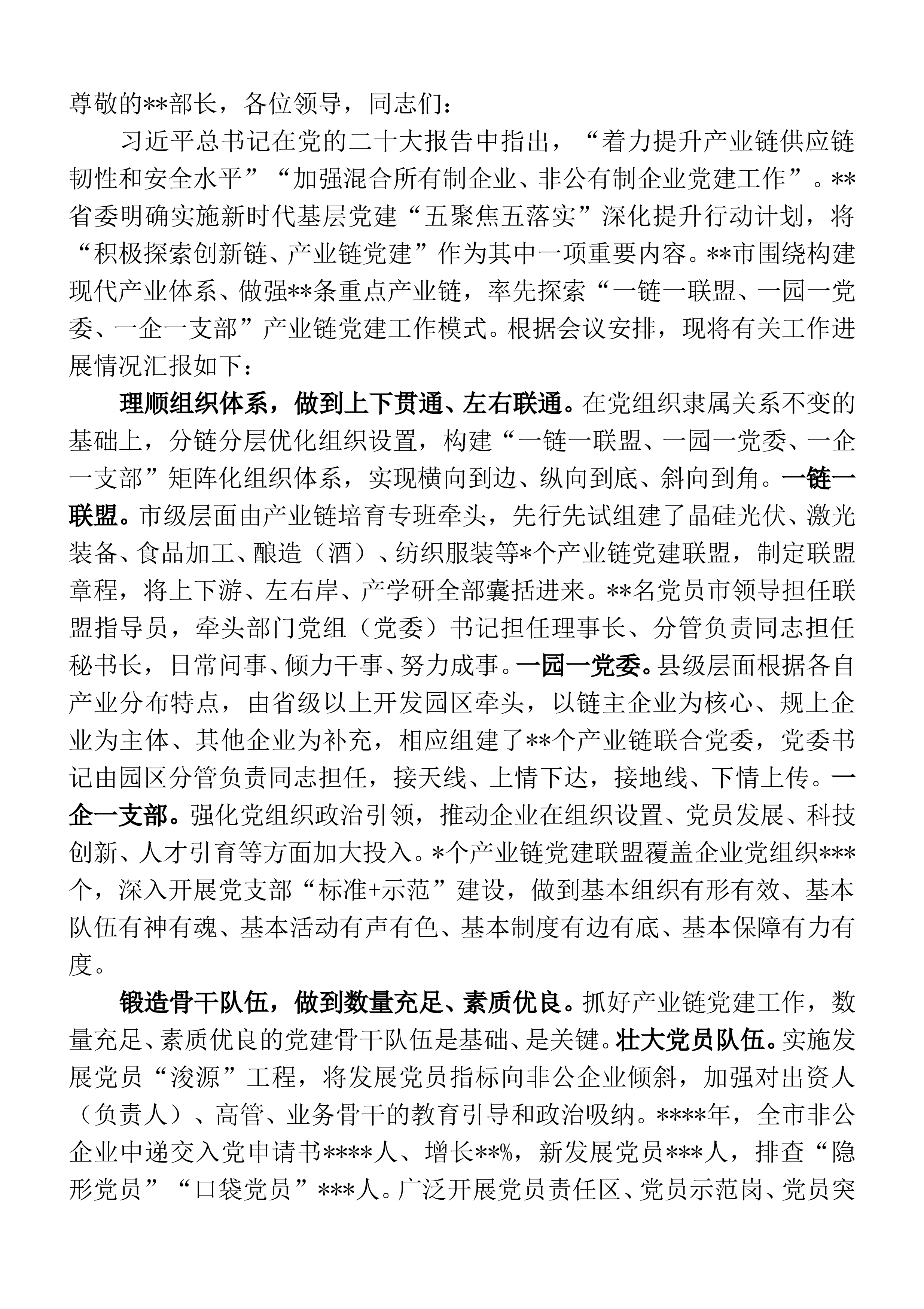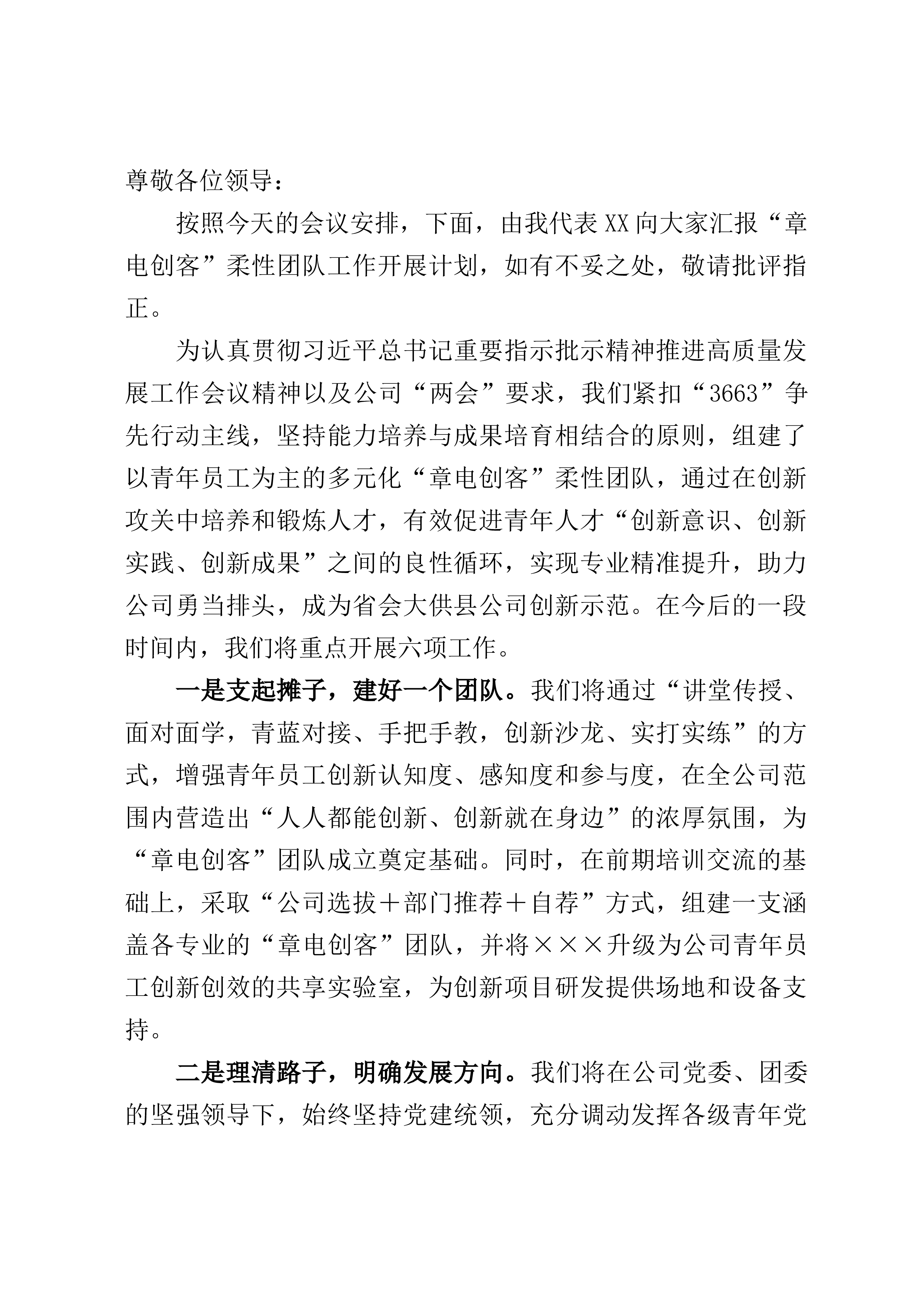 尊敬各位领导:按照今天的会议安排,下面,由我代表XX向大家汇报“章电创客”柔性团队工作开展计划,如有不妥之处,敬请批评指正。为认真贯彻习近平总书记重要指示批示精神推进高质量发展工作会议精神以及公司“两会”要求,我们紧扣“3663”争先行动主线,坚持能力培养与成果培育相结合的原则,组建了以青年员工为主的多元化“章电创客”柔性团队,通过在创新攻关中培养和锻炼人才,有效促进青年人才“创新意识、创新实践、创新成果”之间的良性循环,实现专业精准提升,助力公司勇当排头,成为省会大供县公司创新示范。在今后的一段时间内,我们将重点开展六项工作。一是支起摊子,建好一个团队。我们将通过“讲堂传授、面对面学,青蓝对...