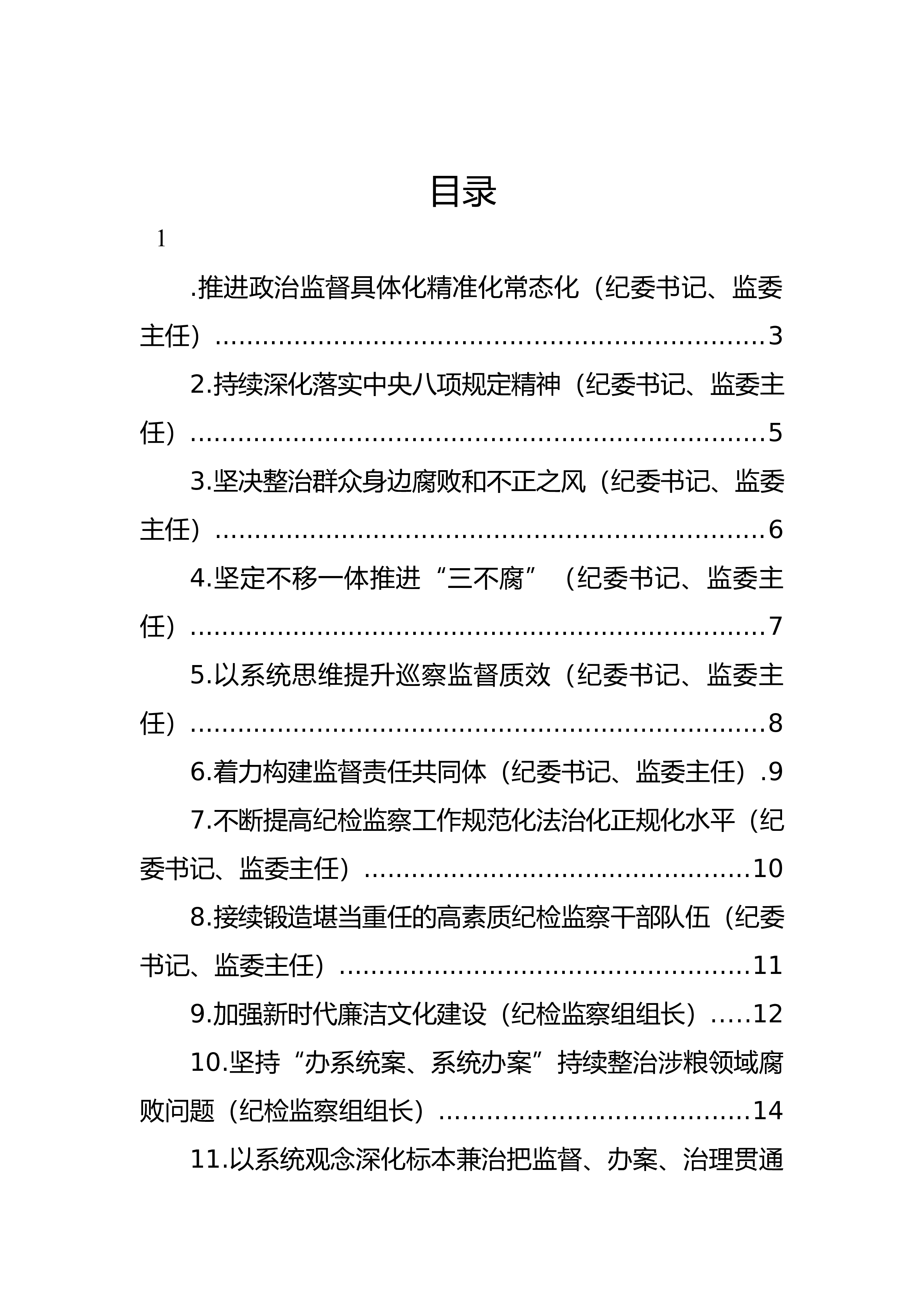 目录1.推进政治监督具体化精准化常态化(纪委书记、监委主任).....................................................................32.持续深化落实中央八项规定精神(纪委书记、监委主任).........................................................................53.坚决整治群众身边腐败和不正之风(纪委书记、监委主任).....................................................................64...