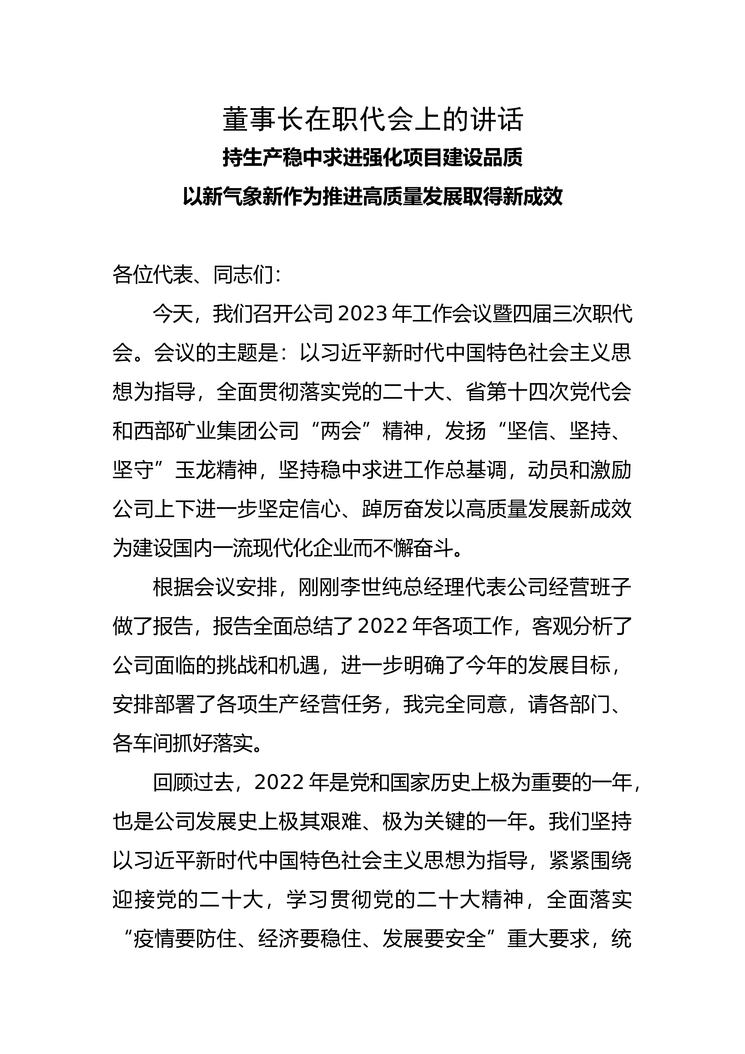 董事长在职代会上的讲话持生产稳中求进强化项目建设品质以新气象新作为推进高质量发展取得新成效各位代表、同志们:今天,我们召开公司2023年工作会议暨四届三次职代会。会议的主题是:以习近平新时代中国特色社会主义思想为指导,全面贯彻落实党的二十大、省第十四次党代会和西部矿业集团公司“两会”精神,发扬“坚信、坚持、坚守”玉龙精神,坚持稳中求进工作总基调,动员和激励公司上下进一步坚定信心、踔厉奋发以高质量发展新成效为建设国内一流现代化企业而不懈奋斗。根据会议安排,刚刚李世纯总经理代表公司经营班子做了报告,报告全面总结了2022年各项工作,客观分析了公司面临的挑战和机遇,进一步明确了今年的发展目标,安排部...
