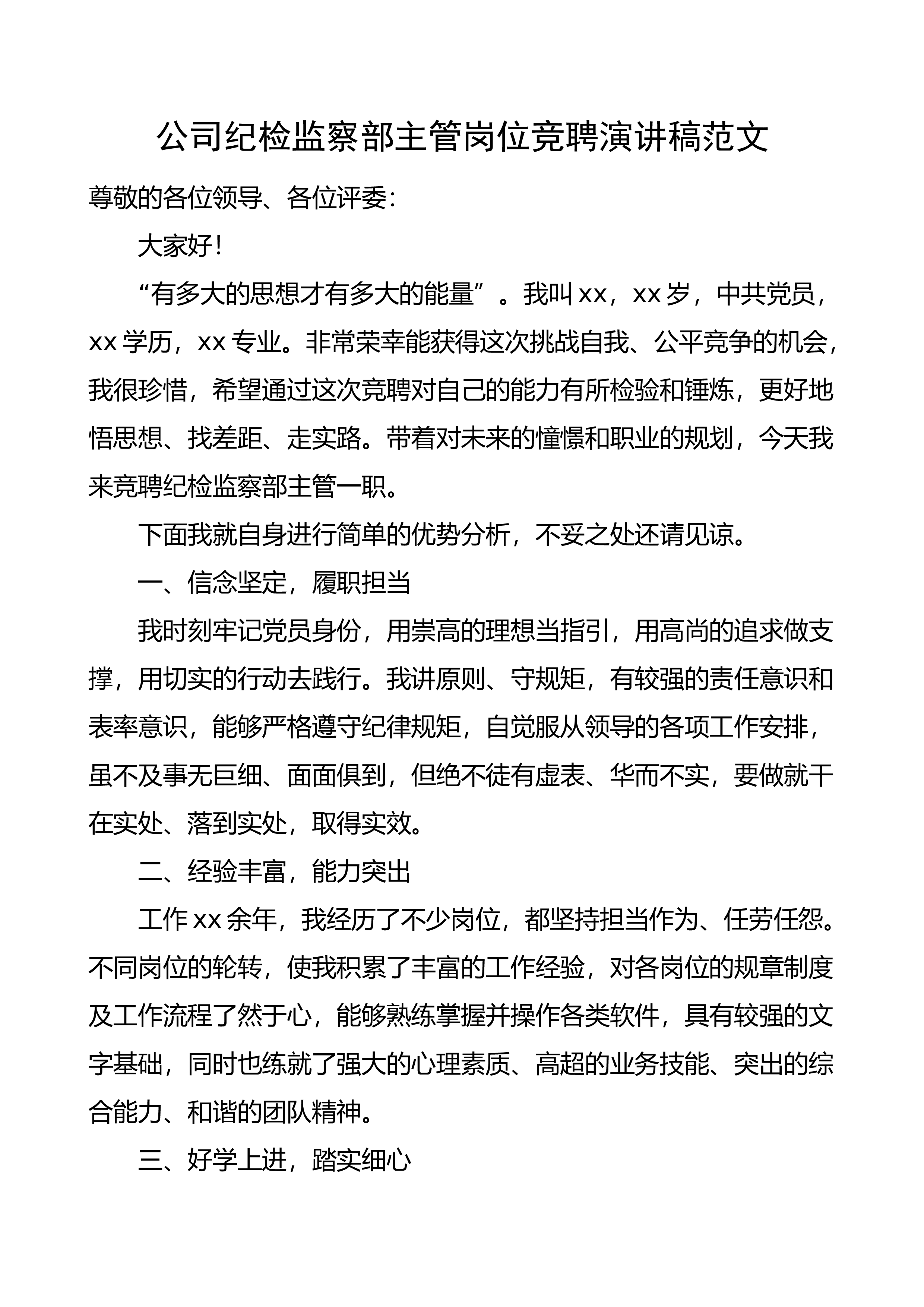 演讲稿范文尊敬的各位领导、各位评委:大家好!“有多大的思想才有多大的能量”。我叫xx,xx岁,中共党员,xx学历,xx专业。非常荣幸能获得这次挑战自我、公平竞争的机会,我很珍惜,希望通过这次