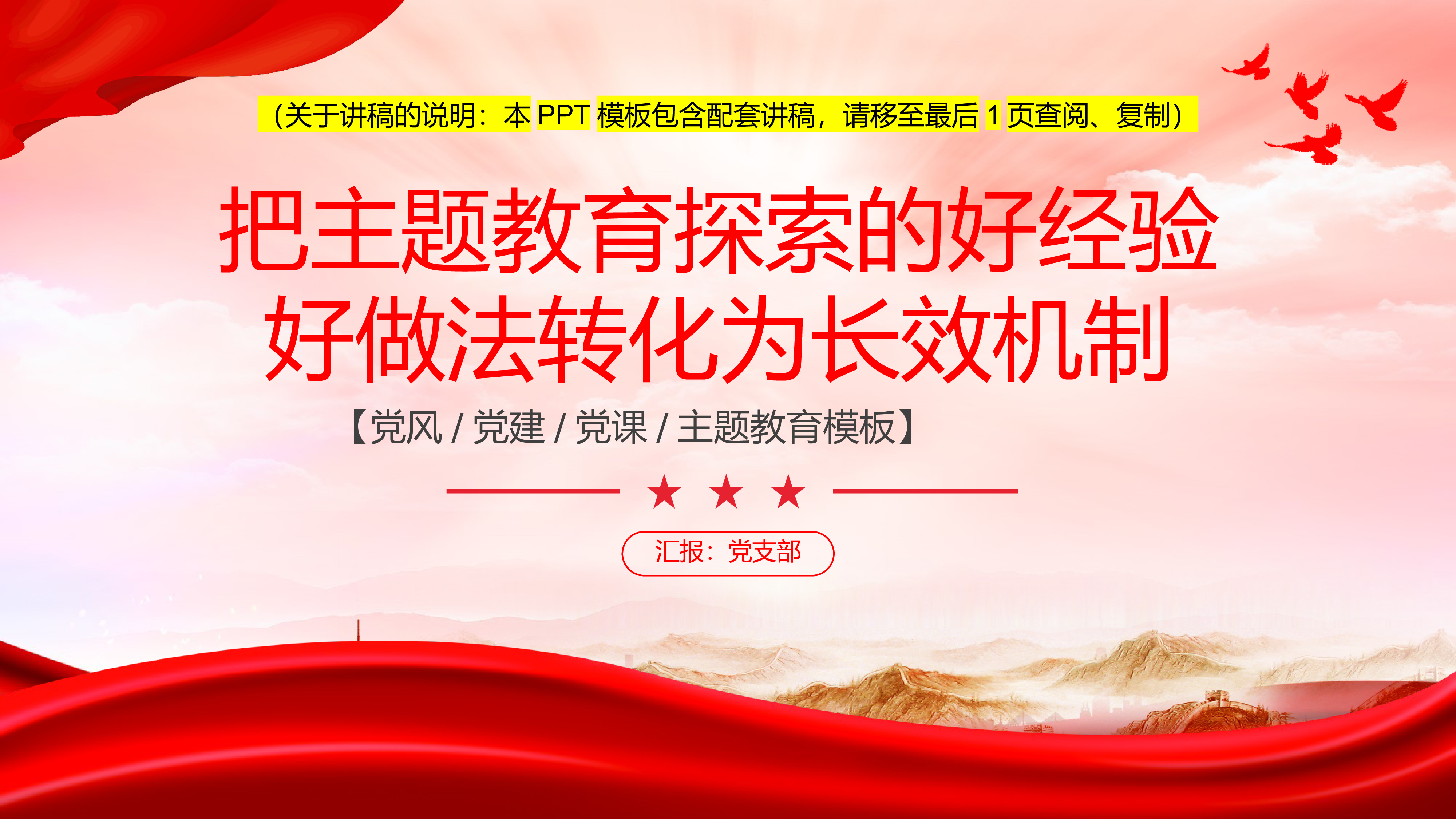 把党课教育探索的好经验好做法转化为长效机制【党风/党建/党课/党课教育模板】汇报:党支部(关于讲稿的说明:本PPT模板包含配套讲稿,请移至最后1页查阅、复制)近日,习近平总书记指出:“第一批党课教育已经告一段落,要抓好继续整改和建章立制工作,把党课教育探索的好经验好做法转化为长效机制。”小智治事,大智治制。制度带有全局性、稳定性,管根本、管长远。对党课教育中学习贯彻习近平新时代中国特色社会主义思想的好经验好做法,及时以制度形式固定下来,是开展党课教育的重要要求。党课教育开展以来,各地区各部门各单位坚持“当下改”与“长久立”相结合,将建章立制贯穿全过程,补齐制度短板、堵塞工作漏洞、防止问题反弹,...