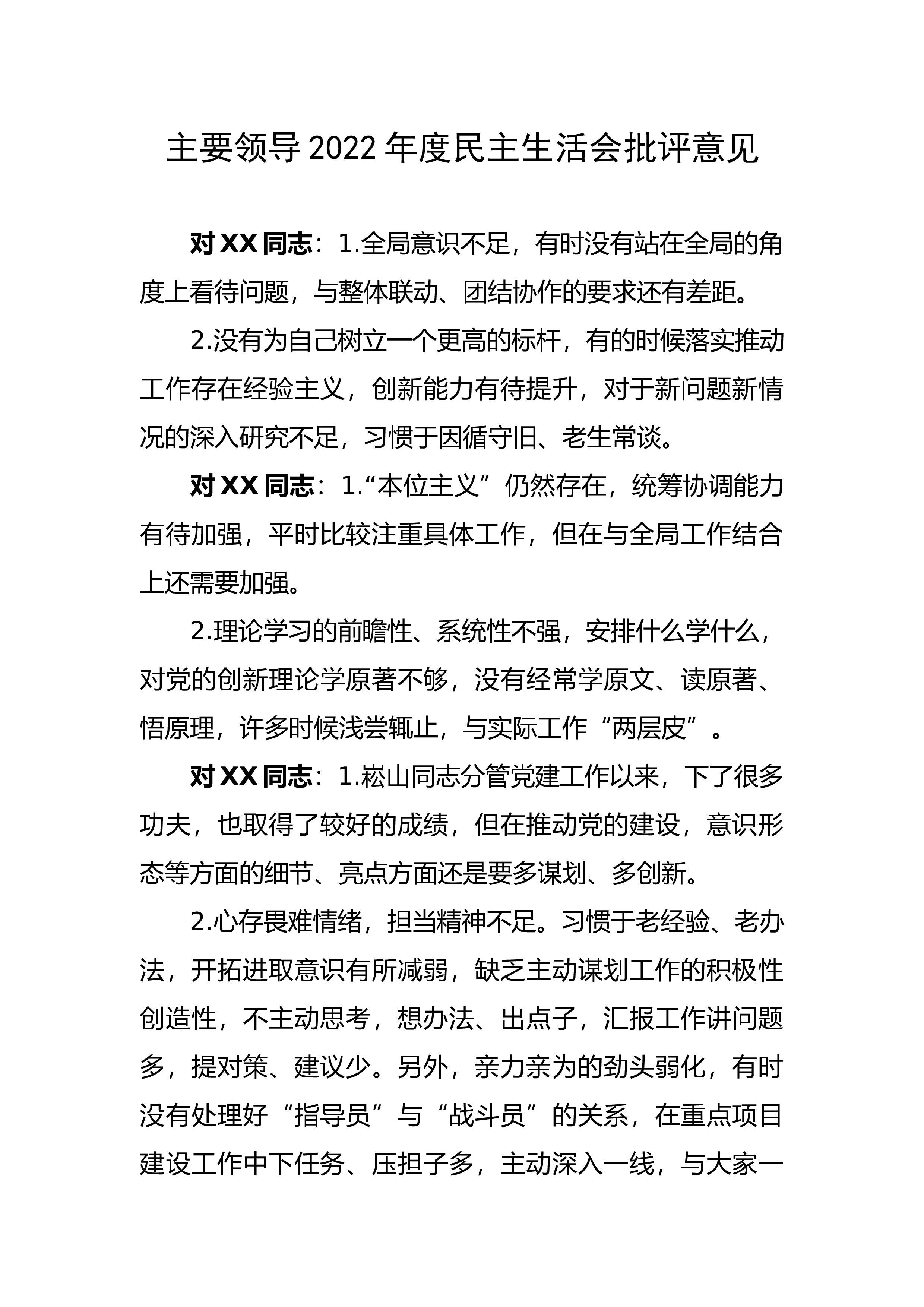 生活会批评意见精选(800条)1、思想上看,解放深度不够。习惯于用旧观念看问题,以老经验办事情,导致视野不够宽思维不够新思路不够活。2、明xx同志的意见:在大胆工作方面做的不够好,顾虑太多,总觉得德育主任主要是做好自我分管的工作,把职责界限划的太清,存在着怕得罪人的现象。另外,在干部队伍建设方面尽管做了些工作,但开拓性做的不够。3、因循守旧,缺乏创新。对一些新问题新矛盾,担心风险大付出多,怕失误怕失败怕担责,不敢创新,简单按老办法老经验办事。4、存在求稳怕乱思想。干事创业活力有所弱化,存在求稳为上的思想。部分领导干部工作上进取意识不强,指导创新的潜力有待提高,统筹协调科学谋划工作潜力欠缺有时还...