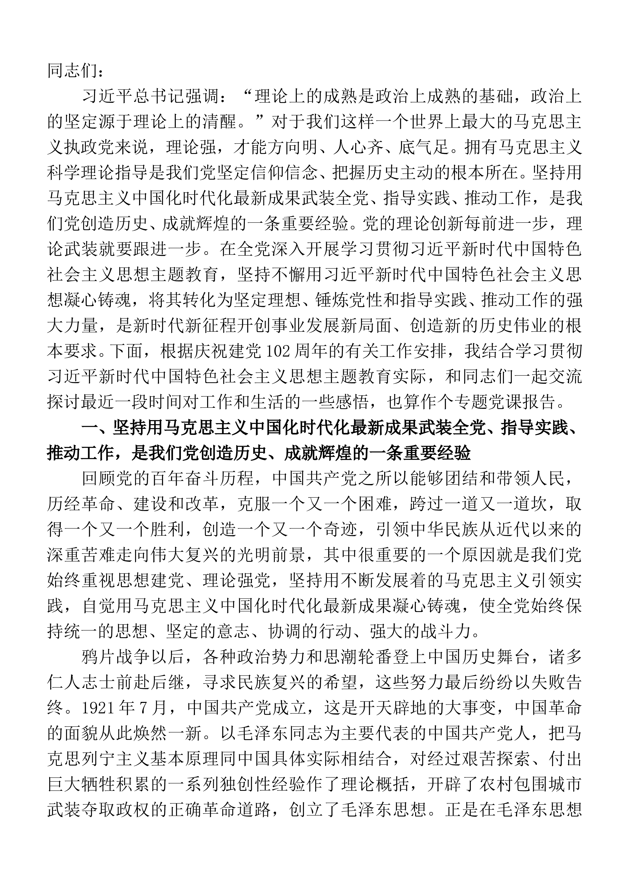 同志们:在全党深入开展学习贯彻习近平新时代中国特色社会主义思想主T教育,是贯彻落实党的二十大精神的重大举措。主T教育开展以来,公司党委深入贯彻党中央决策部署,按照“学思想、强党性、重实践、建新功”的总要求,高位谋划、高标组织、高效推进,各项工作取得积极成效,经验做法在中央主T教育官网刊发,得到巡回指导组高度评价。今天,我们举办这次专题党课,就是对习近平新时代中国特色社会主义思想的再学习、再领会,对深入开展主T教育的再推进、再深化。习近平新时代中国特色社会主义思想是当代中国马克思主义、二十一世纪马克思主义。党的十八大以来,以习近平同志为核心的党中央高度重视思想政治工作,采取一系列重大举措加以推进...