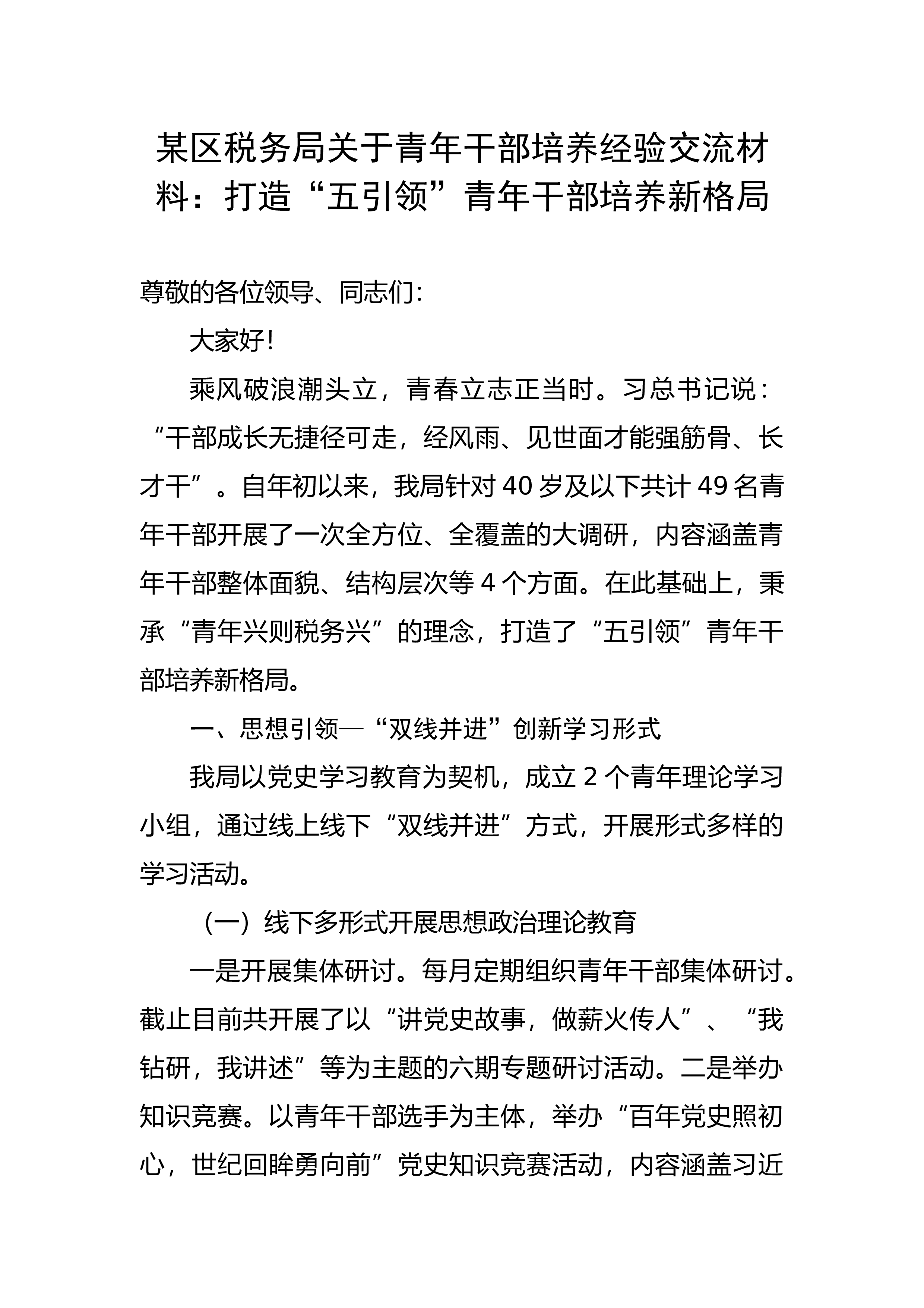 某区税务局关于青年干部培养经验交流材料:打造“五引领”青年干部培养新格局尊敬的各位领导、同志们:大家好!乘风破浪潮头立,青春立志正当时。习总书记说:“干部成长无捷径可走,经风雨、见世面才能强筋骨、长才干”。自年初以来,我局针对40岁及以下共计49名青年干部开展了一次全方位、全覆盖的大调研,内容涵盖青年干部整体面貌、结构层次等4个方面。在此基础上,秉承“青年兴则税务兴”的理念,打造了“五引领”青年干部培养新格局。一、思想引领—“双线并进”创新学习形式我局以党史学习教育为契机,成立2个青年理论学习小组,通过线上线下“双线并进”方式,开展形式多样的学习活动。(一)线下多形式开展思想政治理论教育一是开...
