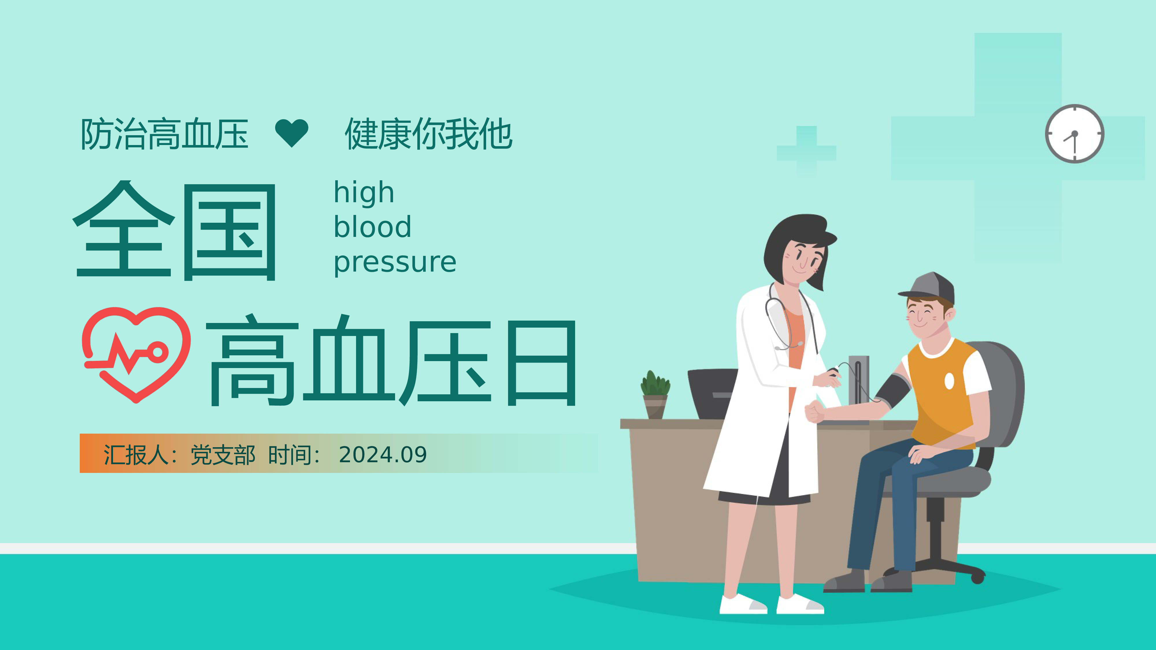 高血压日汇报人:党支部时间:2024.09防治高血压健康你我他♥全国highbloodpressure目录CONTENTS高血压病基本知识01高血压患者的自我管理03高血压的中医治疗02预防高血压从每一天做起04高血压是心、脑血管病的危险因素,高血压与动脉硬化、脑血栓、脑出血、缺血性心脏病及充血性心力衰竭的发生与发展都有密切关系,尤其是收缩压的增高与以上疾病的关系更为密切。高血压病基本知识PART01GAOXUEYAJIANKANGJIAOYUXUANCHUAN高血压病基本知识什么是高血压高血压是心、脑血管病的危险因素,高血压与动脉硬化、脑血栓、脑出血、缺血性心脏病及充血性心力衰竭的发生与发展...