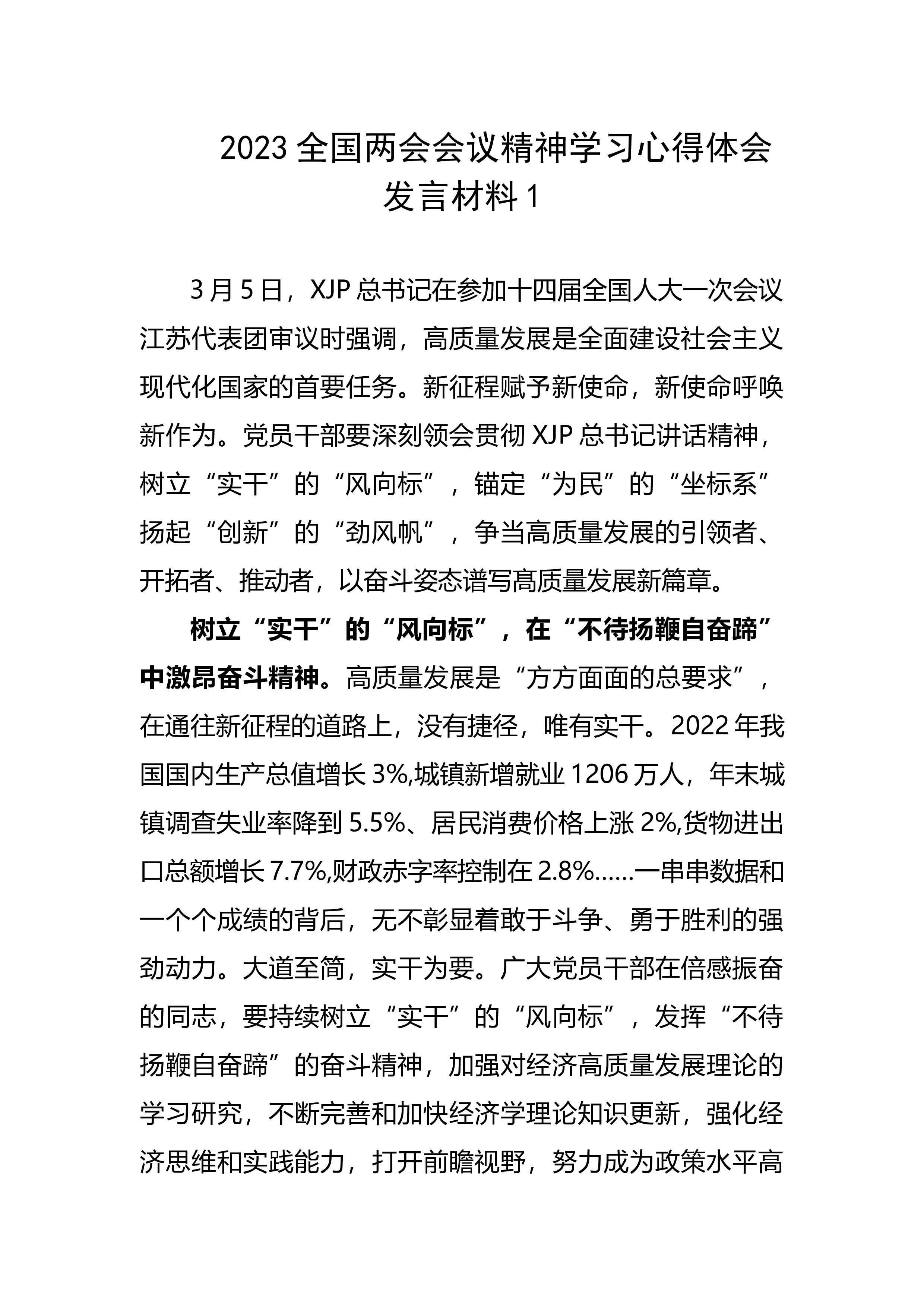 2023全国两会会议精神学习心得体会发言材料13月5日,XJP总书记在参加十四届全国人大一次会议江苏代表团审议时强调,高质量发展是全面建设社会主义现代化国家的首要任务。新征程赋予新使命,新使命呼唤新作为。党员干部要深刻领会贯彻XJP总书记讲话精神,树立“实干”的“风向标”,锚定“为民”的“坐标系”扬起“创新”的“劲风帆”,争当高质量发展的引领者、开拓者、推动者,以奋斗姿态谱写髙质量发展新篇章。树立“实干”的“风向标”,在“不待扬鞭自奋蹄”中激昂奋斗精神。高质量发展是“方方面面的总要求”,在通往新征程的道路上,没有捷径,唯有实干。2022年我国国内生产总值增长3%,城镇新增就业1206万人,年末...