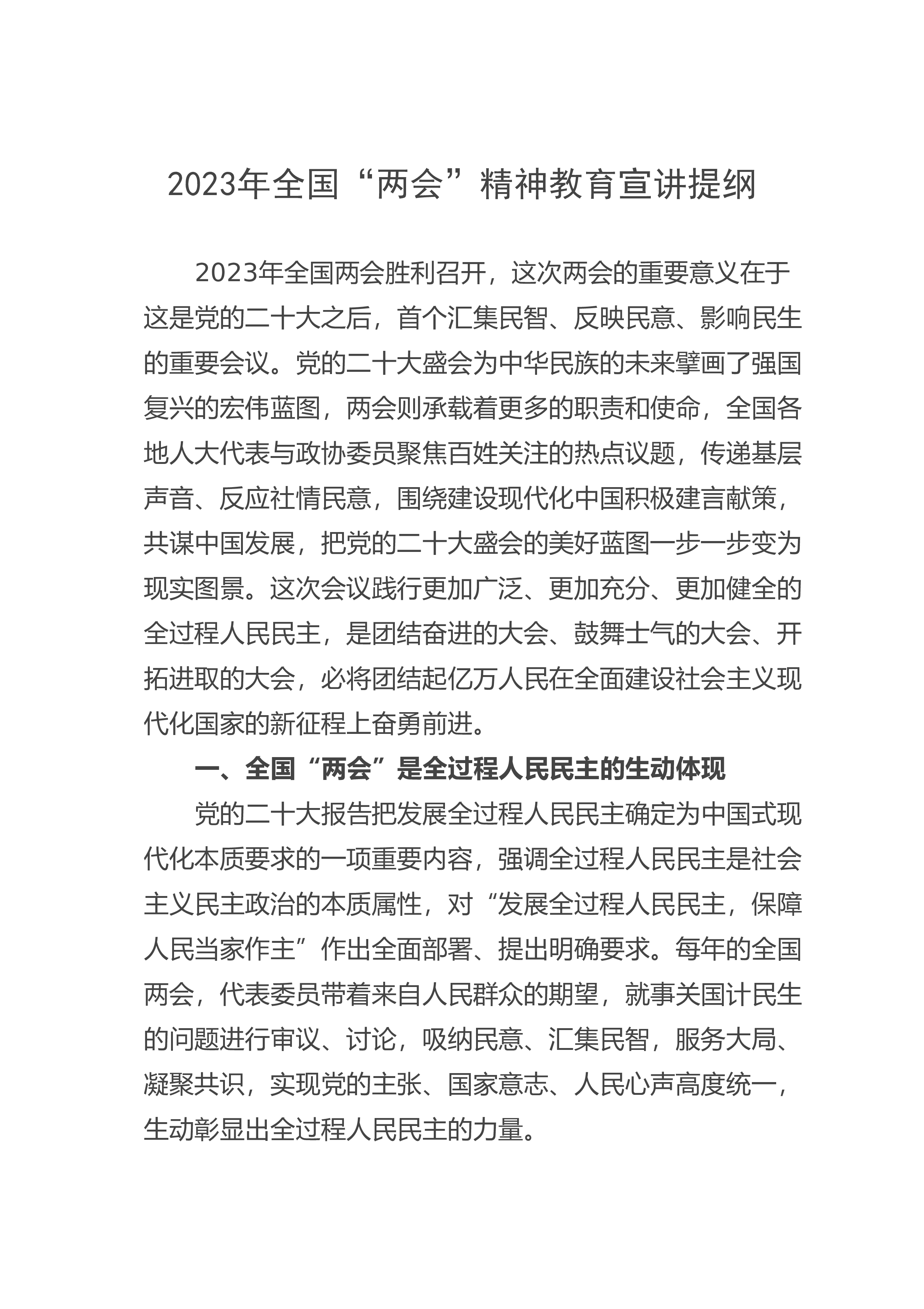 2023年全国“两会”精神教育宣讲提纲2023年全国两会胜利召开,这次两会的重要意义在于这是党的二十大之后,首个汇集民智、反映民意、影响民生的重要会议。党的二十大盛会为中华民族的未来擘画了强国复兴的宏伟蓝图,两会则承载着更多的职责和使命,全国各地人大代表与政协委员聚焦百姓关注的热点议题,传递基层声音、反应社情民意,围绕建设现代化中国积极建言献策,共谋中国发展,把党的二十大盛会的美好蓝图一步一步变为现实图景。这次会议践行更加广泛、更加充分、更加健全的全过程人民民主,是团结奋进的大会、鼓舞士气的大会、开拓进取的大会,必将团结起亿万人民在全面建设社会主义现代化国家的新征程上奋勇前进。一、全国“两会”...