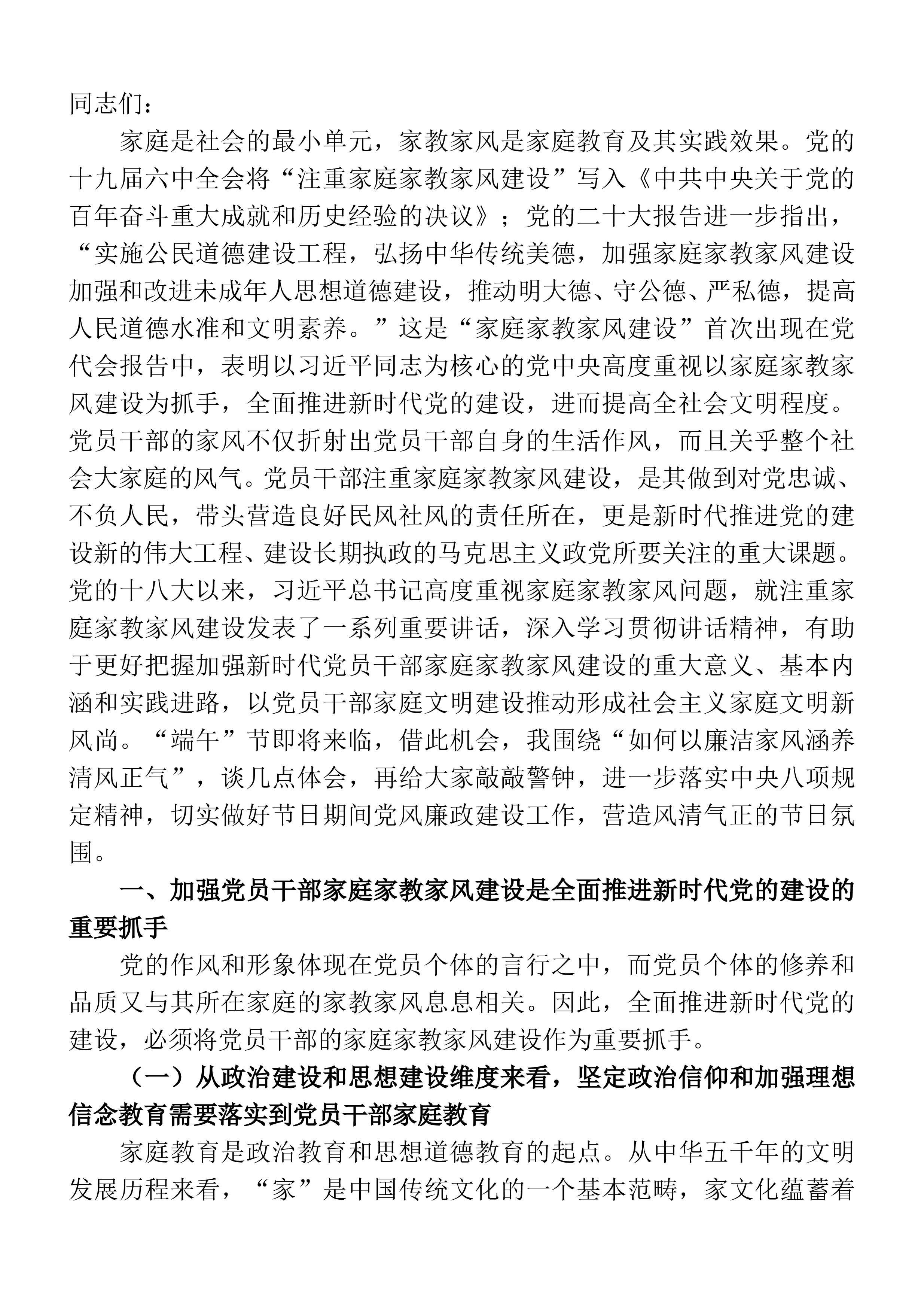 同志们:家庭是社会的最小单元,家教家风是家庭教育及其实践效果。党的十九届六中全会将“注重家庭家教家风建设”写入《中共中央关于党的百年奋斗重大成就和历史经验的决议》;党的二十大报告进一步指出,“实施公民道德建设工程,弘扬中华传统美德,加强家庭家教家风建设加强和改进未成年人思想道德建设,推动明大德、守公德、严私德,提高人民道德水准和文明素养。”这是“家庭家教家风建设”首次出现在党代会报告中,表明以习近平同志为核心的党中央高度重视以家庭家教家风建设为抓手,全面推进新时代党的建设,进而提高全社会文明程度。党员干部的家风不仅折射出党员干部自身的生活作风,而且关乎整个社会大家庭的风气。党员干部注重家庭家教...