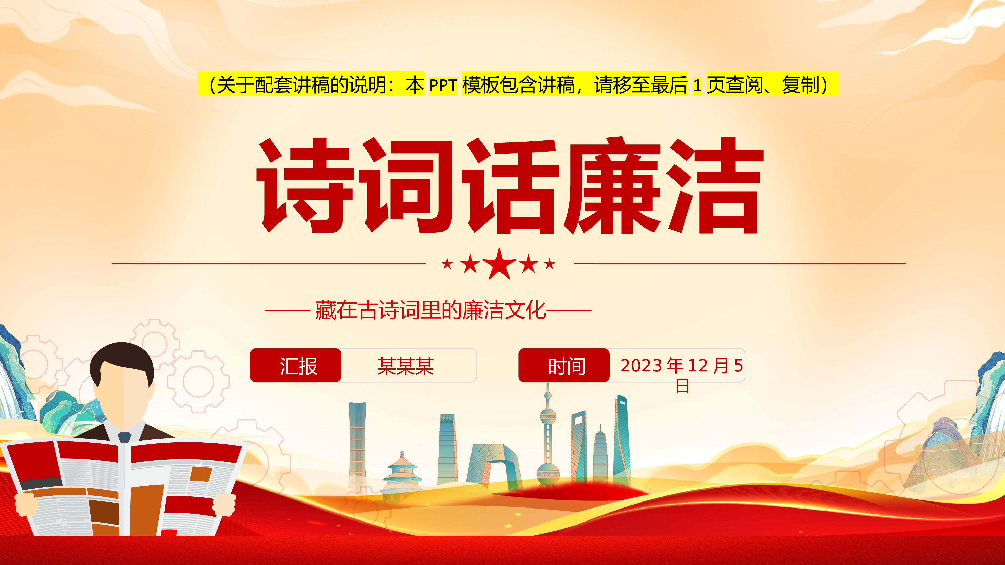 汇报某某某时间2023年12月5日诗词话廉洁——藏在古诗词里的廉洁文化——(关于配套讲稿的说明:本PPT模板包含讲稿,请移至最后1页查阅、复制)前言导读中国诗词传诵千年,浩如烟海的诗词中,廉政诗词是其中重要的一部分。这些带着清廉劝诫、高洁操守的诗句闪耀着正义的光辉,激浊扬清、抨击黑暗、弘扬清廉文化,蕴含着丰富的廉政思想,是中华优秀传统文化的精髓,是悠久文化历史中的瑰宝。诗词话廉洁《墨梅》【元】王冕我家洗砚池头树,朵朵花开淡墨痕。不要人夸好颜色,只留清气满乾坤。王冕是元代诗人,他从一个替别人放牛的牧童,靠着在牛背上勤奋学习,终于成为了一代著名的诗人和画家。《墨梅》这首诗就是他为自己所画的梅花图而...