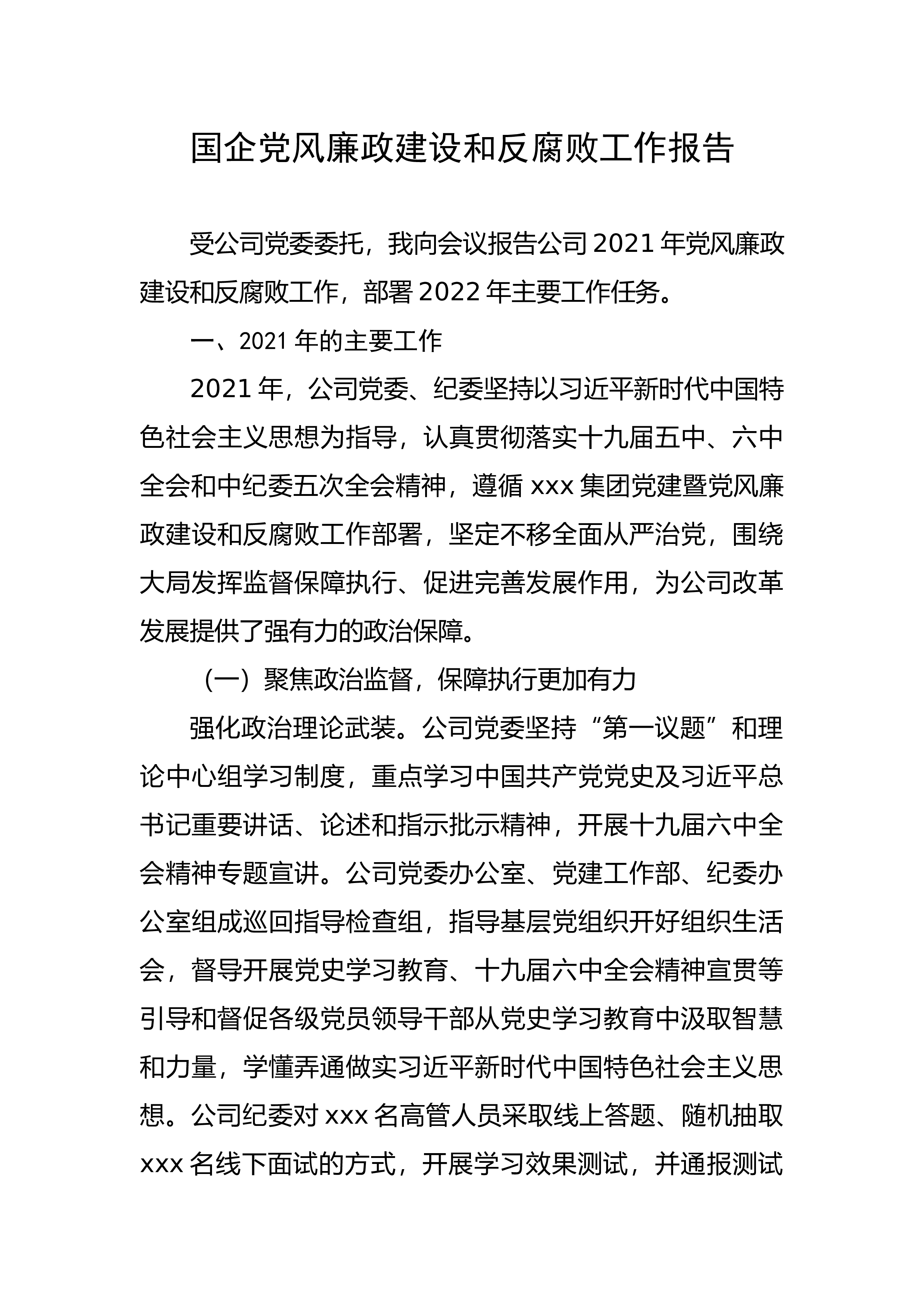 国企党风廉政建设和反腐败工作报告受公司党委委托,我向会议报告公司2021年党风廉政建设和反腐败工作,部署2022年主要工作任务。一、2021年的主要工作2021年,公司党委、纪委坚持以习近平新时代中国特色社会主义思想为指导,认真贯彻落实十九届五中、六中全会和中纪委五次全会精神,遵循xxx集团党建暨党风廉政建设和反腐败工作部署,坚定不移全面从严治党,围绕大局发挥监督保障执行、促进完善发展作用,为公司改革发展提供了强有力的政治保障。(一)聚焦政治监督,保障执行更加有力强化政治理论武装。公司党委坚持“第一议题”和理论中心组学习制度,重点学习中国共产党党史及习近平总书记重要讲话、论述和指示批示精神,开...