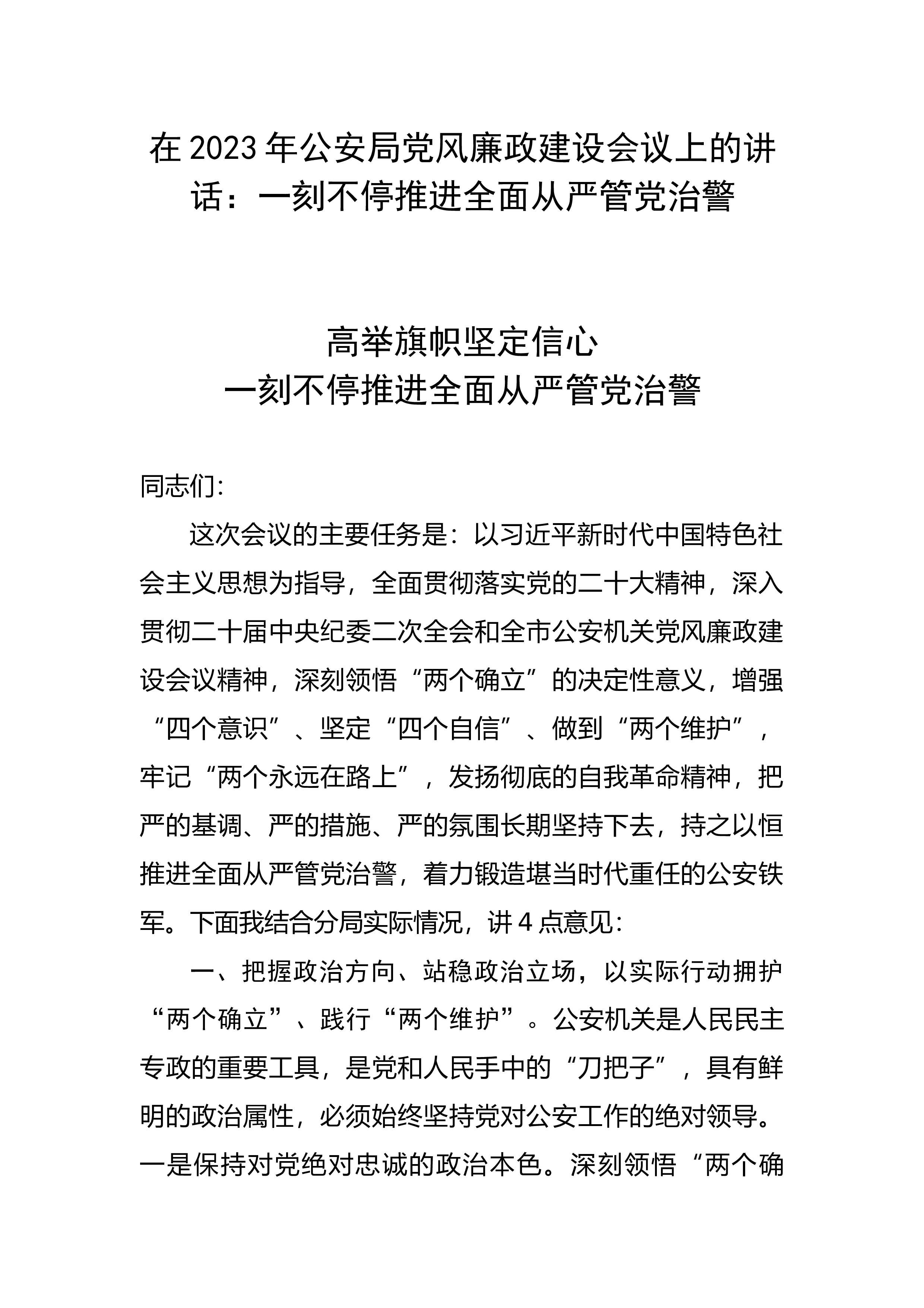 在2023年公安局党风廉政建设会议上的讲话:一刻不停推进全面从严管党治警高举旗帜坚定信心一刻不停推进全面从严管党治警同志们:这次会议的主要任务是:以习近平新时代中国特色社会主义思想为指导,全面贯彻落实党的二十大精神,深入贯彻二十届中央纪委二次全会和全市公安机关党风廉政建设会议精神,深刻领悟“两个确立”的决定性意义,增强“四个意识”、坚定“四个自信”、做到“两个维护”,牢记“两个永远在路上”,发扬彻底的自我革命精神,把严的基调、严的措施、严的氛围长期坚持下去,持之以恒推进全面从严管党治警,着力锻造堪当时代重任的公安铁军。下面我结合分局实际情况,讲4点意见:一、把握政治方向、站稳政治立场,以实际行...