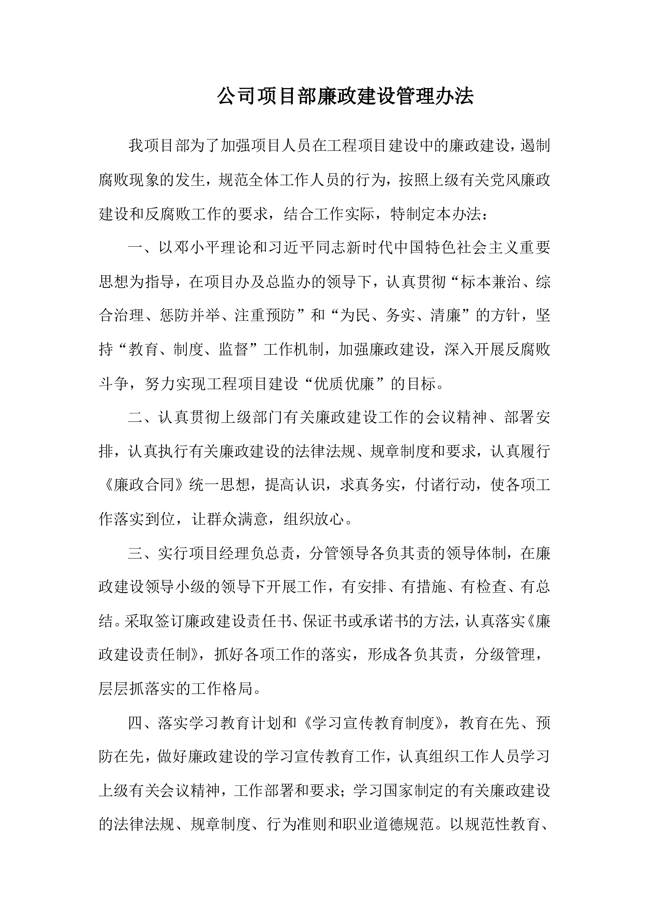和反腐败工作的要求,结合工作实际,特制定本办法:一、以邓小平理论和习近平同志新时代中国特色社会主义重要思想为指导,在项目办及总监办的领导下,认真贯彻“标本兼治、综合治理、惩防并举、注重预防”和“为民、务实、清廉”的方针,坚持“教育、制度、监督”工作机制,加强