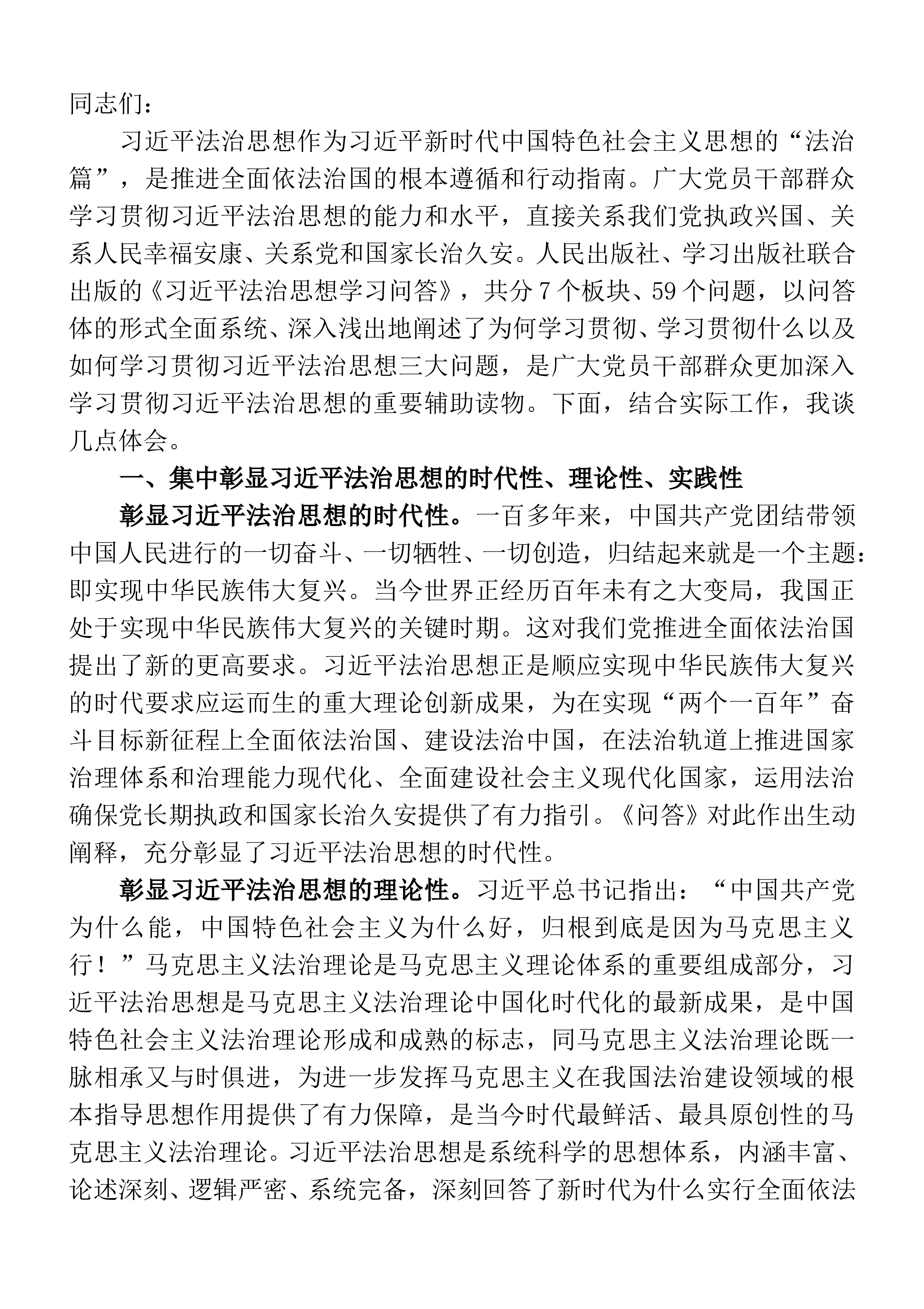 同志们:习近平法治思想作为习近平新时代中国特色社会主义思想的“法治篇”,是推进全面依法治国的根本遵循和行动指南。广大党员干部群众学习贯彻习近平法治思想的能力和水平,直接关系我们党执政兴国、关系人民幸福安康、关系党和国家长治久安。人民出版社、学习出版社联合出版的《习近平法治思想学习问答》,共分7个板块、59个问题,以问答体的形式全面系统、深入浅出地阐述了为何学习贯彻、学习贯彻什么以及如何学习贯彻习近平法治思想三大问题,是广大党员干部群众更加深入学习贯彻习近平法治思想的重要辅助读物。下面,结合实际工作,我谈几点体会。一、集中彰显习近平法治思想的时代性、理论性、实践性彰显习近平法治思想的时代性。一百...