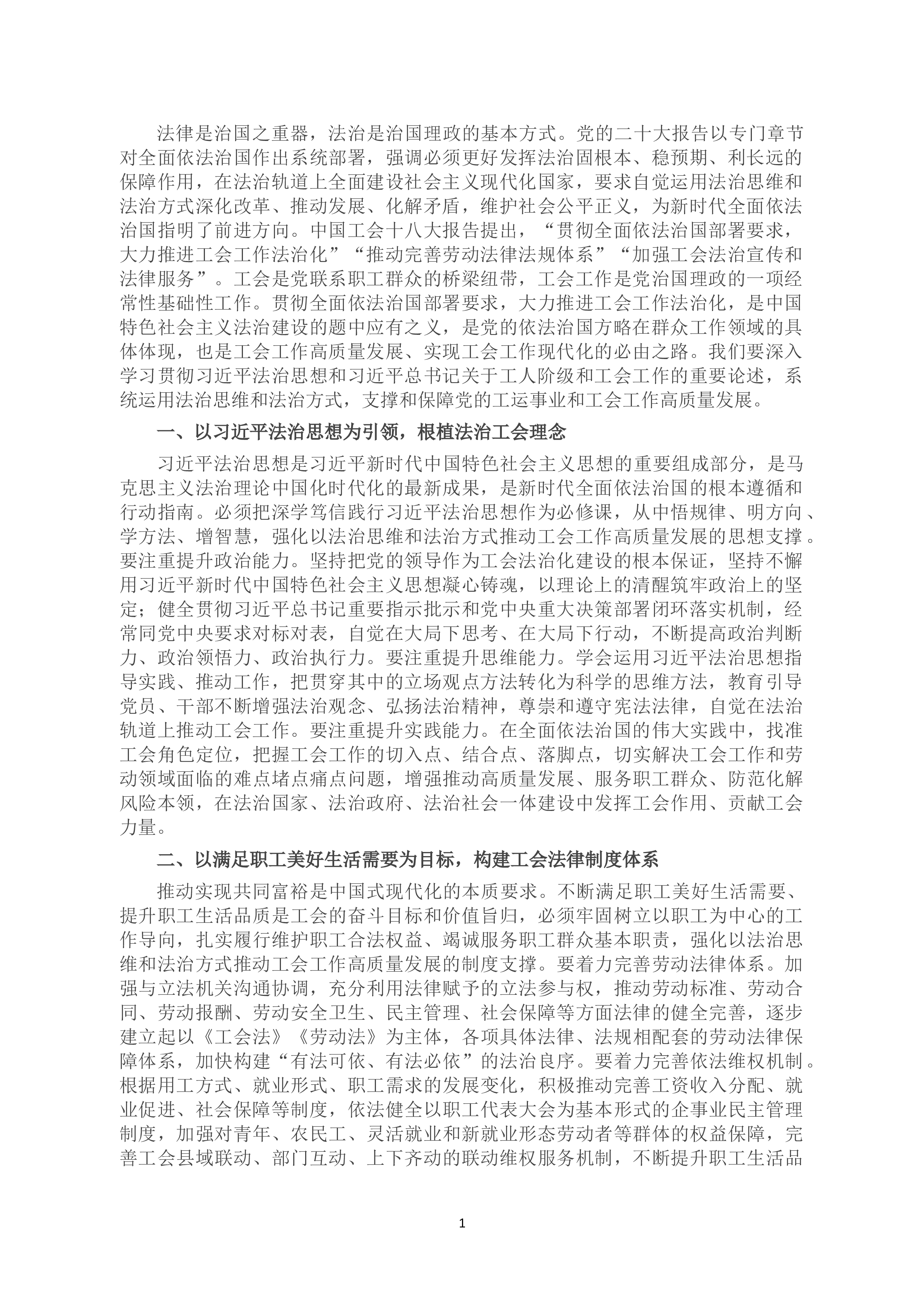 法律是治国之重器,法治是治国理政的基本方式。党的二十大报告以专门章节对全面依法治国作出系统部署,强调必须更好发挥法治固根本、稳预期、利长远的保障作用,在法治轨道上全面建设社会主义现代化国家,要求自觉运用法治思维和法治方式深化改革、推动发展、化解矛盾,维护社会公平正义,为新时代全面依法治国指明了前进方向。中国工会十八大报告提出,“贯彻全面依法治国部署要求,大力推进工会工作法治化”“推动完善劳动法律法规体系”“加强工会法治宣传和法律服务”。工会是党联系职工群众的桥梁纽带,工会工作是党治国理政的一项经常性基础性工作。贯彻全面依法治国部署要求,大力推进工会工作法治化,是中国特色社会主义法治建设的题中应...