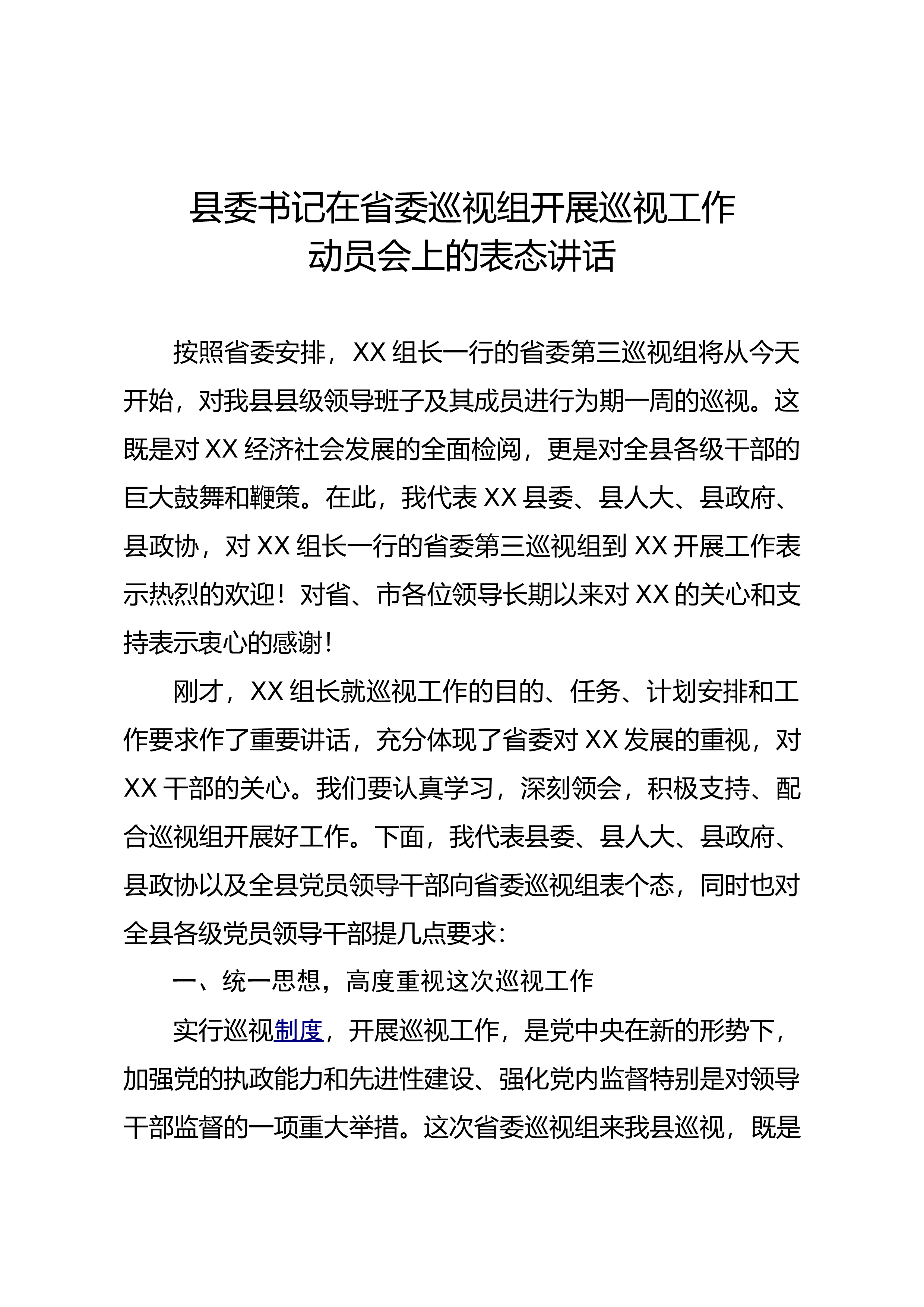 县委书记在省委巡视组开展巡视工作动员会上的表态讲话按照省委安排,XX组长一行的省委第三巡视组将从今天开始,对我县县级