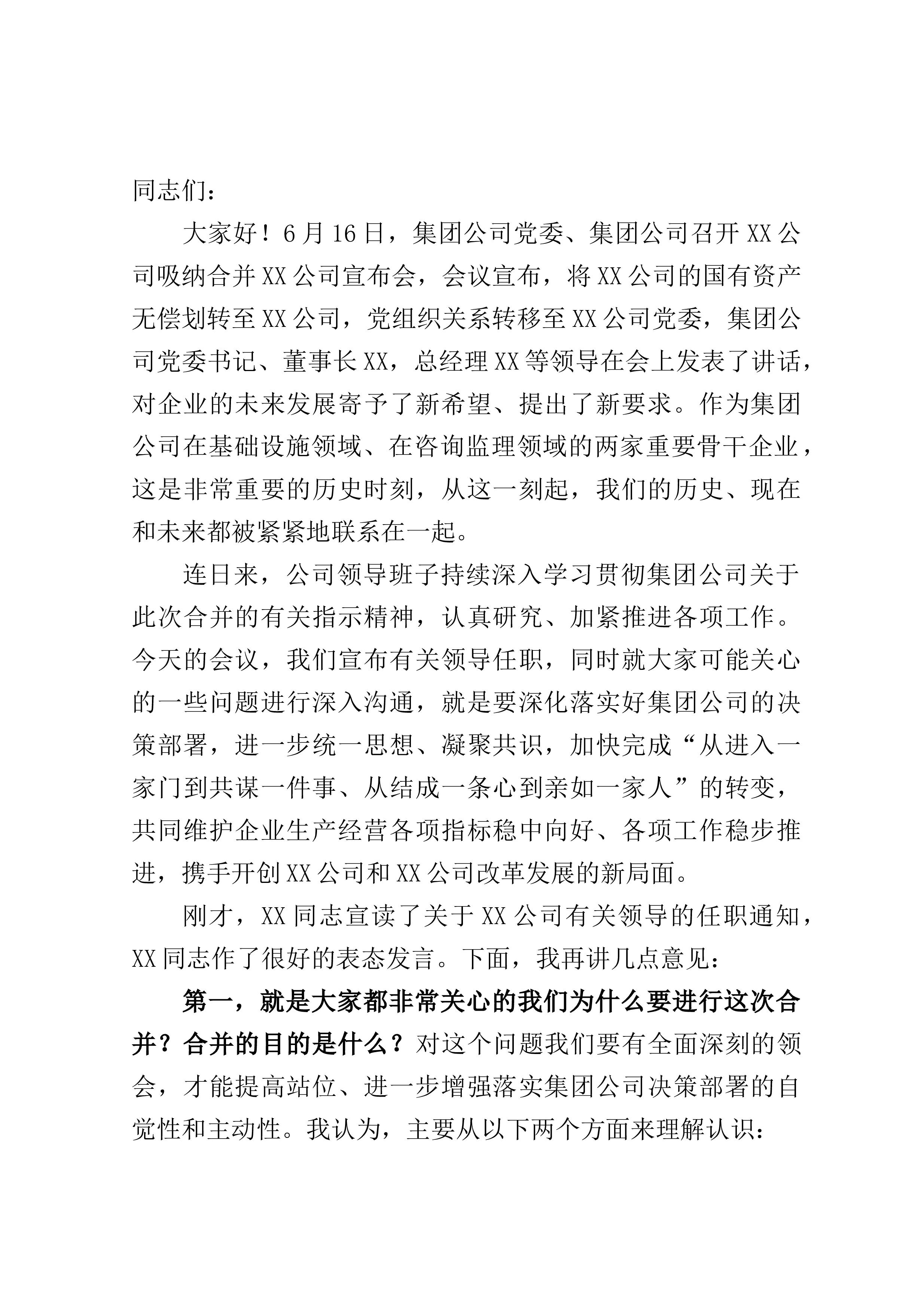 同志们:大家好!6月16日,集团公司党委、集团公司召开XX公司吸纳合并XX公司宣布会,会议宣布,将XX公司的国有资产无偿划转至XX公司,党组织关系转移至XX公司党委,集团公司党委书记、董事长XX,总经理XX等领导在会上发表了讲话,对企业的未来发展寄予了新希望、提出了新要求。作为集团公司在基础设施领域、在咨询监理领域的两家重要骨干企业,这是非常重要的历史时刻,从这一刻起,我们的历史、现在和未来都被紧紧地联系在一起。连日来,公司