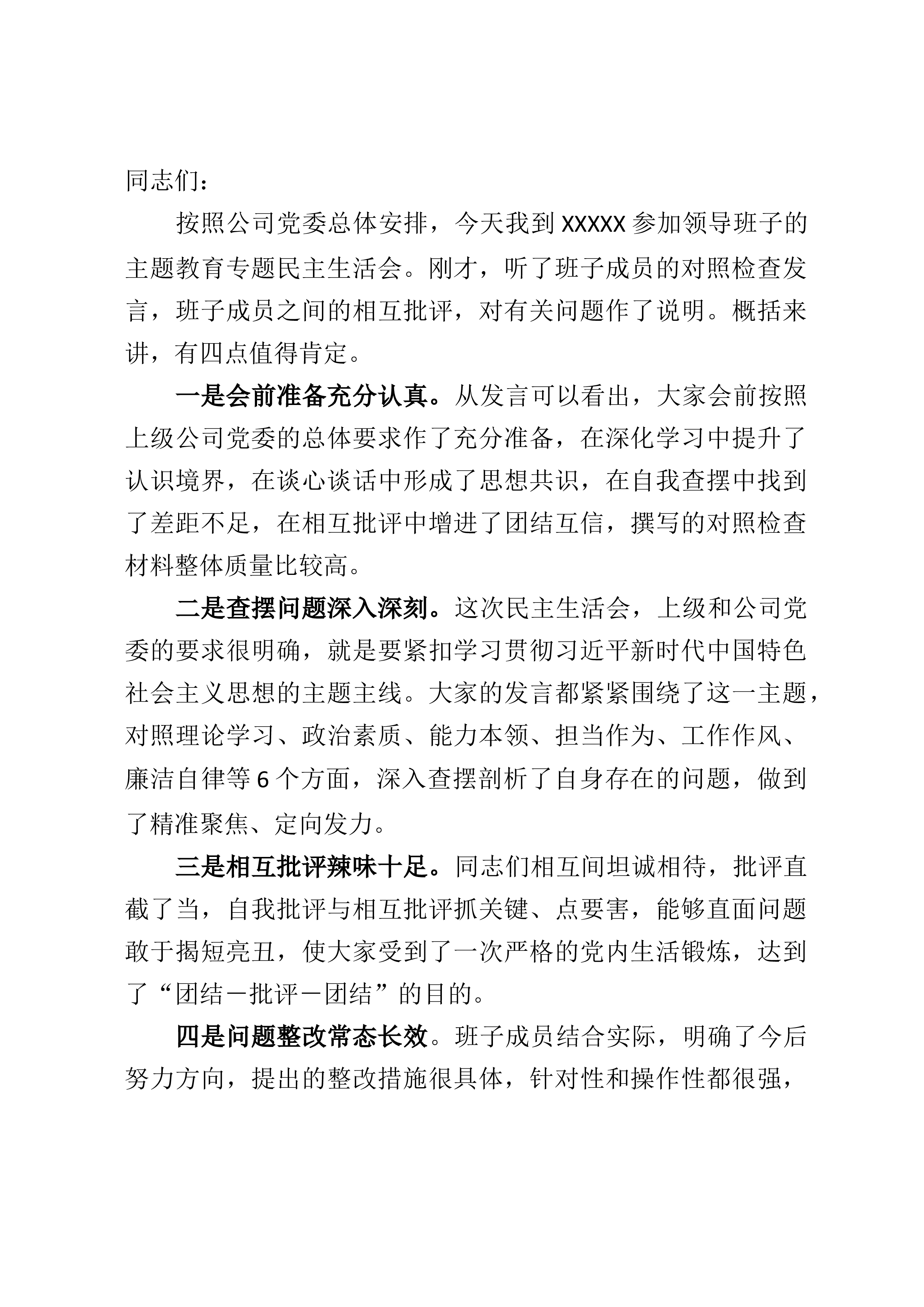 的主T教育专题民主生活会。刚才,听了班子成员的对照检查发言,班子成员之间的相互批评,对有关问题作了说明。概括来讲,有四点值得肯定。一是会前准备充分认真。从发言可以看出,大家会前按照上级公司党委的总体要求作了充分准备,在深化学习中提升了认识境界,在谈心谈话中形成了思想共识,在自我查摆中找到了差距不足,在相互批评中增进了团结互信,撰写的对照检查材料整体质量比较高。二是查摆问题深入深刻。这次民主生活会,上级和公司党委的要求很明确,就是要紧扣学习贯彻习近平新时代中国特色社会主义思想的主题主线。大家的发言都紧紧围绕了这一主题,对照理论学习、政治...