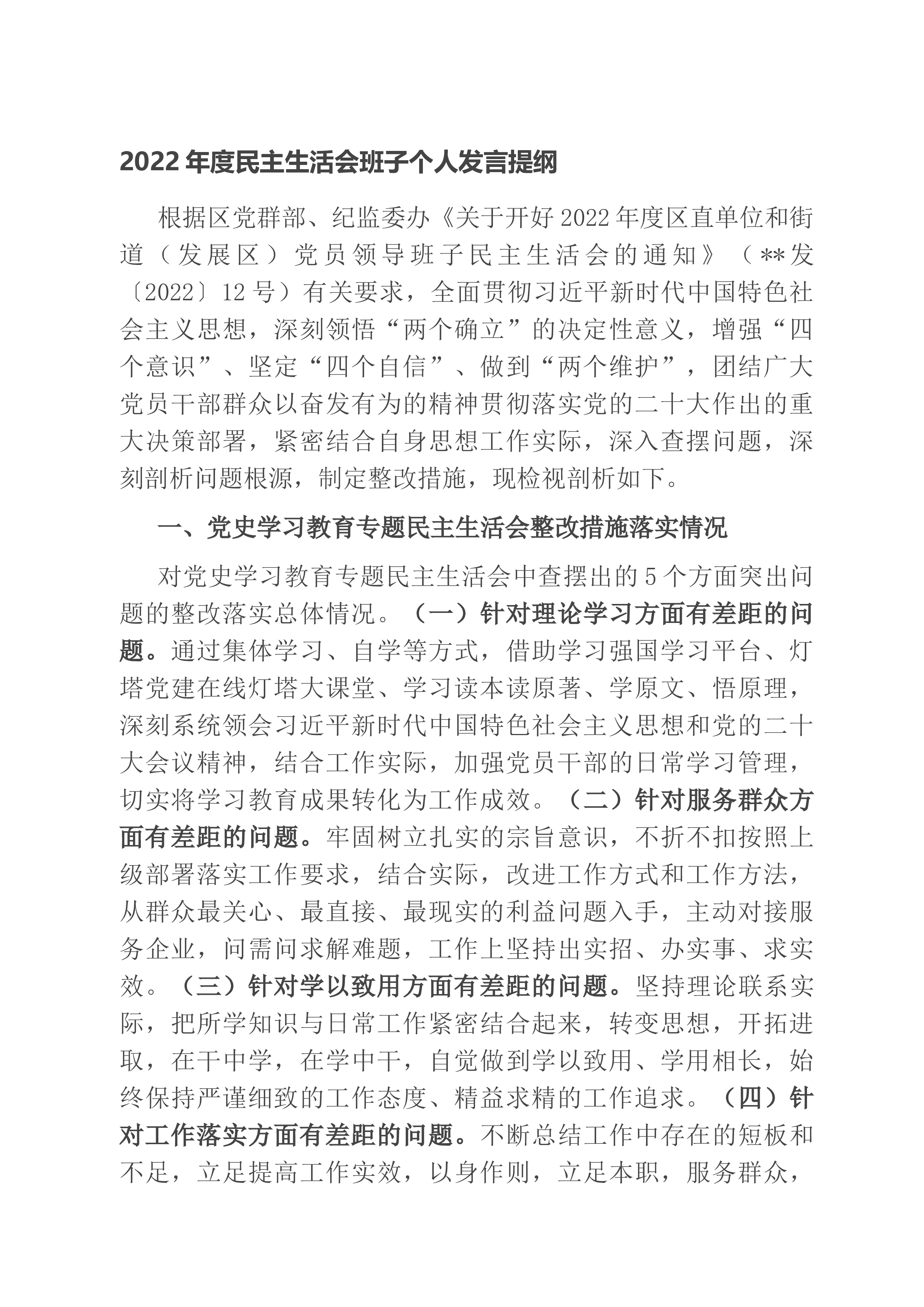 2022年度民主生活会班子个人发言提纲根据区党群部、纪监委办《关于开好2022年度区直单位和街道(发展区)党员