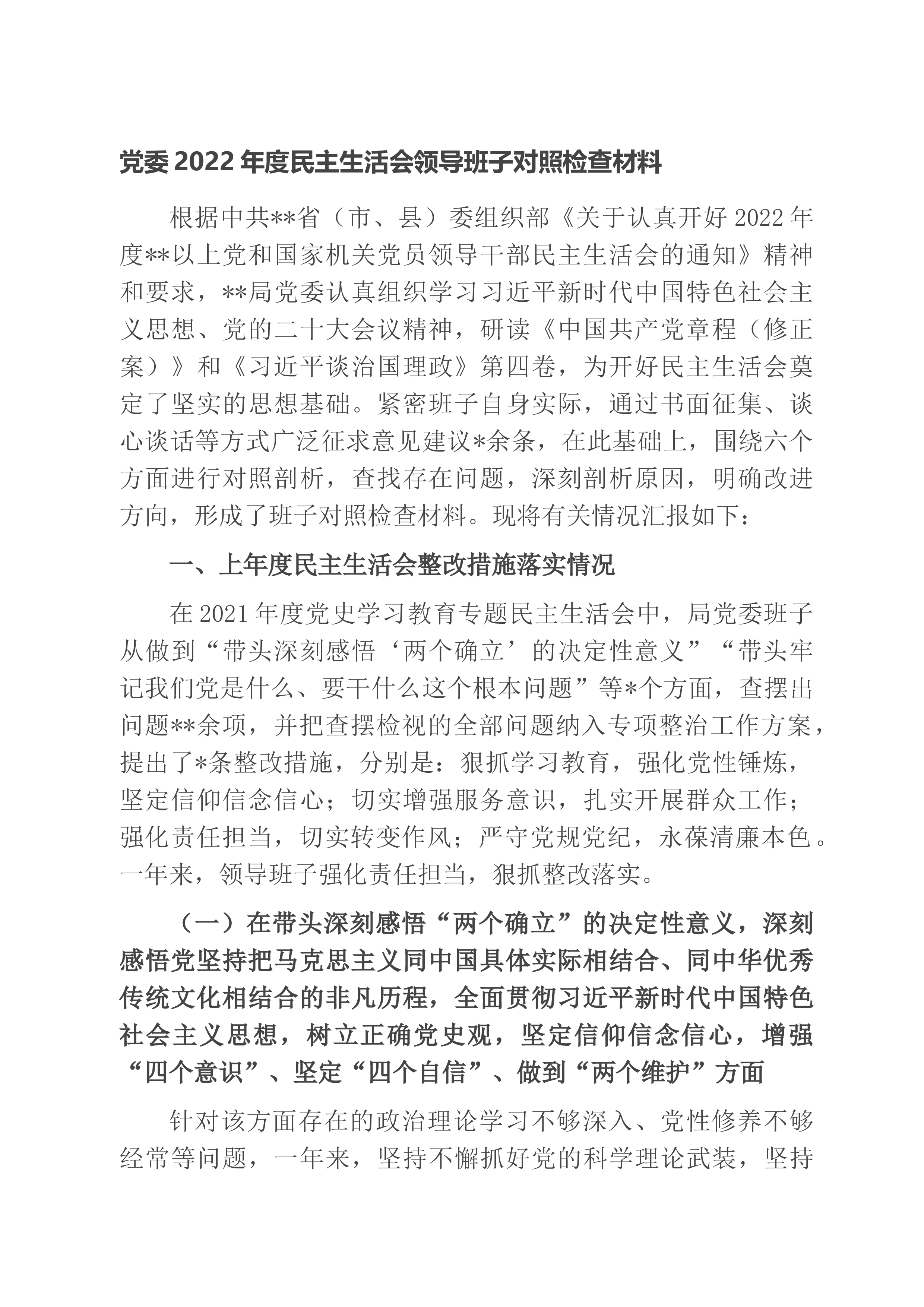 对照检查材料根据中共**省(市、县)委组织部《关于认真开好2022年度**以上党和国家机关党员领导干部民主生活会的通知》精神和要求,**局党委认真组织学习习近平新时代中国特色社会主义思想、党的二十大会议精神,研读《中国共产党章程(修正案)》和《习近平谈治国理政》第四卷,为开好民主生活会奠定了坚实的思想基础。紧密班子自身实际,通过书面征集、谈心谈话等方式广泛征求意见建议*余条,在此基础上,围绕六个方面进行对照剖析,查找存在问题,深刻剖析原因,明确改进方向,形成了班子对照检查材料。现将有关情况汇报如下:一、上年度民主生活会整改措施落实情况在2021年度党史学习教育...