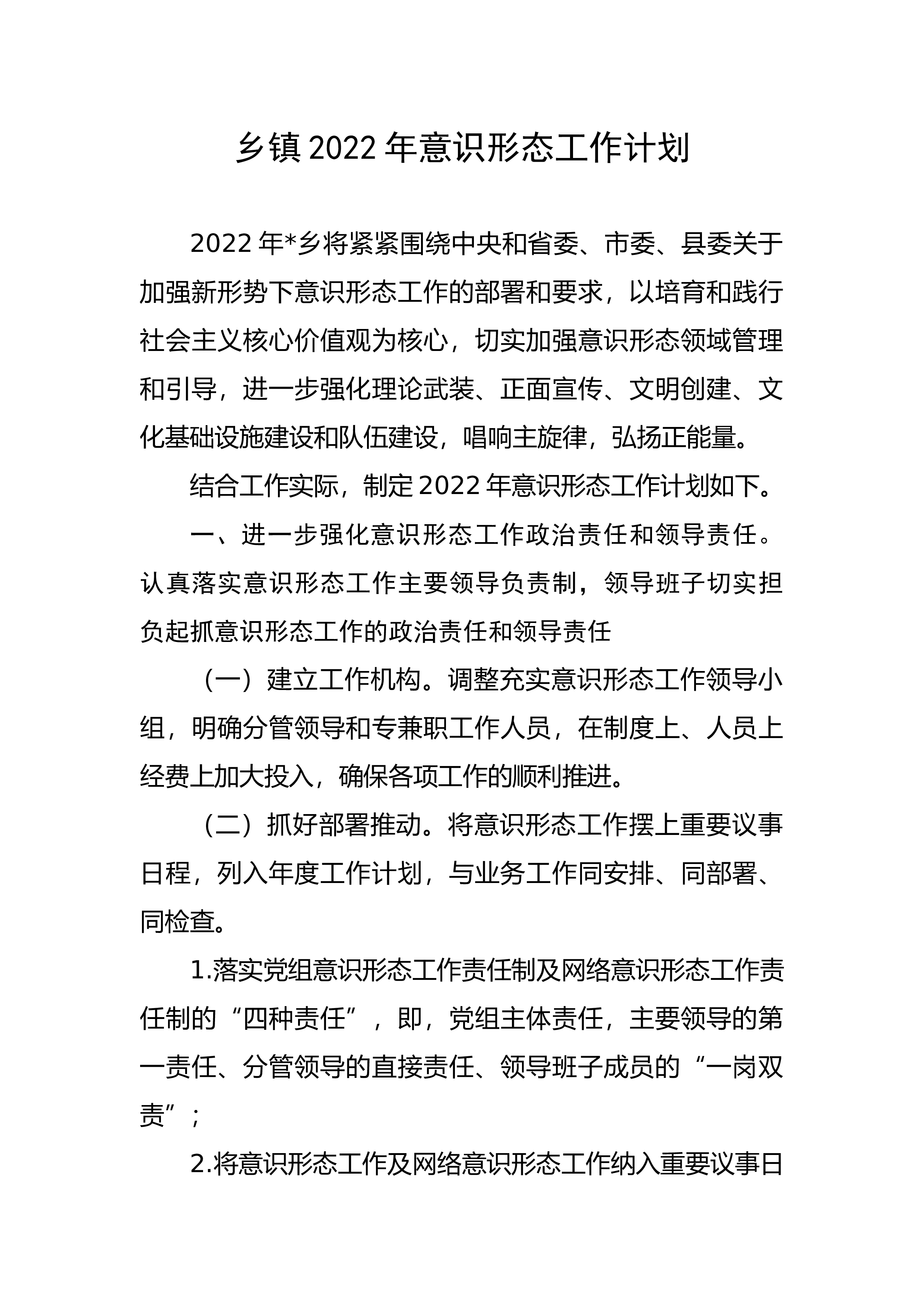 乡镇2022年意识形态工作计划2022年*乡将紧紧围绕中央和省委、市委、县委关于加强新形势下意识形态工作的部署和要求,以培育和践行社会主义核心价值观为核心,切实加强意识形态领域管理和引导,进一步强化理论武装、正面宣传、文明创建、文化基础设施建设和队伍建设,唱响主旋律,弘扬正能量。结合工作实际,制定2022年意识形态工作计划如下。一、进一步强化意识形态工作政治责任和领导责任。认真落实意识形态工作主要领导负责制,