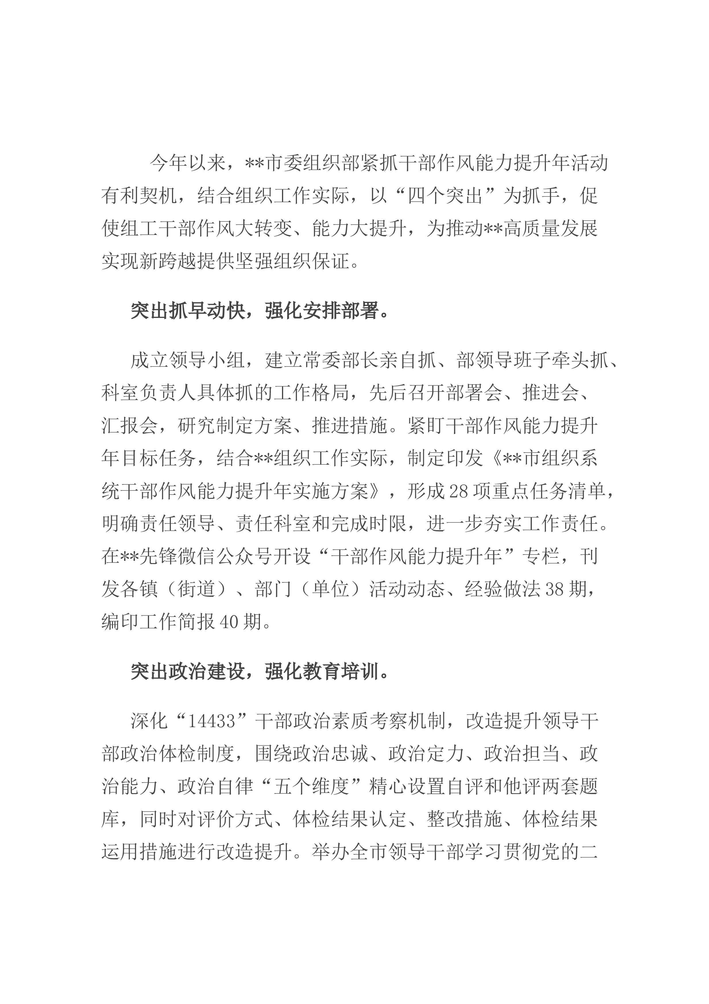 今年以来,**市委组织部紧抓干部作风能力提升年活动有利契机,结合组织工作实际,以“四个突出”为抓手,促使组工干部作风大转变、能力大提升,为推动**高质量发展实现新跨越提供坚强组织保证。突出抓早动快,强化安排部署。成立领导小组,建立常委部长亲自抓、部