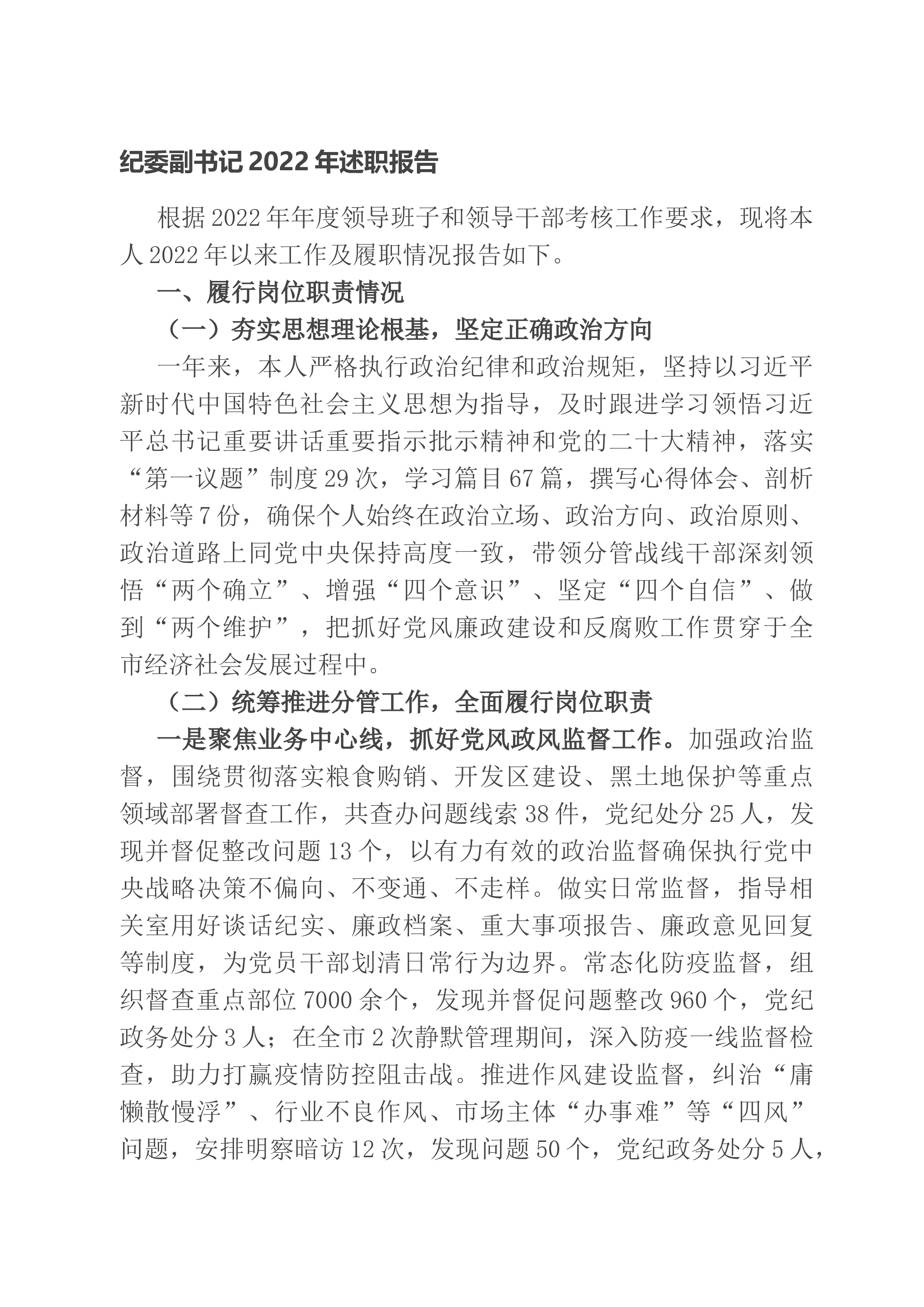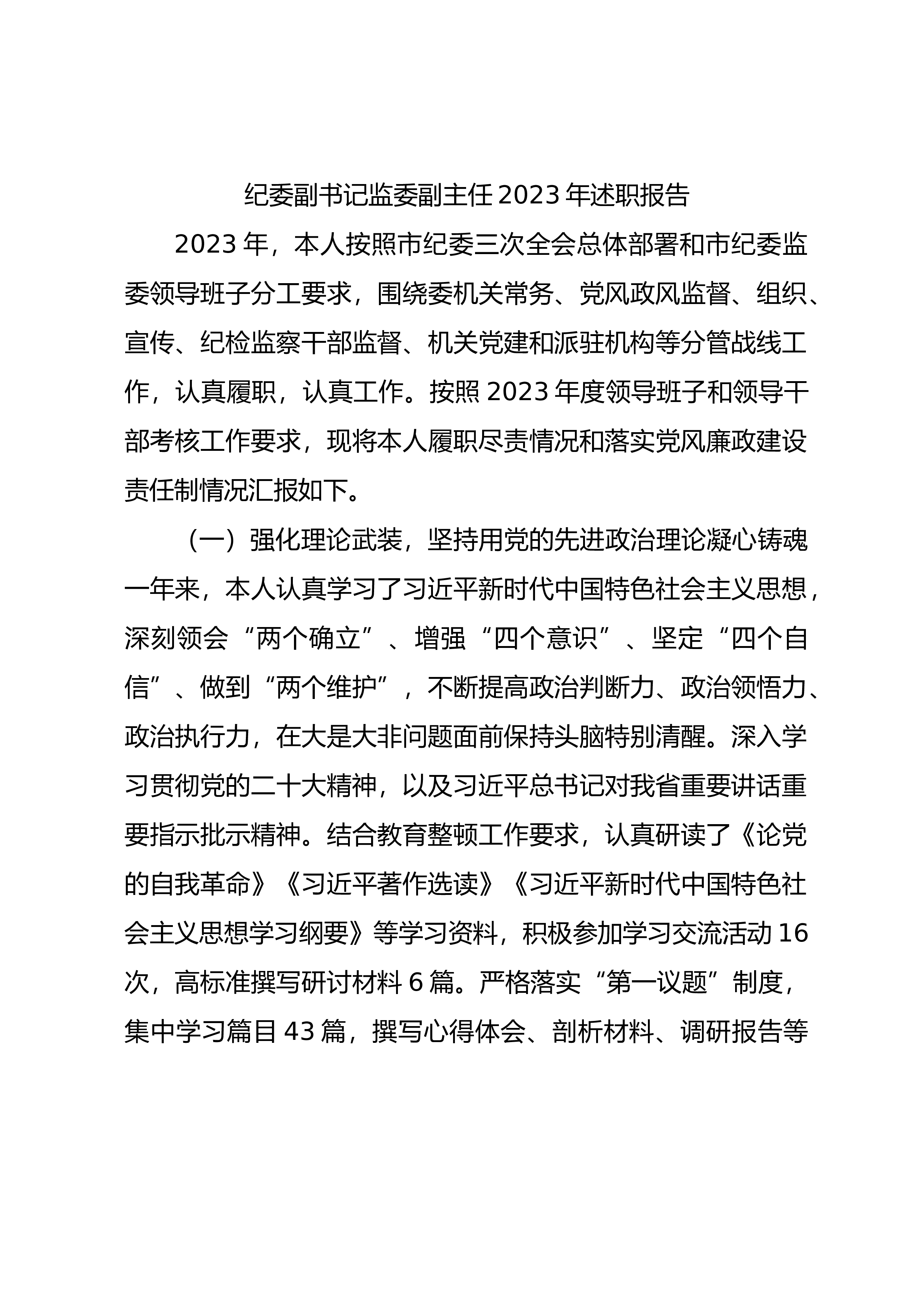 纪委副书记监委副主任2023年述职报告2023年,本人按照市纪委三次全会总体部署和市纪委监委