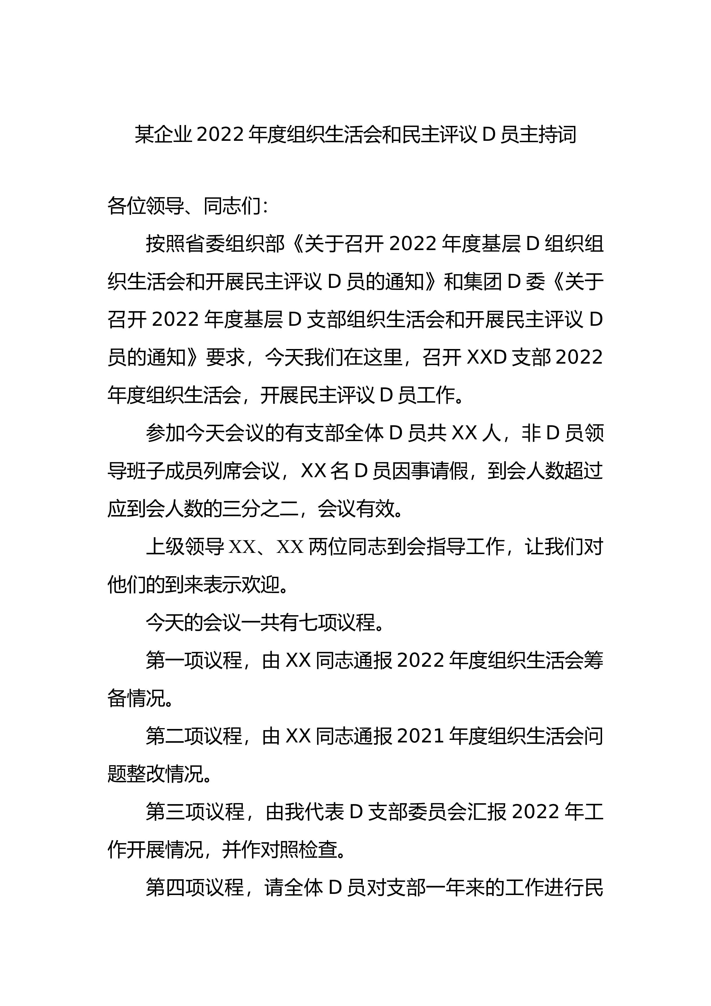 某企业2022年度组织生活会和民主评议D员主持词各位领导、同志们:按照省委组织部《关于召开2022年度基层D组织组织生活会和开展民主评议D员的通知》和集团D委《关于召开2022年度基层D支部组织生活会和开展民主评议D员的通知》要求,今天我们在这里,召开XXD支部2022年度组织生活会,开展民主评议D员工作。参加今天会议的有支部全体D员共XX人,非D员