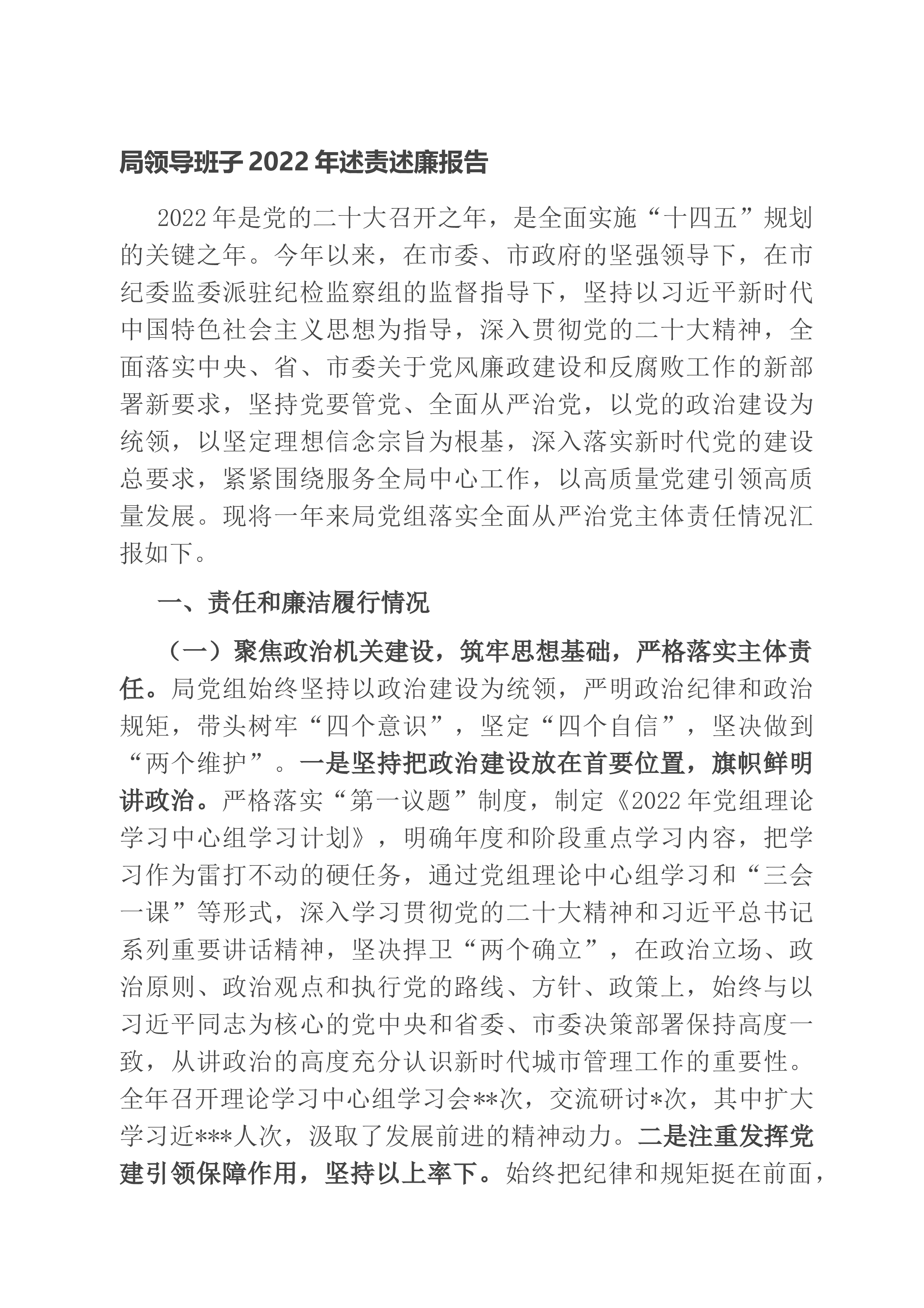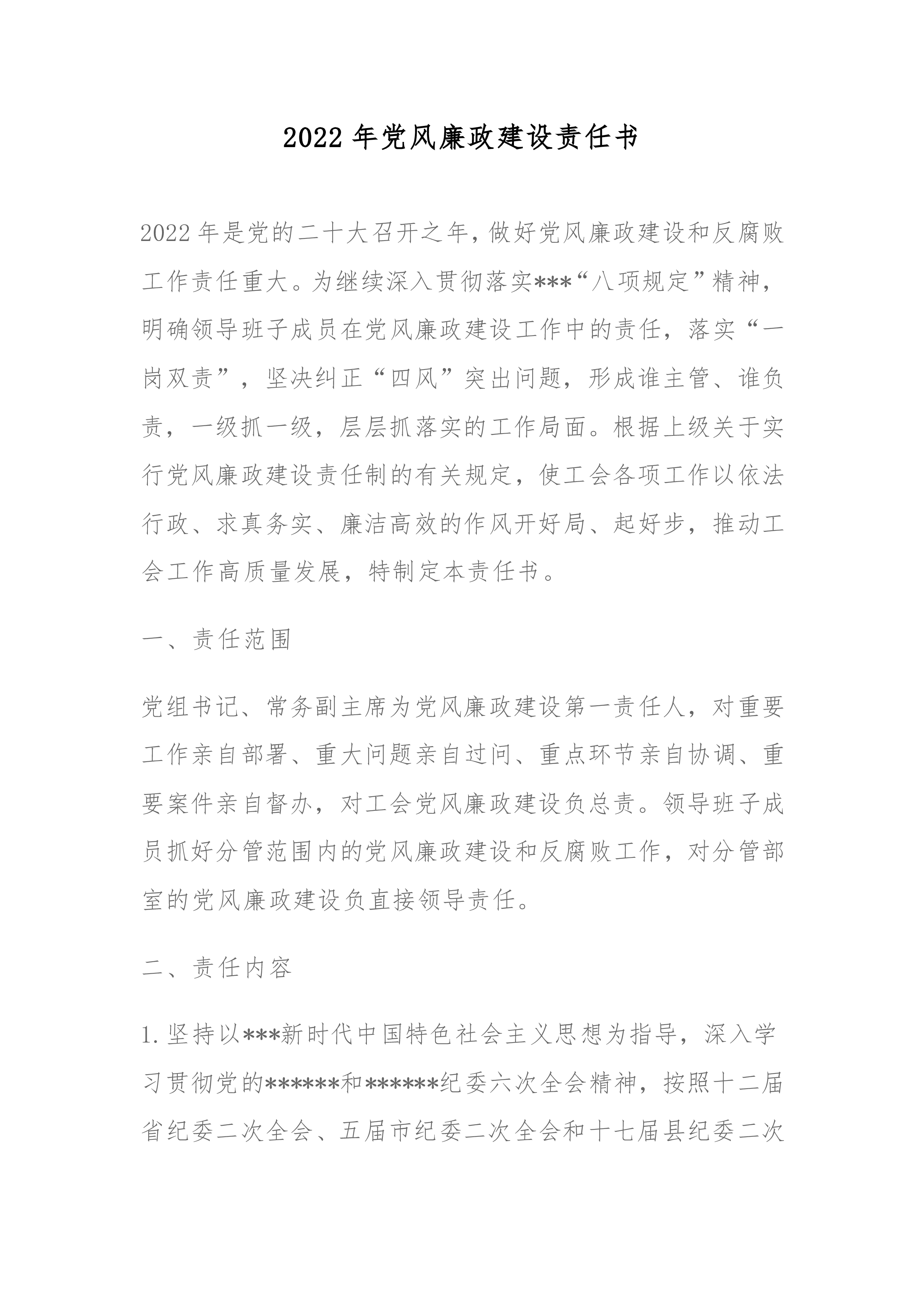 2022年党风廉政建设责任书2022年是党的二十大召开之年,做好党风廉政建设和反腐败工作责任重大。为继续深入贯彻落实***“八项规定”精神,明确领导班子成员在党风廉政建设工作中的责任,落实“一岗双责”,坚决纠正“四风”突出问题,形成谁主管、谁负责,一级抓一级,层层抓落实的工作局面。根据上级关于实行党风廉政建设责任制的有关规定,使工会各项工作以依法行政、求真务实、廉洁高效的作风开好局、起好步,推动工会工作高质量发展,特制定本责任书。一、责任范围党组书记、常务副主席为党风廉政建设第一责任人,对重要工作亲自部署、重大问题亲自过问、重点环节亲自协调、重要案件亲自督办,对工会党风廉政建设负总责。领导班子...