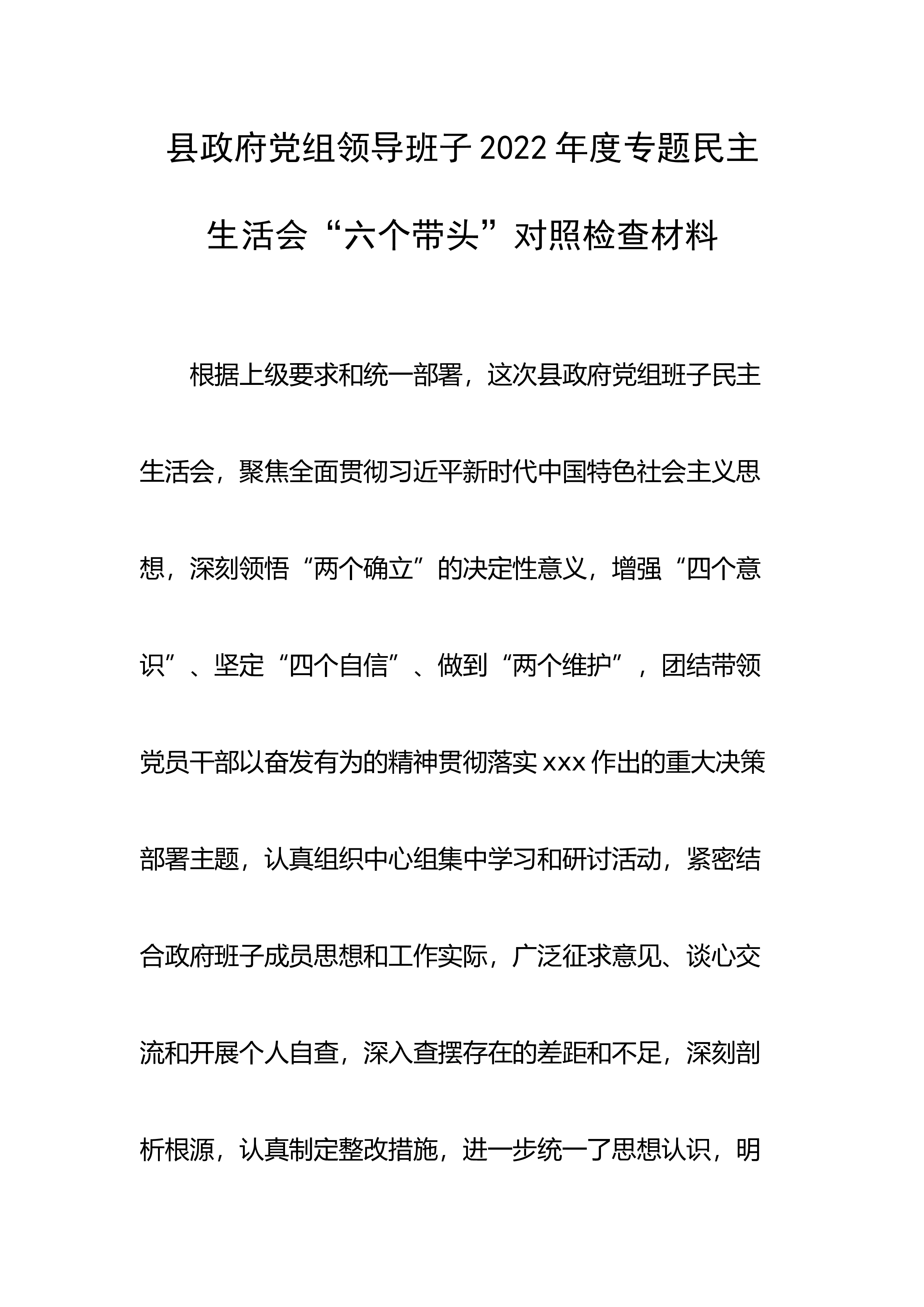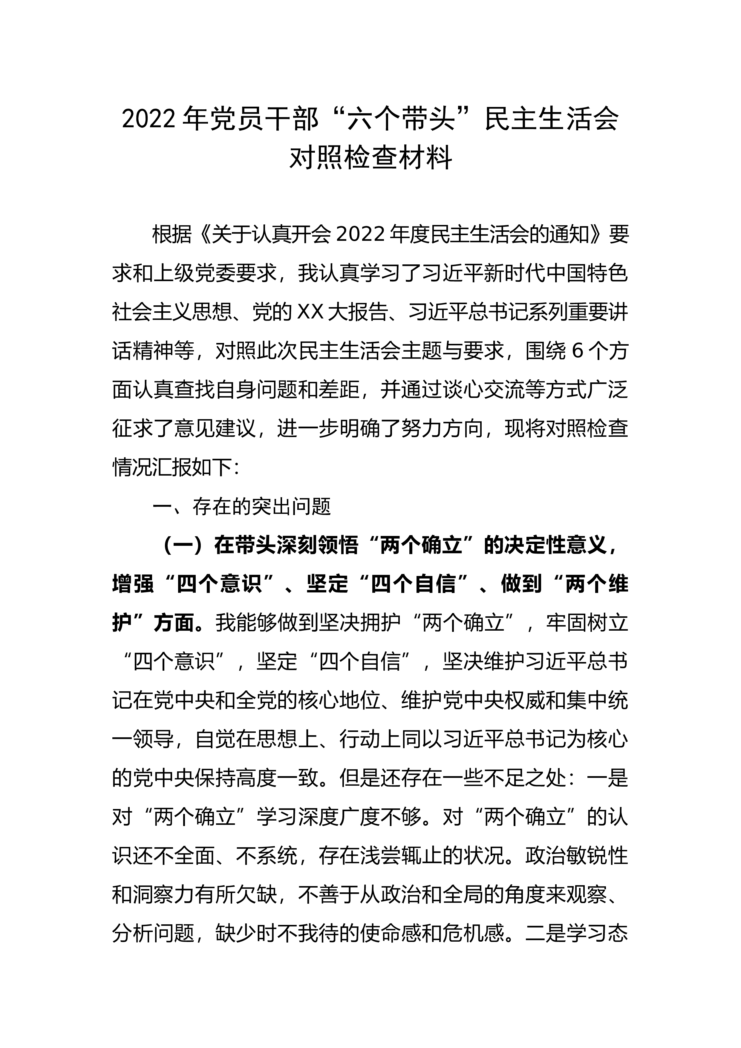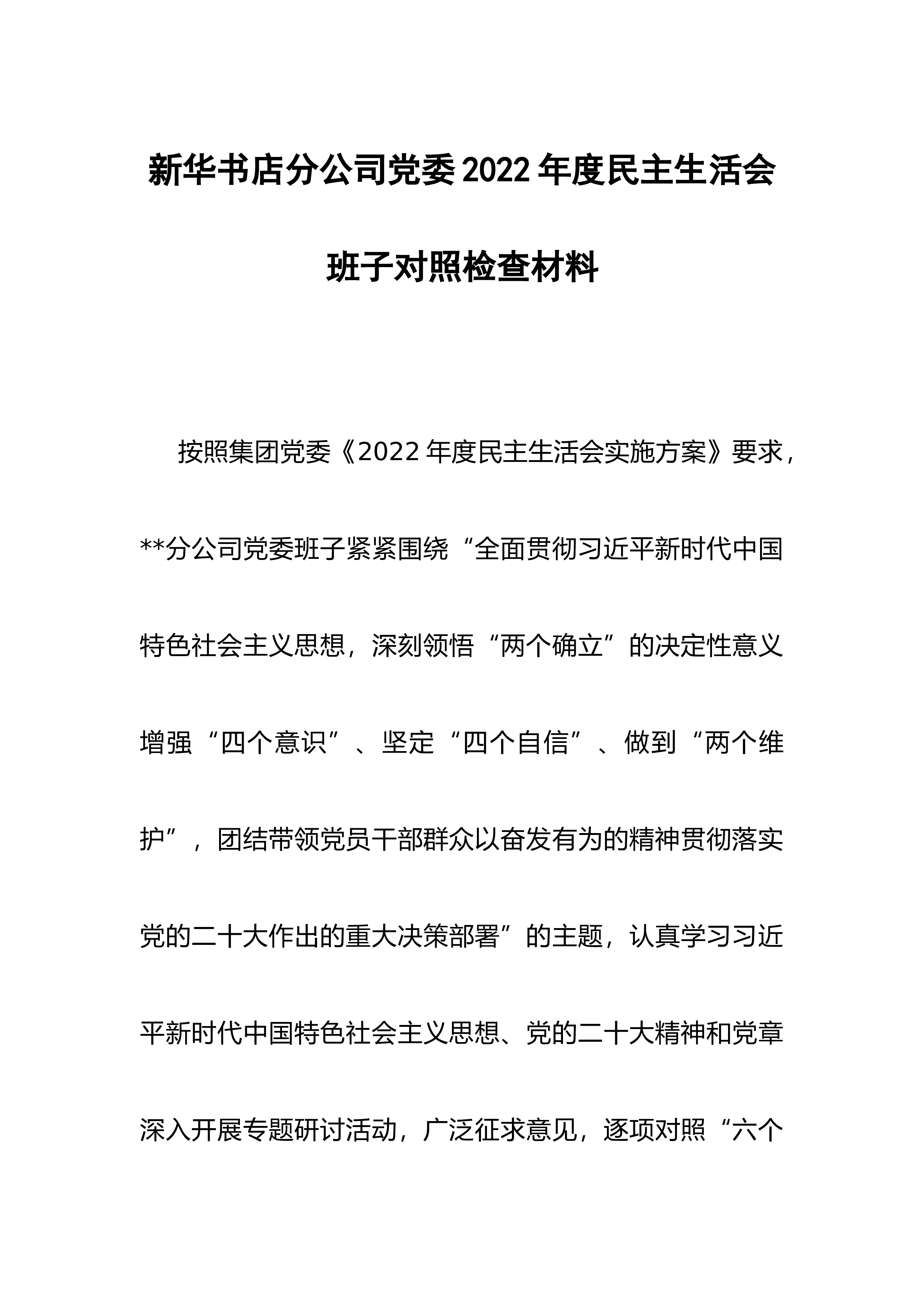 2022年度企业领导班子六个带头民主生活会对照检查材料根据《关于开好2022年度党员领导干部民主生活会的通知》文件要求,公司党委高度重视、精心准备,坚持问题导向,严字当头,严格按照会议主题,通过制定民主生活会实施方案、深入学习理论、开展谈心谈话、广泛征求意见建议,围绕六个方面进行对照检查,查找存在问题,深刻剖析原因,明确改进方向。下面,按照民主生活会相关要求,现将公司班子对照检查情况报告如下:一、2022年度民主生活会会前准备情况为高标准、高质量开好此次民主生活会,公司班子严格按照上级相关要求,围绕会议主题,精心组织安排,认真进行会前准备工作。(一)制定实施方案。根据上级《关于开好2022年度...
