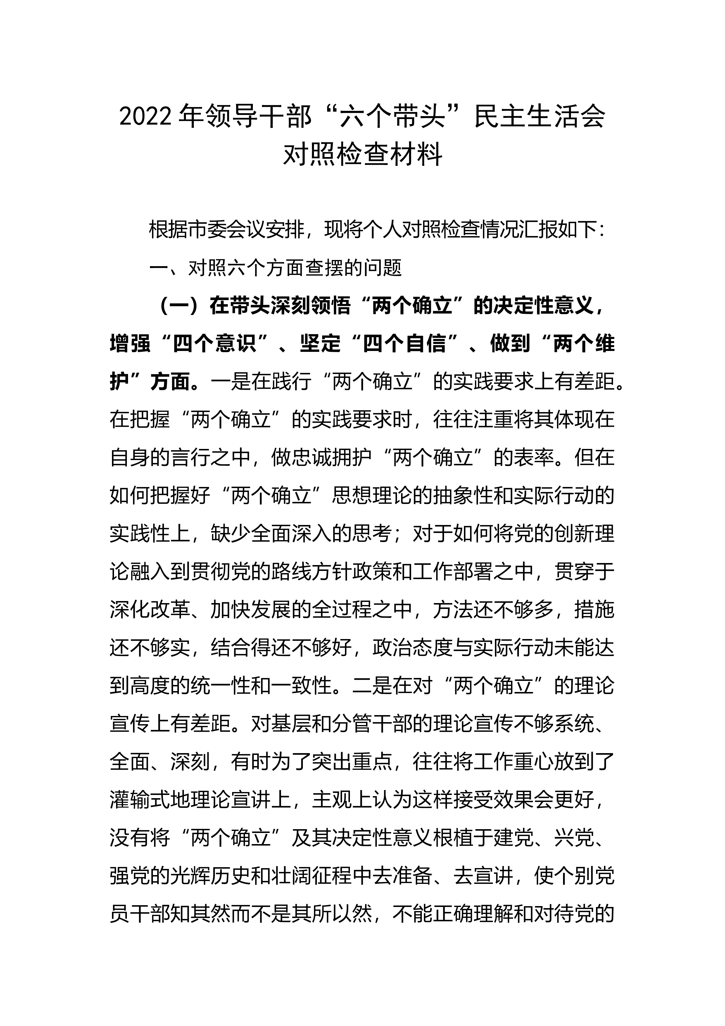 ”对照检查材料按照中央和省市部署要求,我紧紧围绕这次专题民主生活会的主题,在前期系统领会习近平新时代中国特色社会主义思想的基础上,又深入学习了XX精神、党章、习近平总书记在xx上的重要讲话以及规定篇目,进一步提升政治站位、牢固理论根基。同时,采取座谈交流、走访调研、谈心交心等方式,广泛征求意见建议,认真对照带头深刻感悟“两个确立”的决定性意义等六个方面,紧密联系个人思想和工作实际,深入查摆问题、剖析原因症结,制定整改措施。现将对照检查情况汇报如下: 一、存在的主要问题 (一)在带头深刻感悟“两个确立”的决定性意义,增强“四个意识”、坚定“四个...
