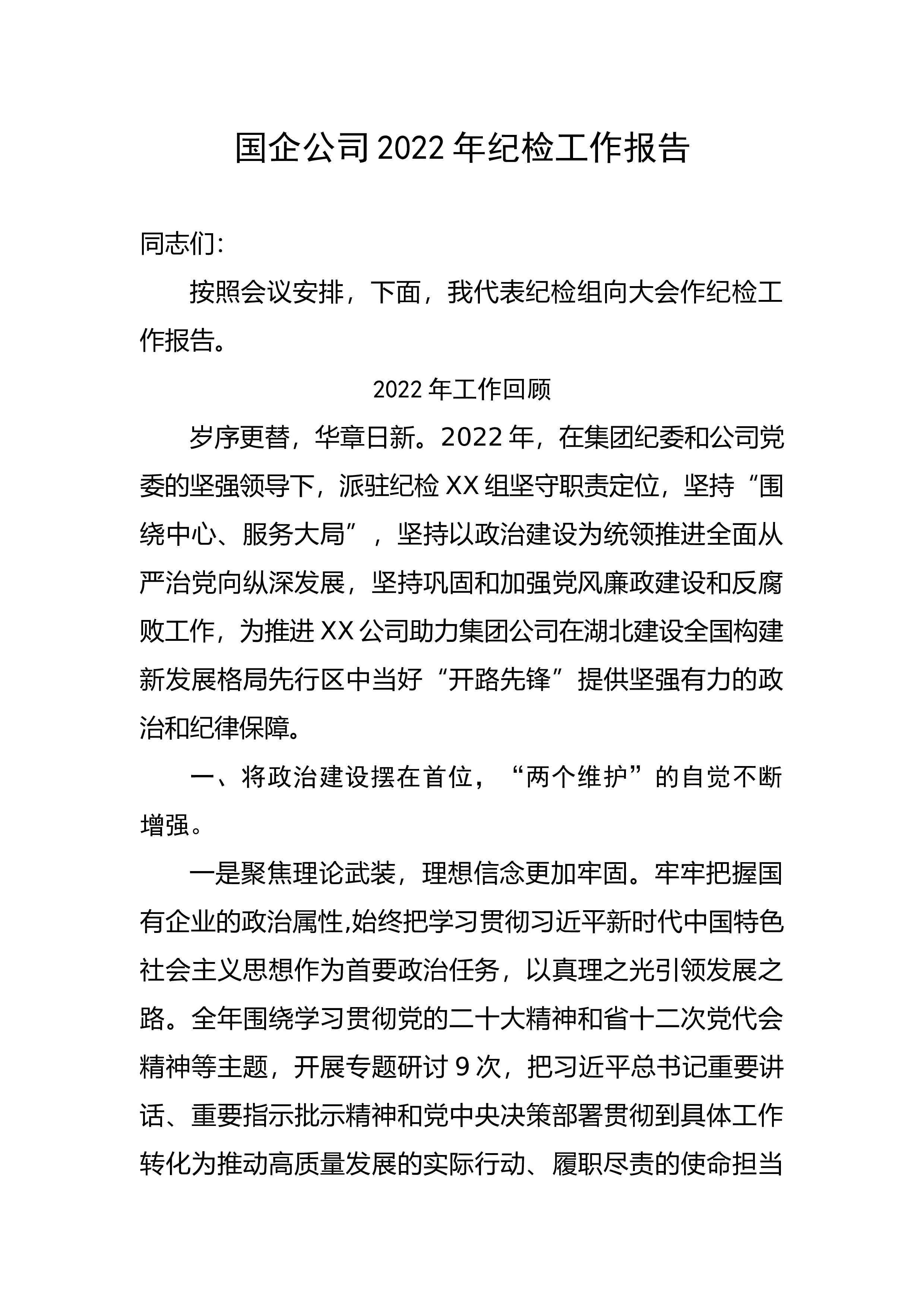 国企公司2022年纪检工作报告同志们:按照会议安排,下面,我代表纪检组向大会作纪检工作报告。2022年工作回顾岁序更替,华章日新。2022年,在集团纪委和公司党委的坚强领导下,派驻纪检XX组坚守职责定位,坚持“围绕中心、服务大局”,坚持以政治建设为统领推进全面从严治党向纵深发展,坚持巩固和加强党风廉政建设和反腐败工作,为推进XX公司助力集团公司在湖北建设全国构建新发展格局先行区中当好“开路先锋”提供坚强有力的政治和纪律保障。一、将政治建设摆在首位,“两个维护”的自觉不断增强。一是聚焦理论武装,理想信念更加牢固。牢牢把握国有企业的政治属性,始终把学习贯彻习近平新时代中国特色社会主义思想作为首要政...