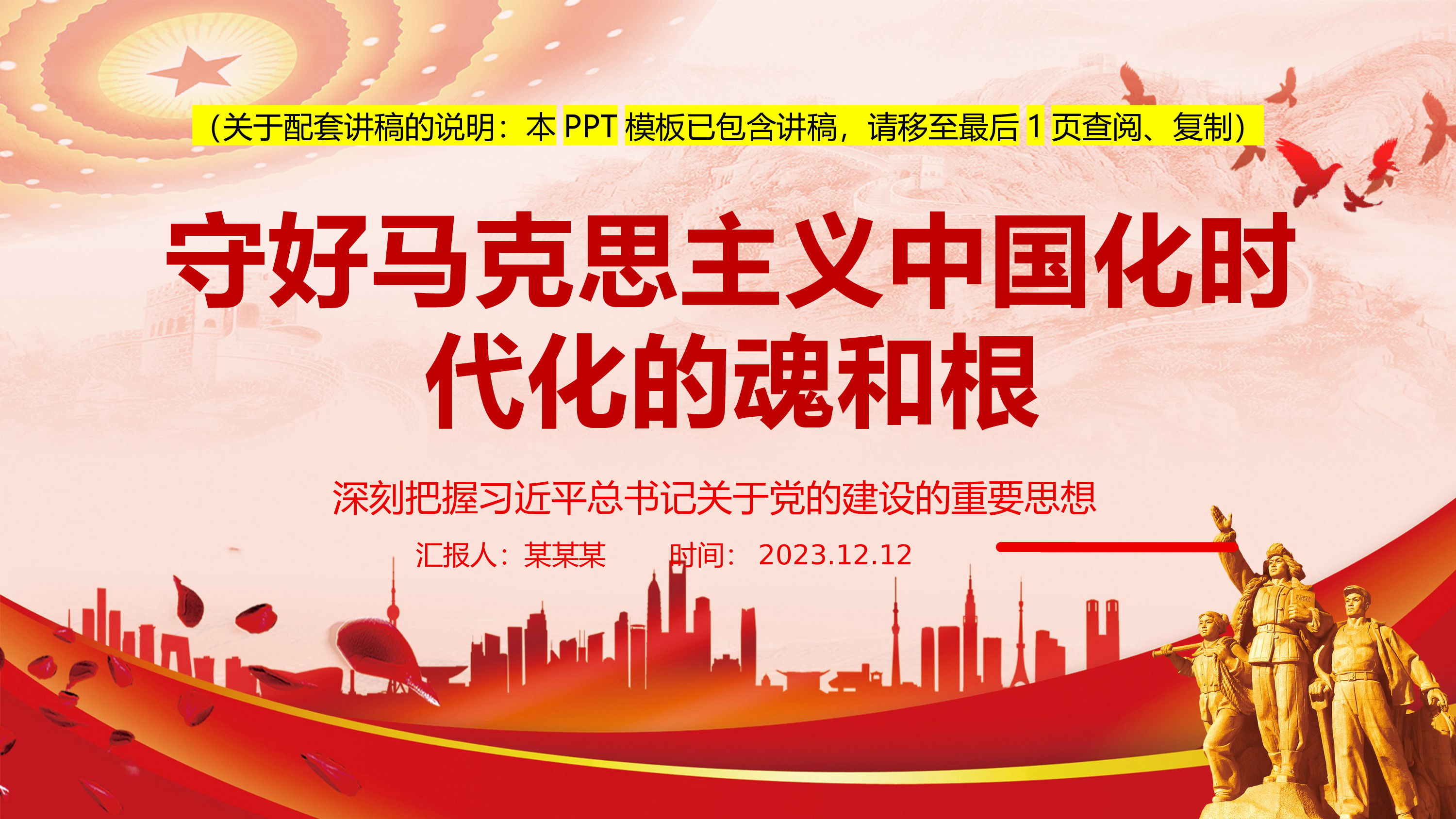 汇报人:某某某时间:2023.12.12守好马克思主义中国化时代化的魂和根深刻把握习近平总书记关于党的建设的重要思想(关于配套讲稿的说明:本PPT模板已包含讲稿,请移至最后1页查阅、复制)0导0读习近平总书记在主持中共中央政治局第六次集体学习时强调:“马克思主义中国化时代化这个重大命题本身就决定,我们决不能抛弃马克思主义这个魂脉,决不能抛弃中华优秀传统文化这个根脉。坚守好这个魂和根,是理论创新的基础和前提。”这一重大论断,揭示了马克思主义在中国创新发展的内在机理,党对马克思主义中国化时代化规律性认识达到新的高度,为新征程继续推进实践基础上的理论创新指明了方向,提供了根本遵循。0目0录一、马克思...