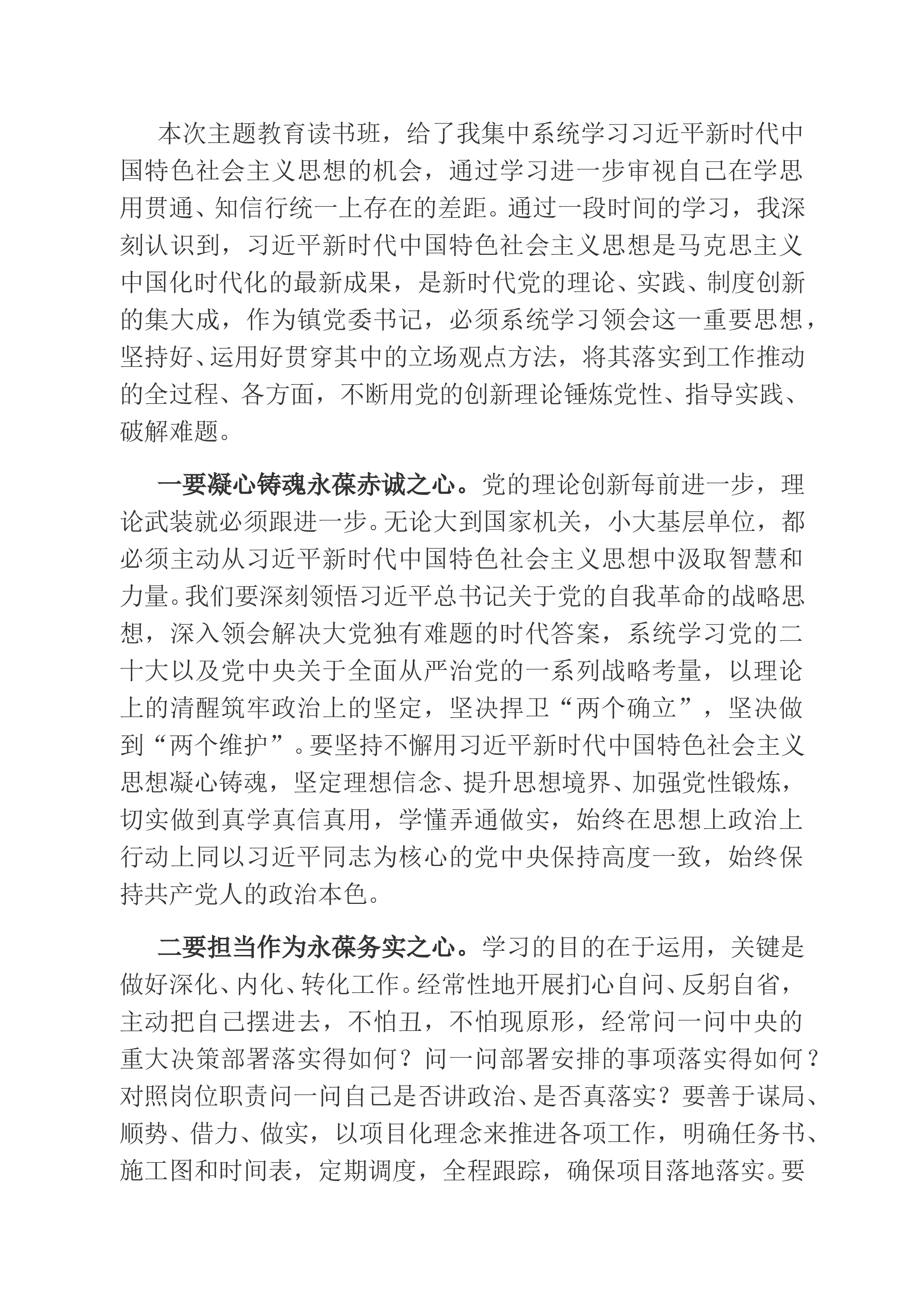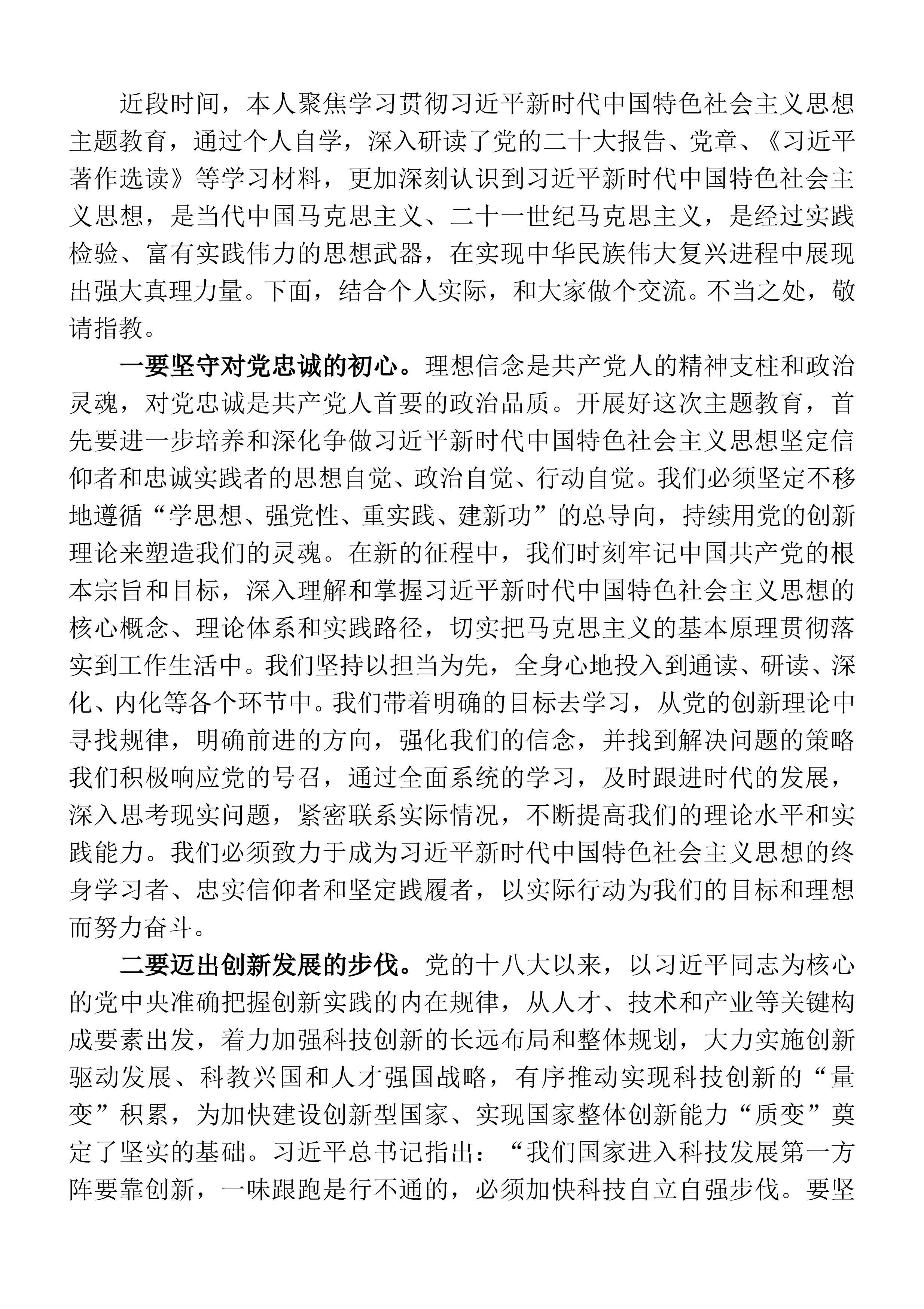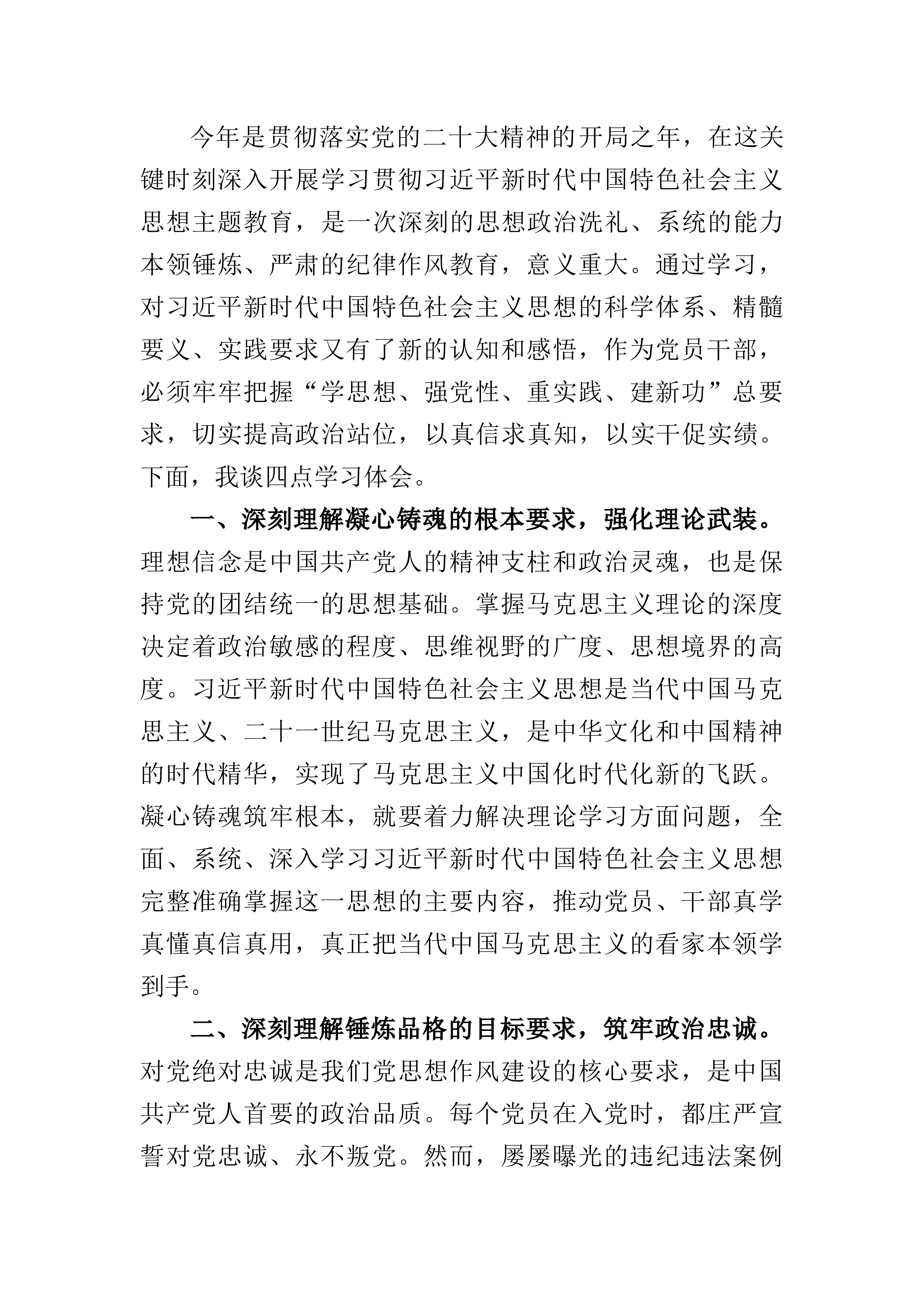 今年是贯彻落实党的二十大精神的开局之年,在这关键时刻深入开展学习贯彻习近平新时代中国特色社会主义思想主T教育,是一次深刻的思想政治洗礼、系统的能力本领锤炼、严肃的纪律作风教育,意义重大。通过学习,对习近平新时代中国特色社会主义思想的科学体系、精髓要义、实践要求又有了新的认知和感悟,作为党员干部,必须牢牢把握“学思想、强党性、重实践、建新功”总要求,切实提高政治站位,以真信求真知,以实干促实绩。下面,我谈四点学习体会。一、深刻理解凝心铸魂的根本要求,强化理论武装。理想信念是中国共产党人的精神支柱和政治灵魂,也是保持党的团结统一的思想基础。掌握马克思主义理论的深度决定着政治敏感的程度、思维视野的广...