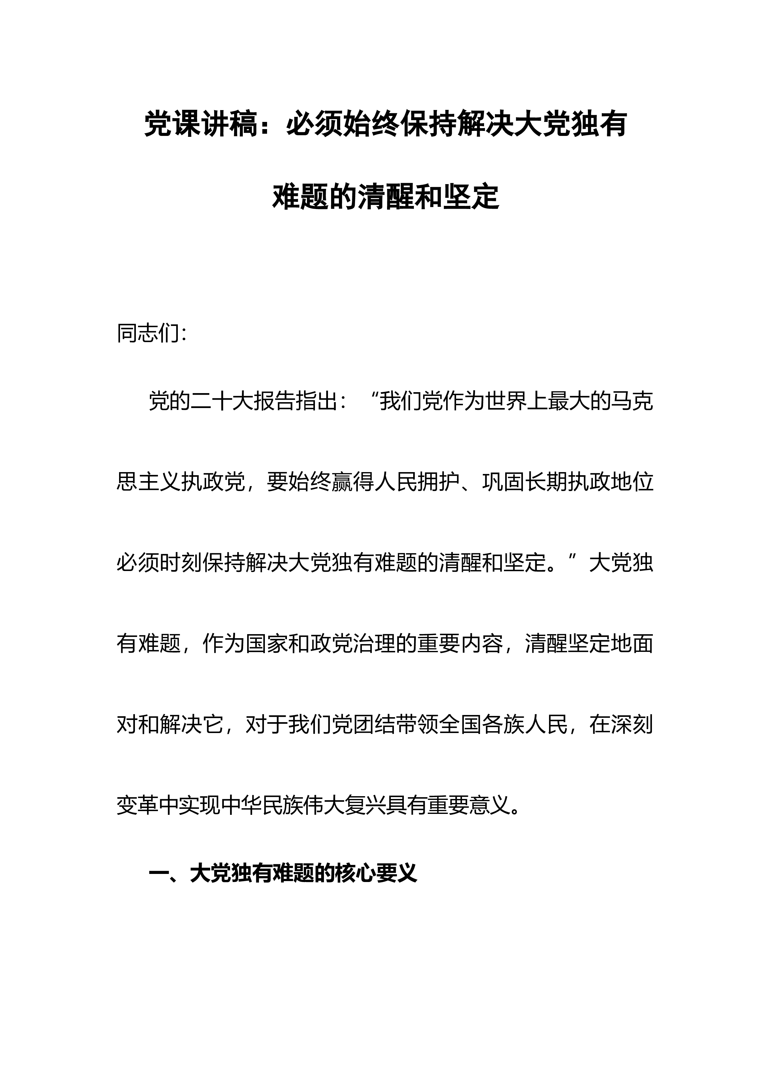 党课讲稿:必须始终保持解决大党独有难题的清醒和坚定同志们:党的二十大报告指出:“我们党作为世界上最大的马克思主义执政党,要始终赢得人民拥护、巩固长期执政地位必须时刻保持解决大党独有难题的清醒和坚定。”大党独有难题,作为国家和政党治理的重要内容,清醒坚定地面对和解决它,对于我们党团结带领全国各族人民,在深刻变革中实现中华民族伟大复兴具有重要意义。一、大党独有难题的核心要义政党是近年来学术研究影响较大、频繁使用的热词,它是区分中西政体的重要标准,为分析新时代党的建设领域中的一系列问题提供了独特视角,因此政党回应环境变化的能力受到较多关注。历经百年风雨,中国共产党作为具有全球影响力、且不同于西方政党...