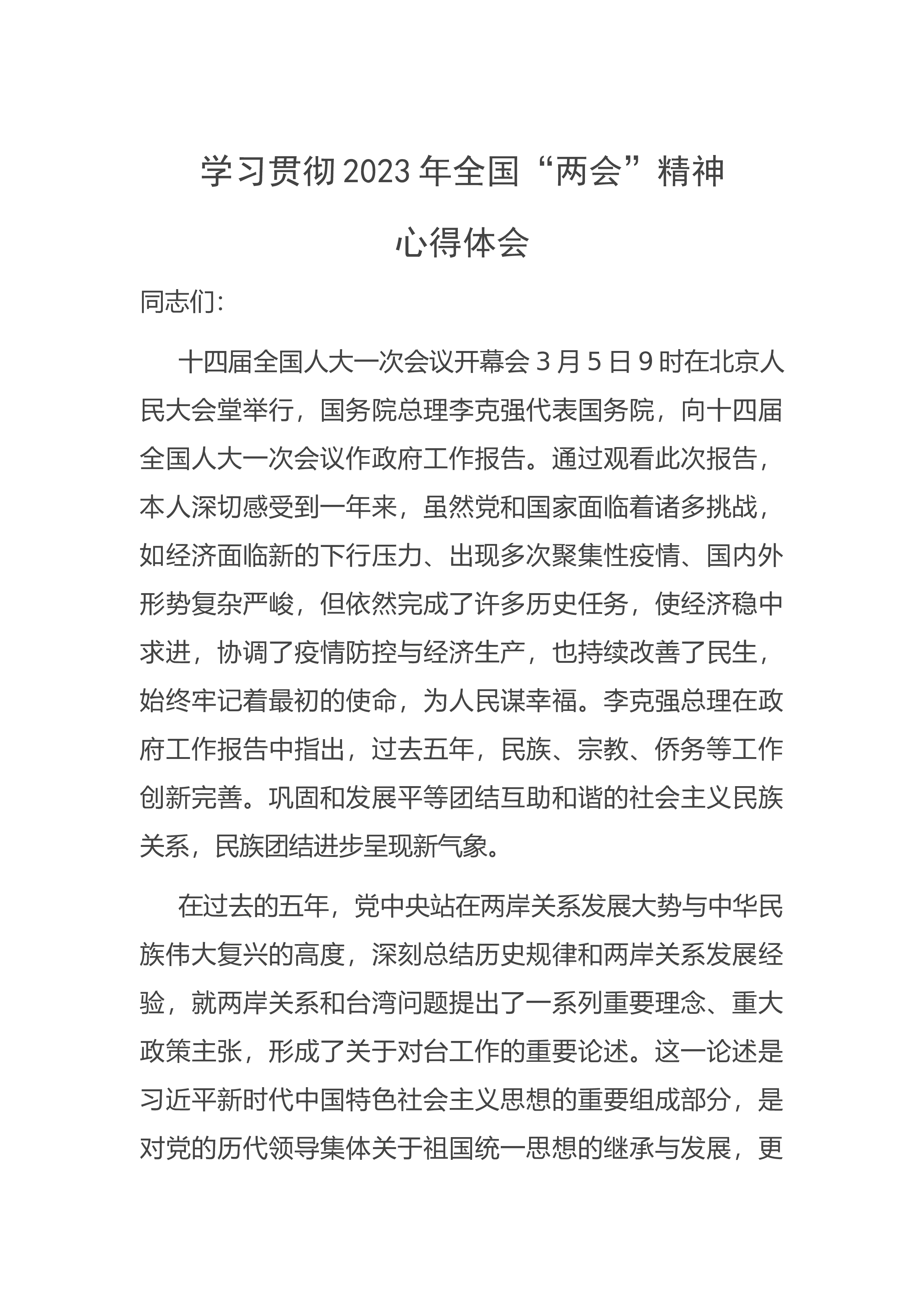 学习贯彻2023年全国“两会”精神心得体会同志们:十四届全国人大一次会议开幕会3月5日9时在北京人民大会堂举行,国务院总理李克强代表国务院,向十四届全国人大一次会议作政府工作报告。通过观看此次报告,本人深切感受到一年来,虽然党和国家面临着诸多挑战,如经济面临新的下行压力、出现多次聚集性疫情、国内外形势复杂严峻,但依然完成了许多历史任务,使经济稳中求进,协调了疫情防控与经济生产,也持续改善了民生,始终牢记着最初的使命,为人民谋幸福。李克强总理在政府工作报告中指出,过去五年,民族、宗教、侨务等工作创新完善。巩固和发展平等团结互助和谐的社会主义民族关系,