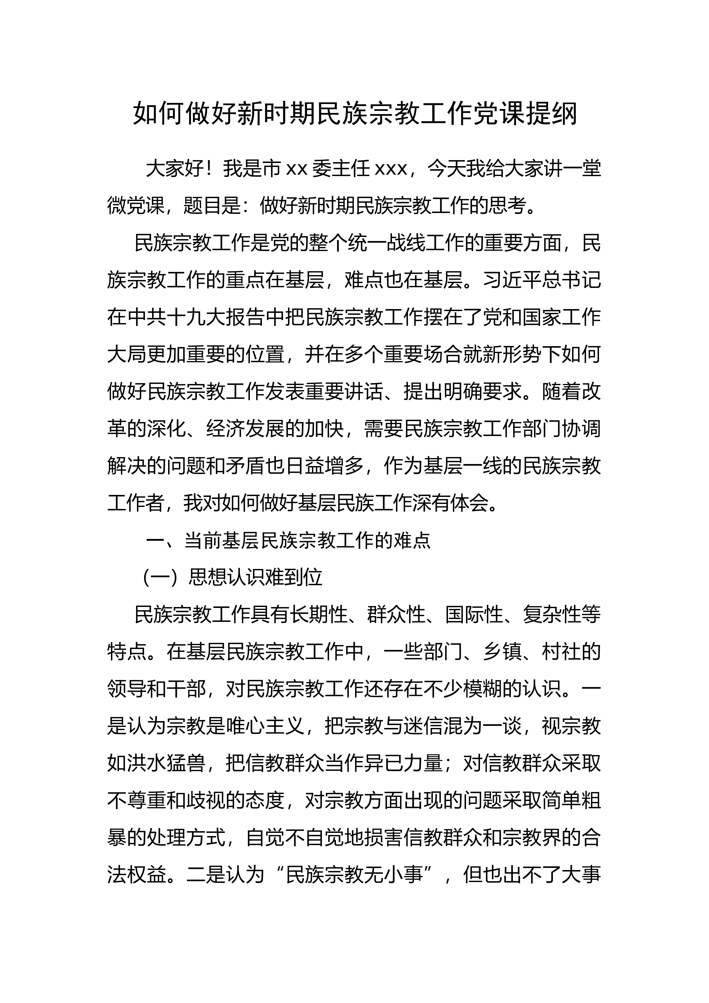 如何做好新时期民族宗教工作党课提纲大家好!我是市xx委主任xxx,今天我给大家讲一堂微党课,题目是:做好新时期民族宗教工作的思考。民族宗教工作是党的整个统一战线工作的重要方面,民族宗教工作的重点在基层,难点也在基层。习近平总书记在中共十九大报告中把民族宗教工作摆在了党和国家工作大局更加重要的位置,并在多个重要场合就新形势下如何做好民族宗教工作发表重要讲话、提出明确要求。随着改革的深化、经济发展的加快,需要民族宗教工作部门协调解决的问题和矛盾也日益增多,作为基层一线的民族宗教工作者,我对如何做好基层民族工作深有体会。一、当前基层民族宗教工作的难点(一)思想认识难到位民族宗教工作具有长期性、群众性...