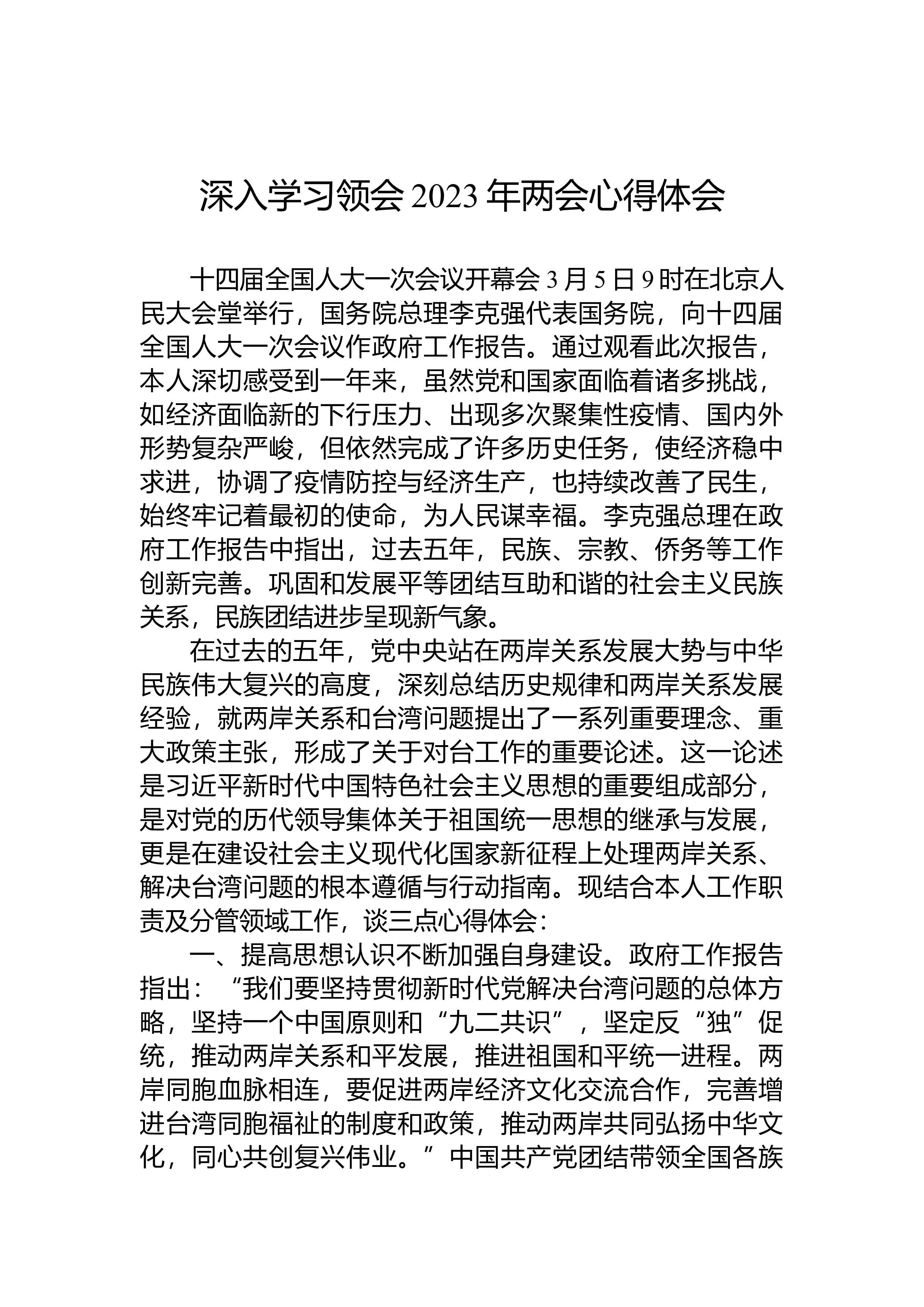 深入学习领会2023年两会心得体会十四届全国人大一次会议开幕会3月5日9时在北京人民大会堂举行,国务院总理李克强代表国务院,向十四届全国人大一次会议作政府工作报告。通过观看此次报告,本人深切感受到一年来,虽然党和国家面临着诸多挑战,如经济面临新的下行压力、出现多次聚集性疫情、国内外形势复杂严峻,但依然完成了许多历史任务,使经济稳中求进,协调了疫情防控与经济生产,也持续改善了民生,始终牢记着最初的使命,为人民谋幸福。李克强总理在政府工作报告中指出,过去五年,民族、宗教、侨务等工作创新完善。巩固和发展平等团结互助和谐的社会主义民族关系,