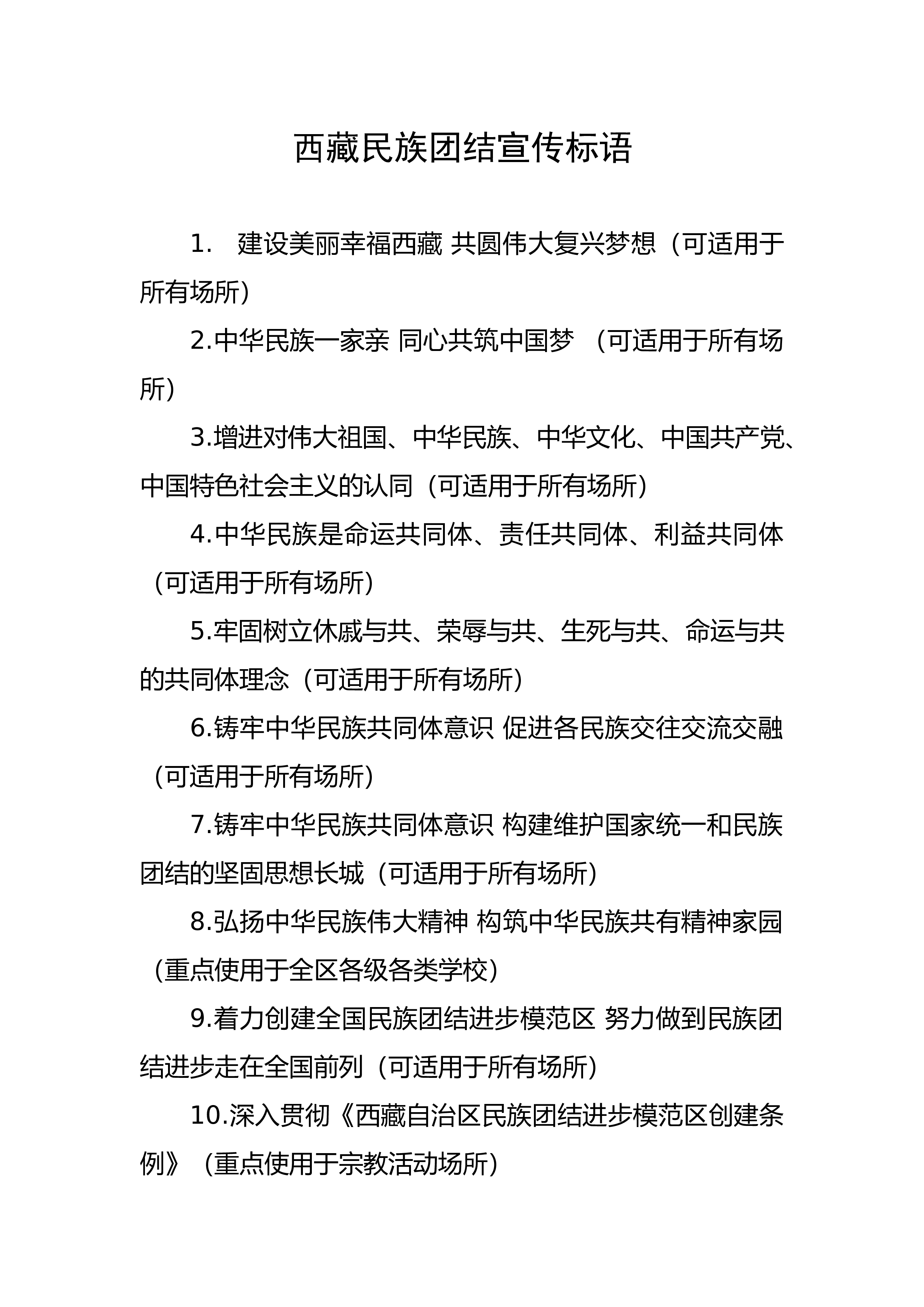 宣传标语1.建设美丽幸福西藏共圆伟大复兴梦想(可适用于所有场所)2.中华民族一家亲同心共筑中国梦(可适用于所有场所)3.增进对伟大祖国、中华民族、中华文化、中国共产党、中国特色社会主义的认同(可适用于所有场所)4.中华民族是命运共同体、责任共同体、利益共同体(可适用于所有场所)5.牢固树立休戚与共、荣辱与共、生死与共、命运与共的共同体理念(可适用于所有场所)6.铸牢中华民族共同体意识促进各民族交往交流交融(可适用于所有场所)7.铸牢中华民族共同体意识构建维护国家统一和