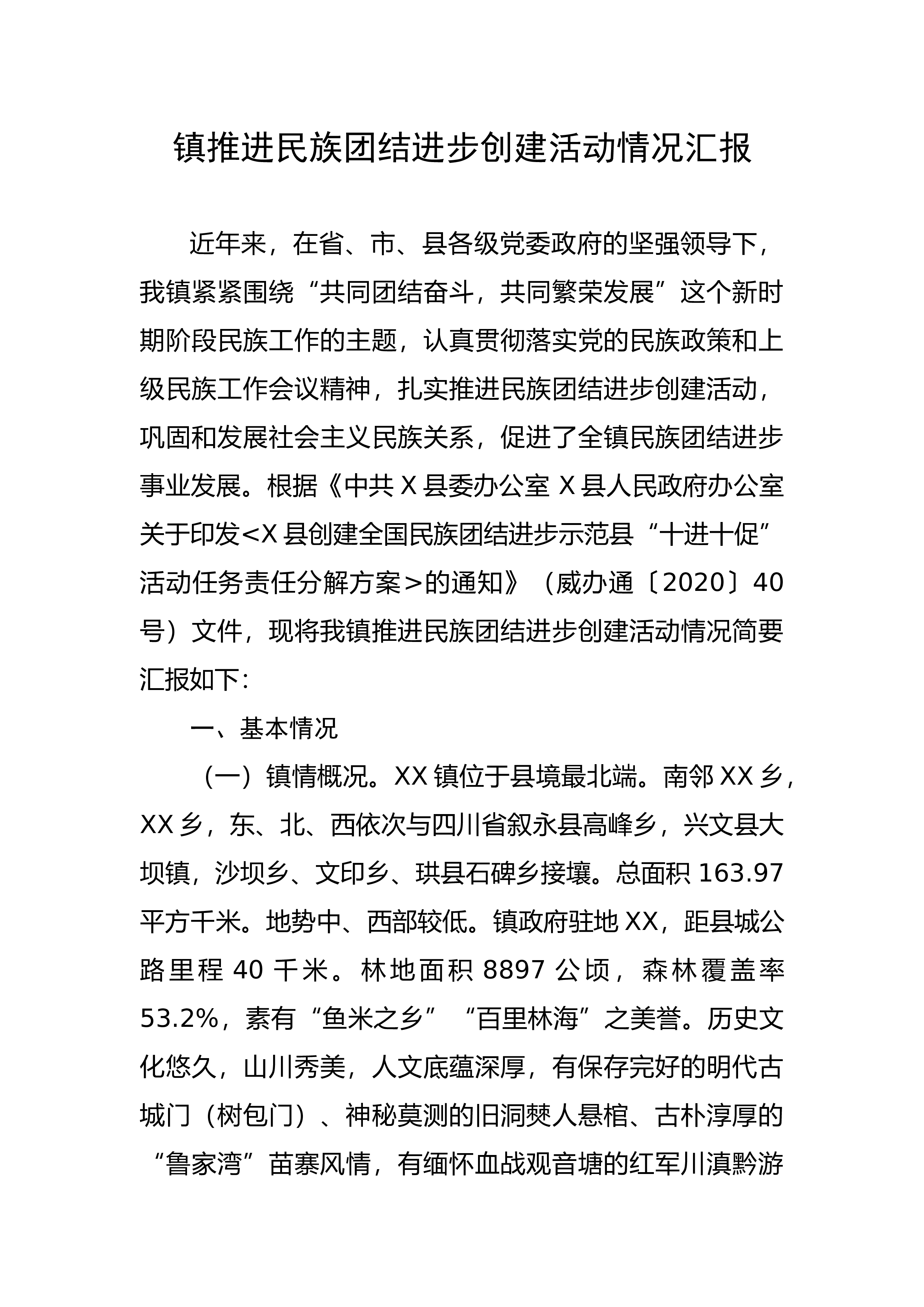 进步创建活动情况汇报近年来,在省、市、县各级党委政府的坚强领导下,我镇紧紧围绕“共同团结奋斗,共同繁荣发展”这个新时期阶段民族工作的主题,认真贯彻落实党的民族政策和上级民族工作会议精神,扎实推进