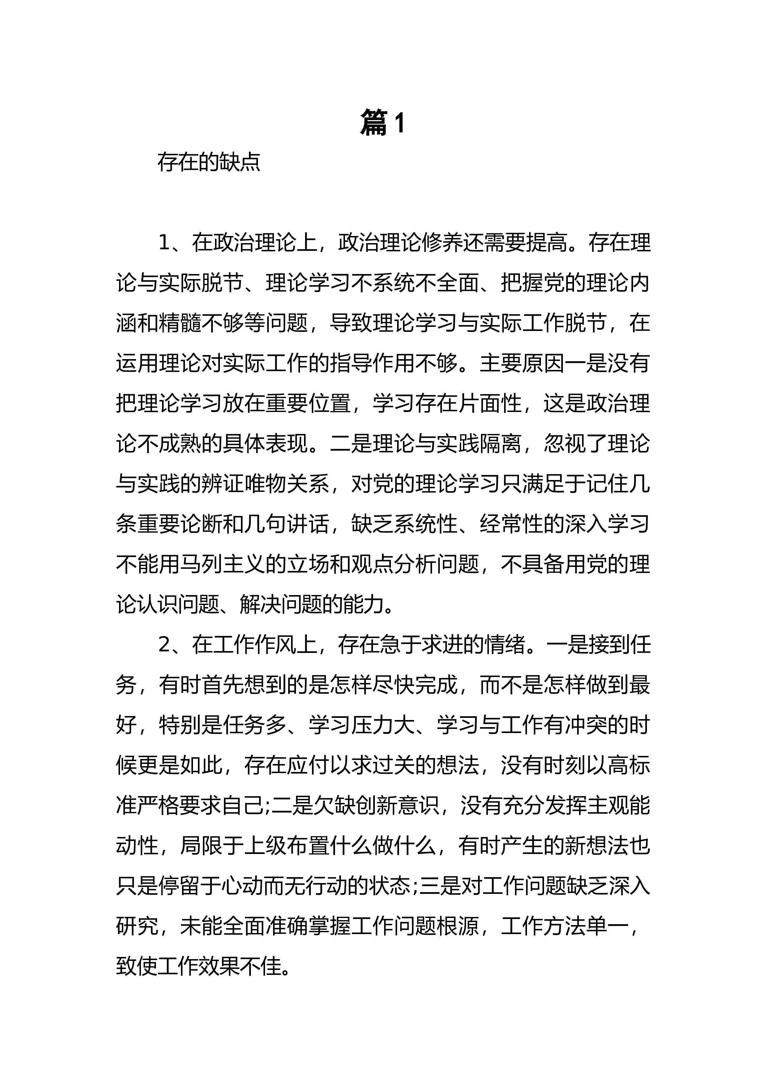 篇1 存在的缺点 1、在政治理论上,政治理论修养还需要提高。存在理论与实际脱节、理论学习不系统不全面、把握党的理论内涵和精髓不够等问题,导致理论学习与实际工作脱节,在运用理论对实际工作的指导作用不够。主要原因一是没有把理论学习放在重要位置,学习存在片面性,这是政治理论不成熟的具体表现。二是理论与实践隔离,忽视了理论与实践的辨证唯物关系,对党的理论学习只满足于记住几条重要论断和几句讲话,缺乏系统性、经常性的深入学习不能用马列主义的立场和观点分析问题,不具备用党的理论认识问题、解决问题的能力。 2、在工作作风上,存在急于求进的情绪。一是接到任务,有时首先想到的是怎样尽快完成,而不是怎样做到最...