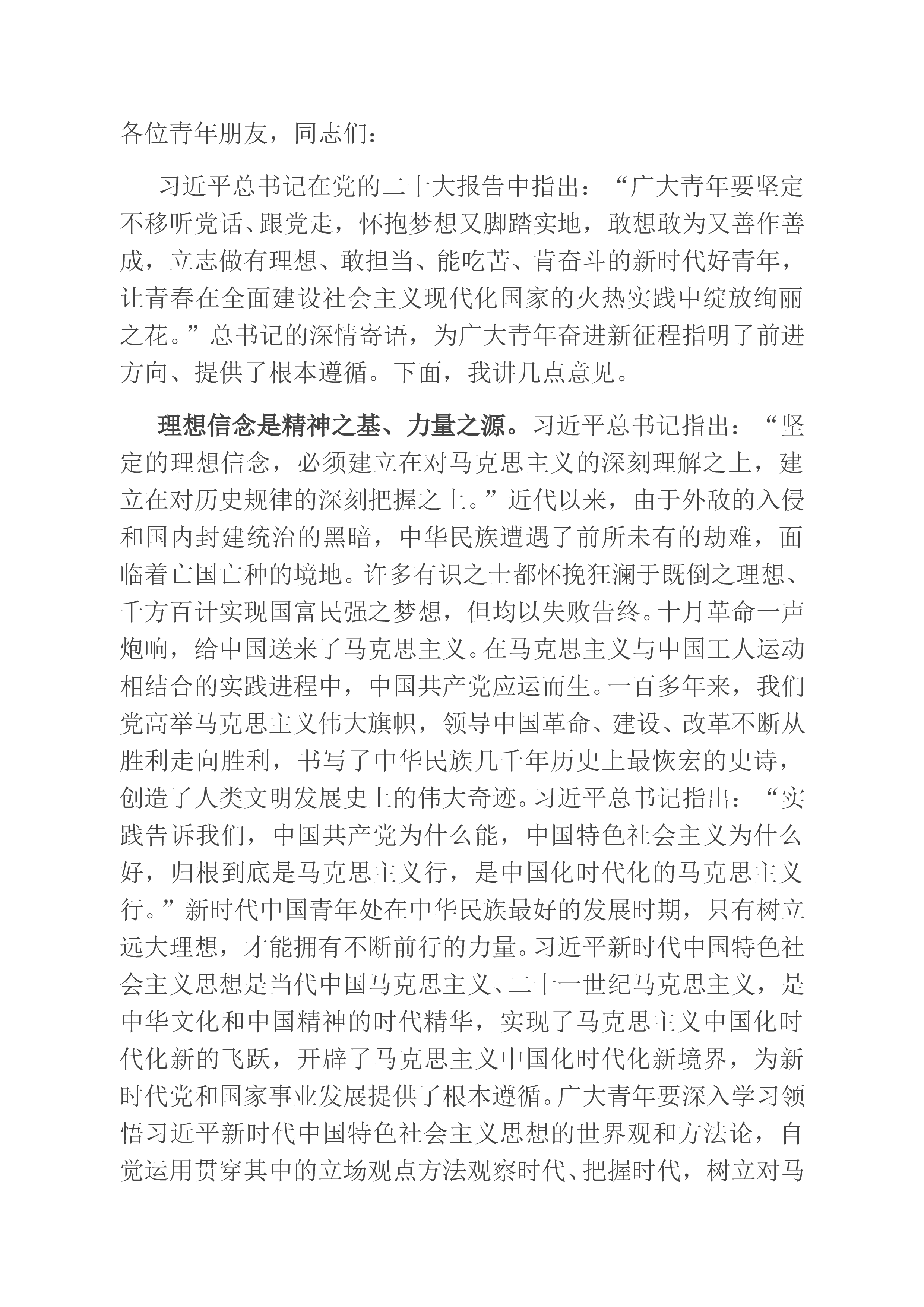 各位青年朋友,同志们:习近平总书记在党的二十大报告中指出:“广大青年要坚定不移听党话、跟党走,怀抱梦想又脚踏实地,敢想敢为又善作善成,立志做有理想、敢担当、能吃苦、肯奋斗的新时代好青年,让青春在全面建设社会主义现代化国家的火热实践中绽放绚丽之花。”总书记的深情寄语,为广大青年奋进新征程指明了前进方向、提供了根本遵循。下面,我讲几点意见。理想信念是精神之基、力量之源。习近平总书记指出:“坚定的理想信念,必须建立在对马克思主义的深刻理解之上,建立在对历史规律的深刻把握之上。”近代以来,由于外敌的入侵和国内封建统治的黑暗,中华民族遭遇了前所未有的劫难,面临着亡国亡种的境地。许多有识之士都怀挽狂澜于既...