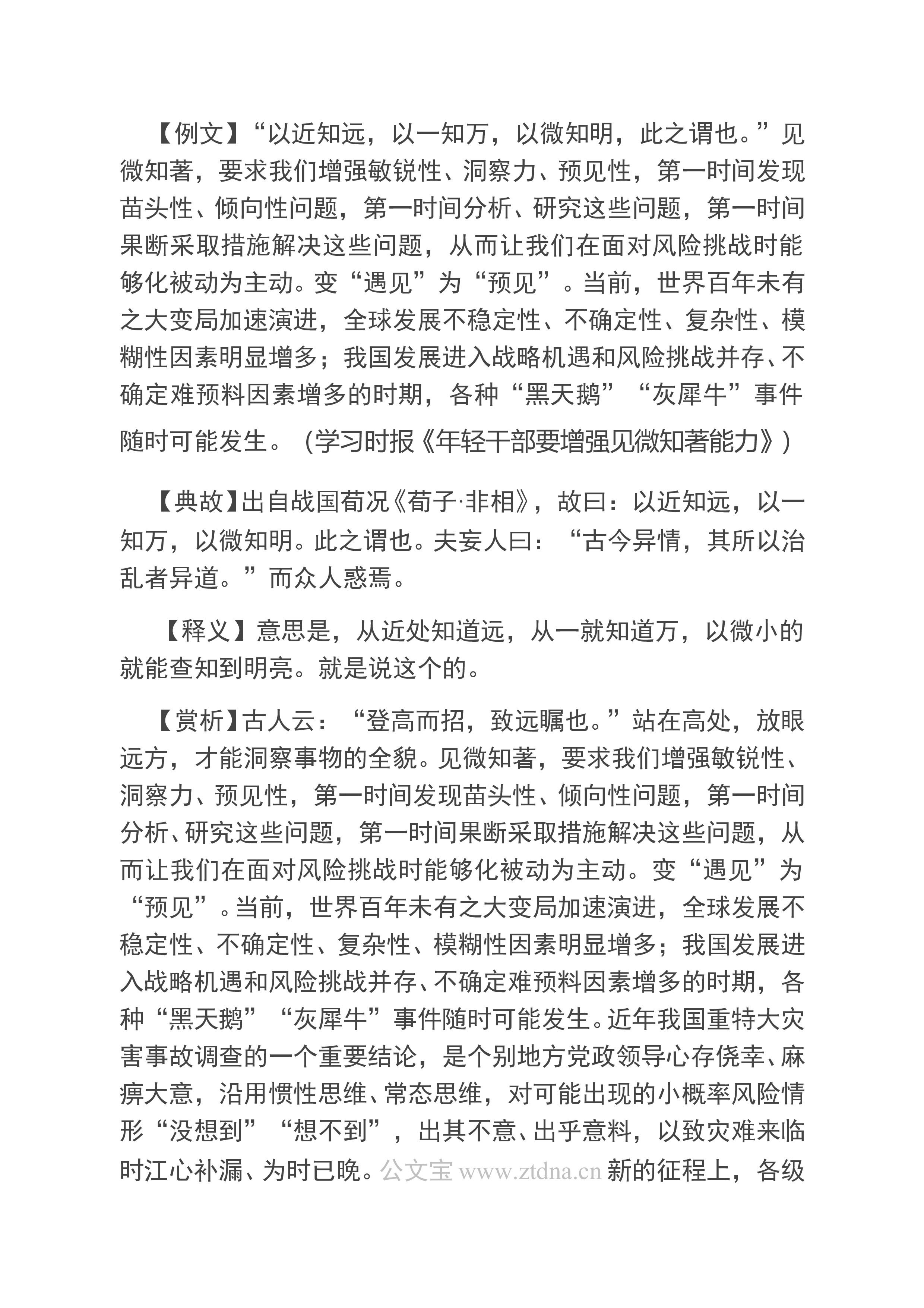 【例文】“以近知远,以一知万,以微知明,此之谓也。”见微知著,要求我们增强敏锐性、洞察力、预见性,第一时间发现苗头性、倾向性问题,第一时间分析、研究这些问题,第一时间果断采取措施解决这些问题,从而让我们在面对风险挑战时能够化被动为主动。变“遇见”为“预见”。当前,世界百年未有之大变局加速演进,全球发展不稳定性、不确定性、复杂性、模糊性因素明显增多;我国发展进入战略机遇和风险挑战并存、不确定难预料因素增多的时期,各种“黑天鹅”“灰犀牛”事件随时可能发生。(学习时报《