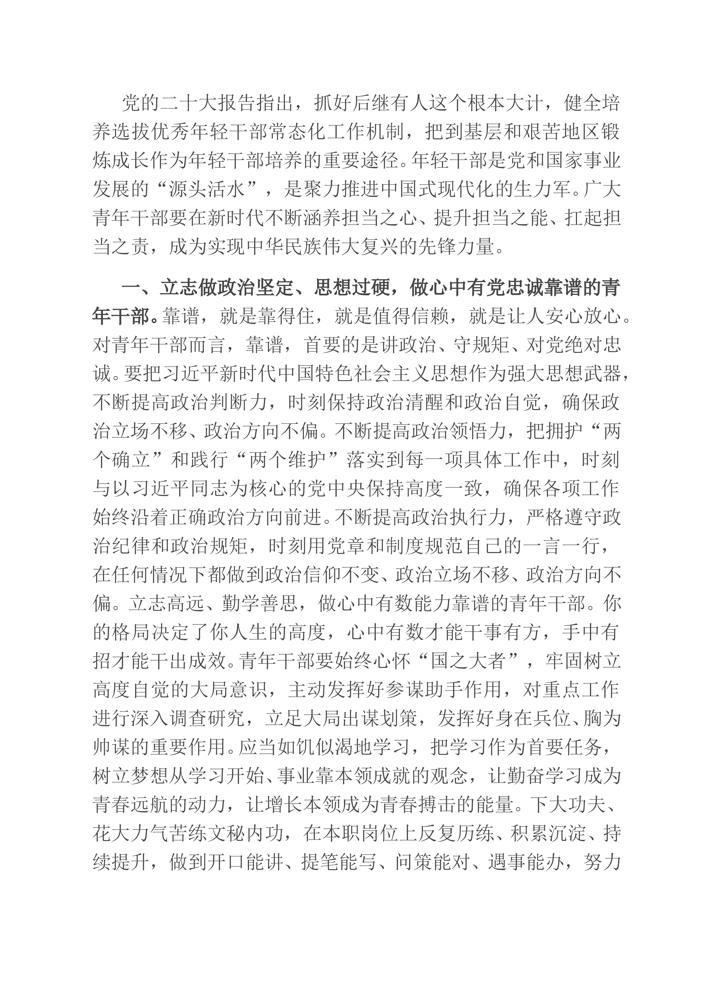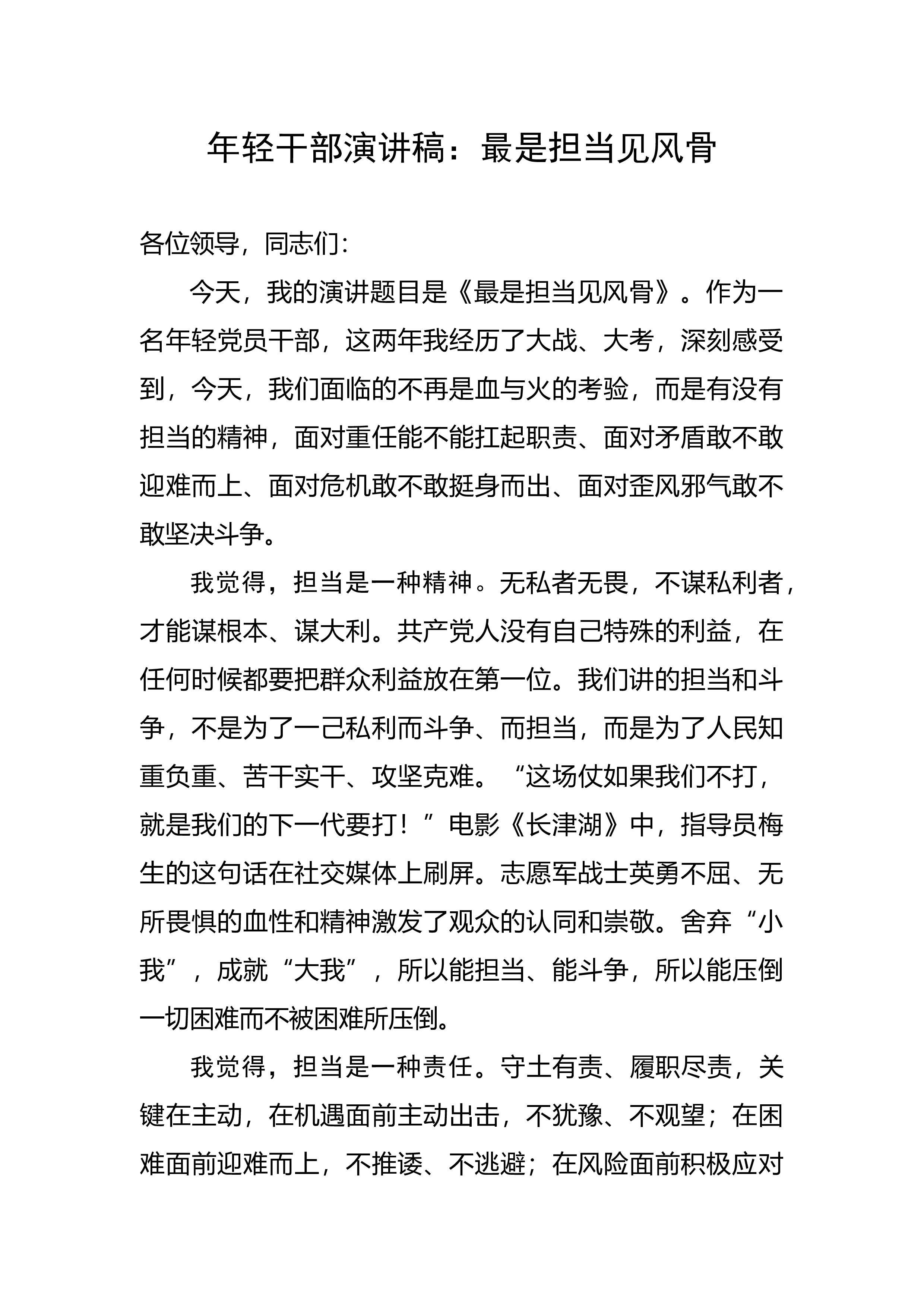 年轻干部演讲稿:最是担当见风骨各位领导,同志们:今天,我的演讲题目是《最是担当见风骨》。作为一名年轻党员干部,这两年我经历了大战、大考,深刻感受到,今天,我们面临的不再是血与火的考验,而是有没有担当的精神,面对重任能不能扛起职责、面对矛盾敢不敢迎难而上、面对危机敢不敢挺身而出、面对歪风邪气敢不敢坚决斗争。我觉得,担当是一种精神。无私者无畏,不谋私利者,才能谋根本、谋大利。共产党人没有自己特殊的利益,在任何时候都要把群众利益放在第一位。我们讲的担当和斗争,不是为了一己私利而斗争、而担当,而是为了人民知重负重、苦干实干、攻坚克难。“这场仗如果我们不打,就是我们的下一代要打!”电影《长津湖》中,指导...