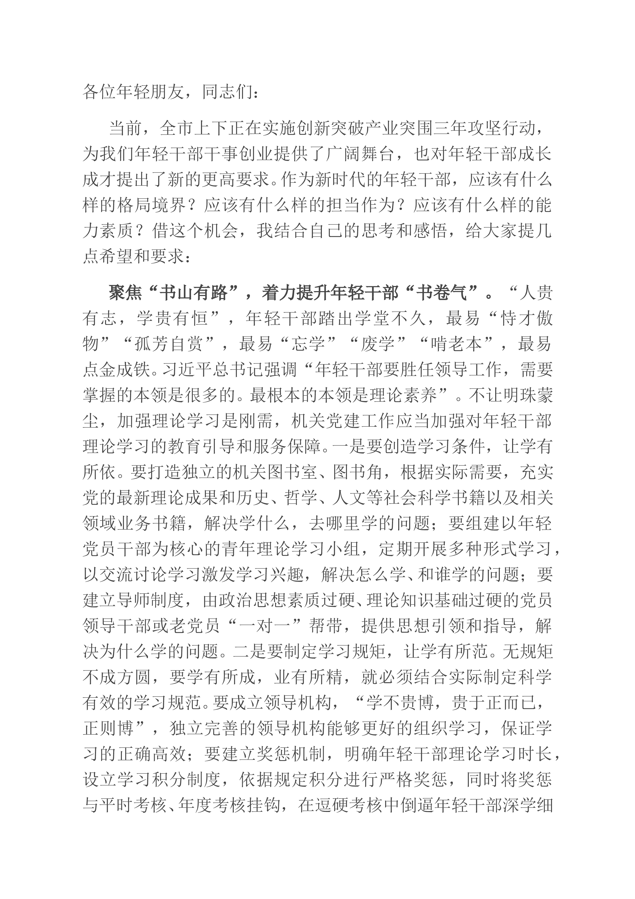 青年干部座谈交流发言:用实干诠释新时代青年的责任与担当党的二十大擘画了全面建设社会主义现代化国家、以中国式现代化全面推进中华民族伟大复兴的宏伟蓝图。《求是》杂志发表习近平总书记重要文章《全党必须完整、准确、全面贯彻新发展理念》。文章指出:各级党组织和领导干部要有很强的责任意识,守土有责、守土负责、守土尽责,无论什么时候,该做的事,知重负重、攻坚克难,顶着压力也要干;该负的责,挺身而出、冲锋在前,冒着风险也要担。新征程新使命对党员干部的精神状态、能力素质、作风形象提出了新的更高要求。年轻干部是推动各项事业发展的生力军,实现新时代新征程各项目标任务,年轻干部重任在肩,唯有冲锋在前,勇于担当作为,方...