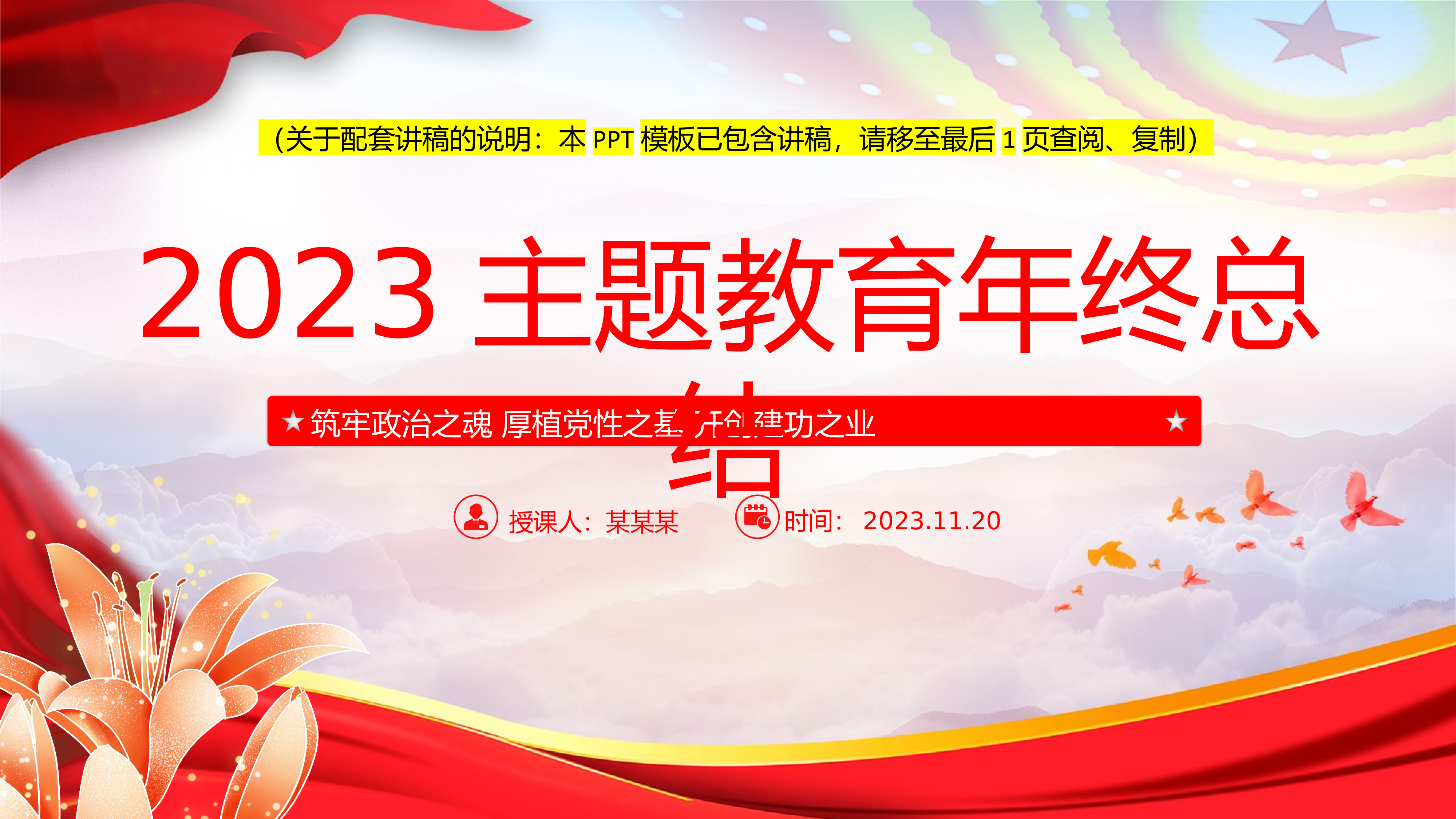 感谢您下载党支部平台上提供的PPT作品,为了您和党支部以及原创作者的利益,请勿复制、传播、销售,否则将承担法律责任!党支部将对作品进行维权,按照传播下载次数进行十倍的索取赔偿!ztppt.com授课人:某某某时间:2023.11.20筑牢政治之魂厚植党性之基开创建功之业2023主T教育